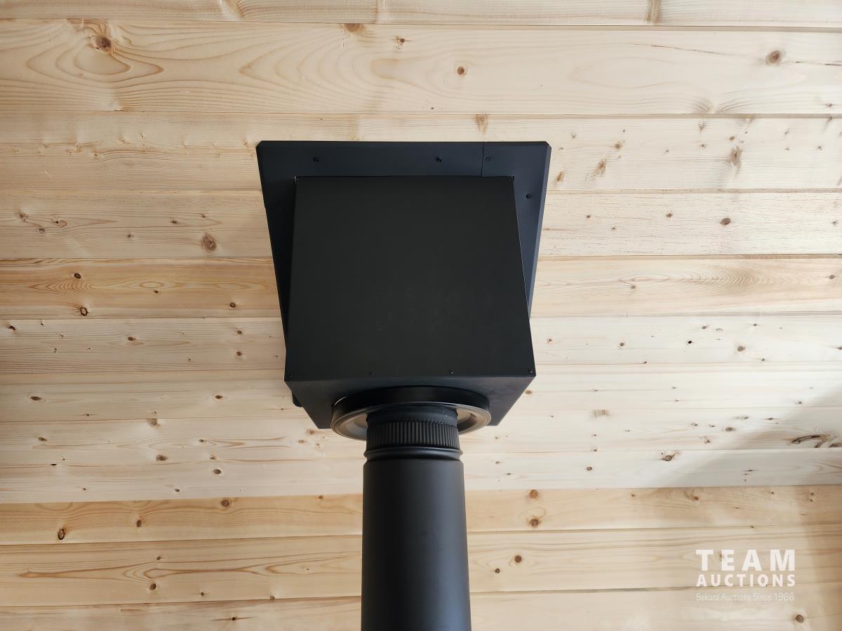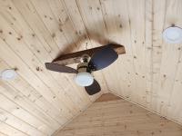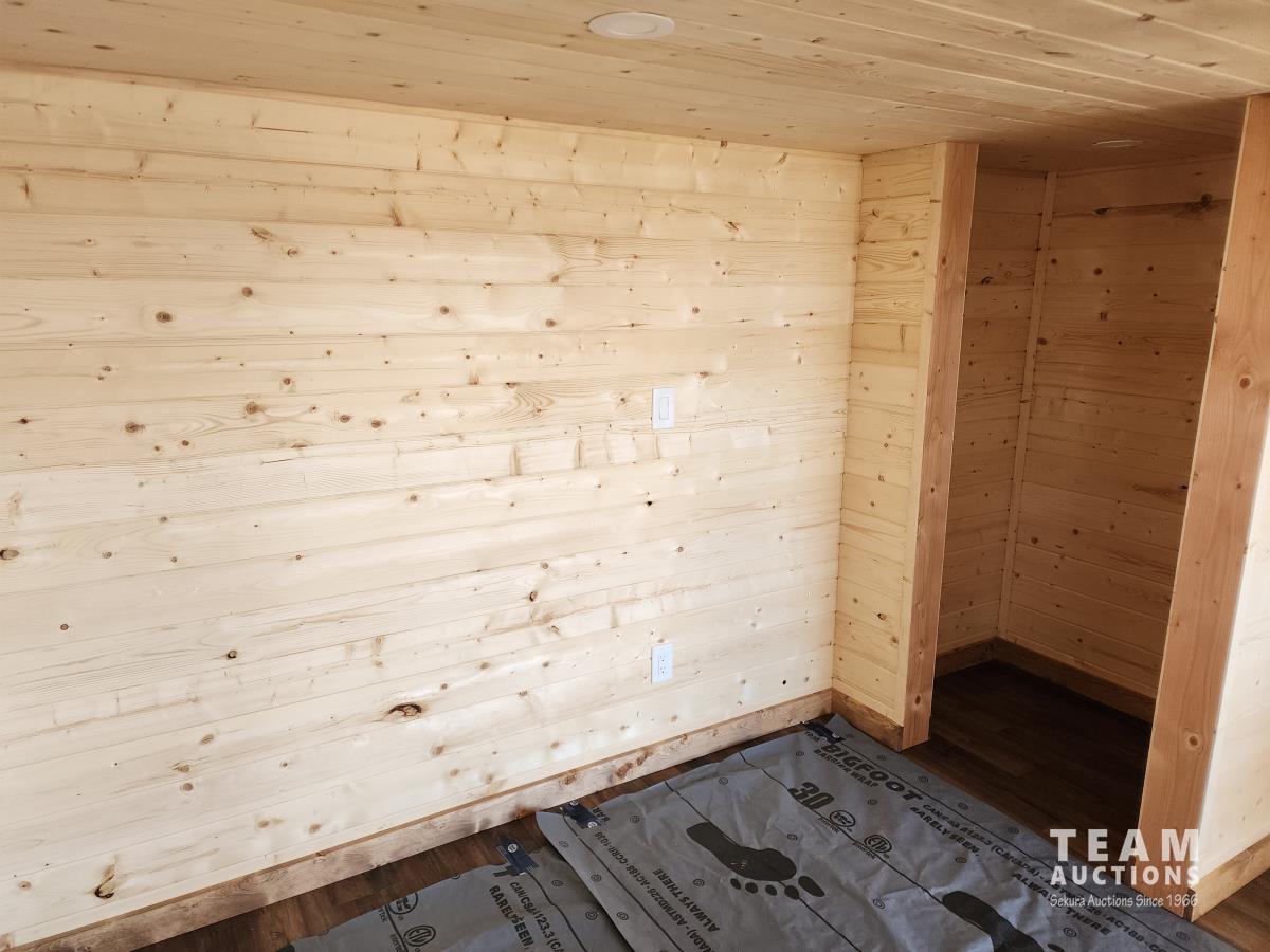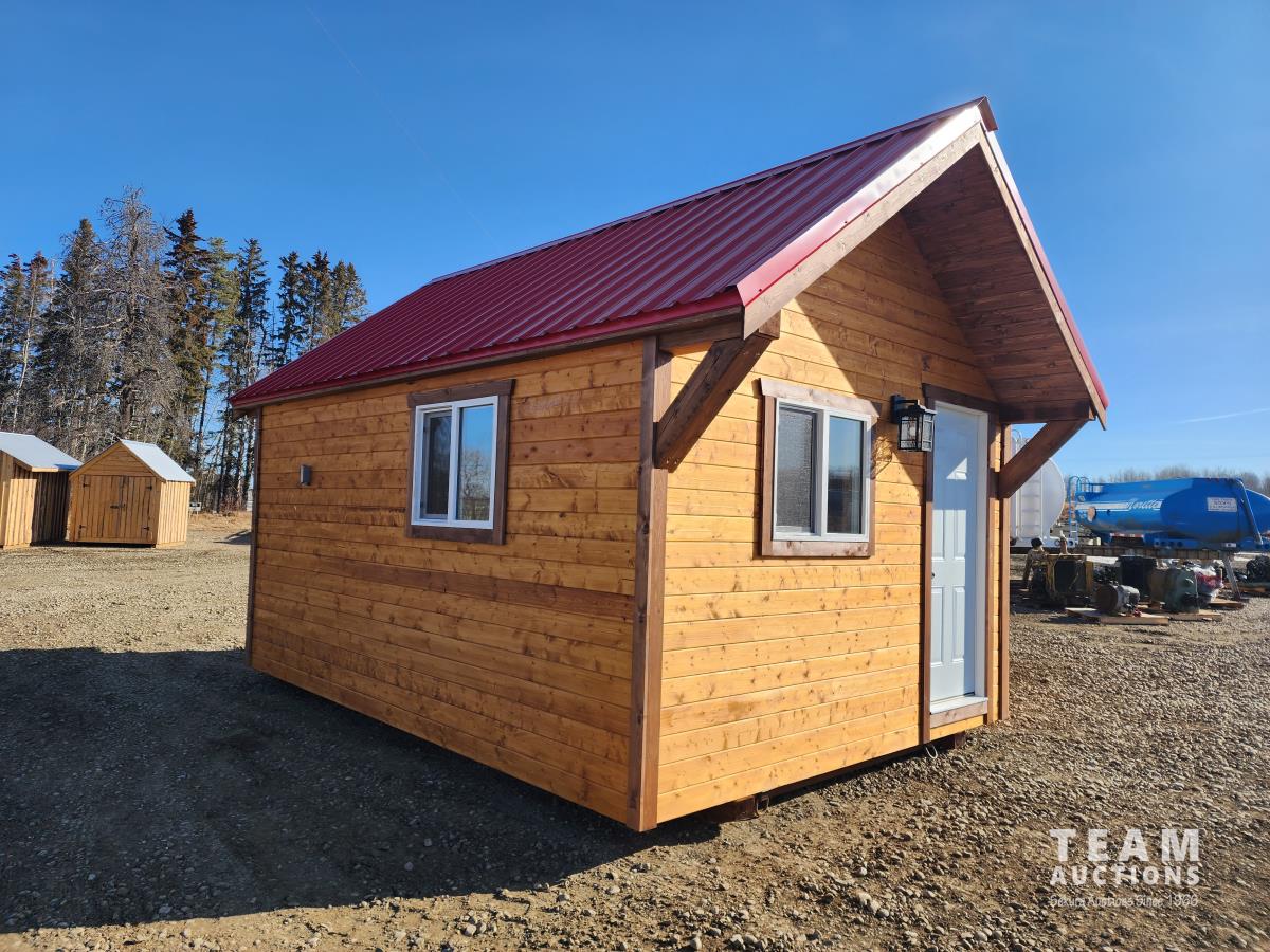 2X6 structure, skid mounted, metal roof, 1X6 tongue and groove, Sico stain, fully insulated, 1X6 pine finish, 6X12 loft with ladder, vinyl flooring, (2) windows, ceiling fan, wood stove, 3X3 bathroom corner, future kitchen rough in, 100 amp electrical panel, pot lights