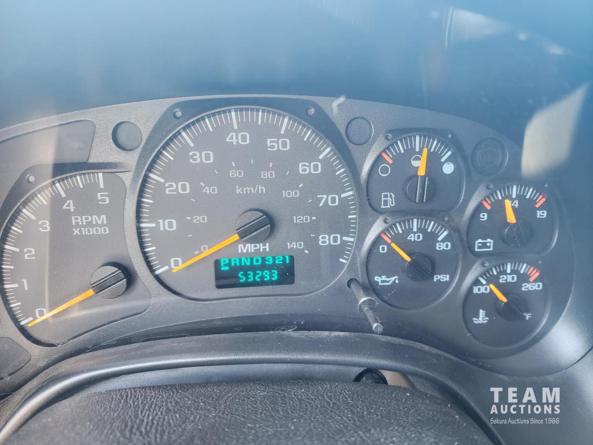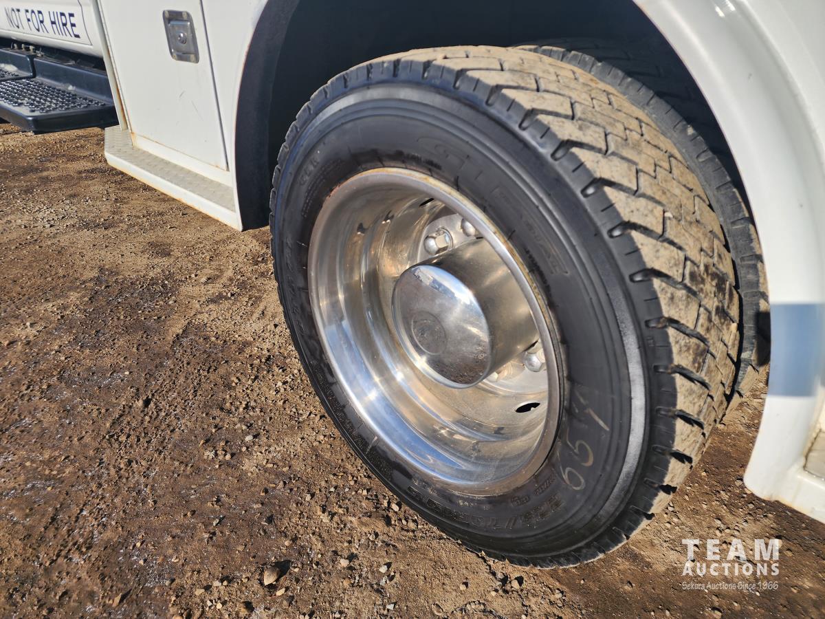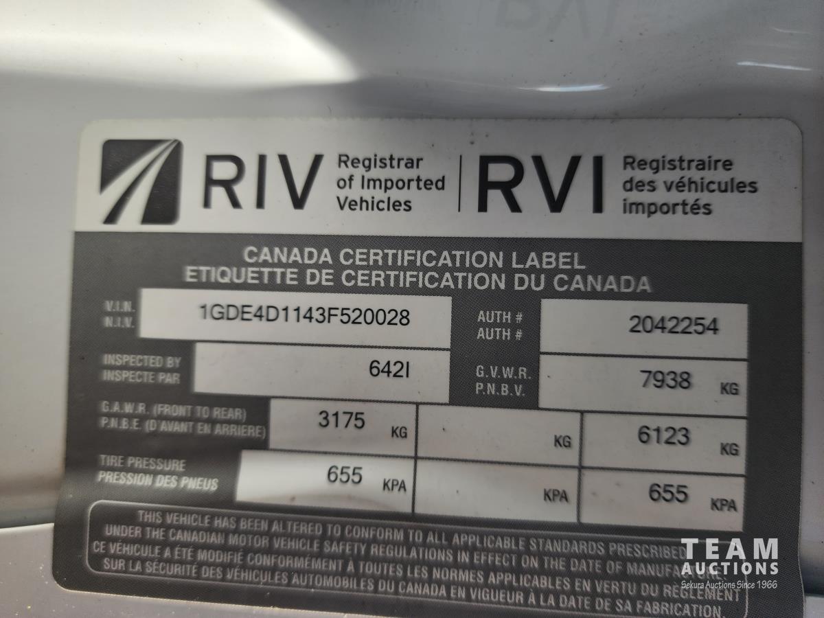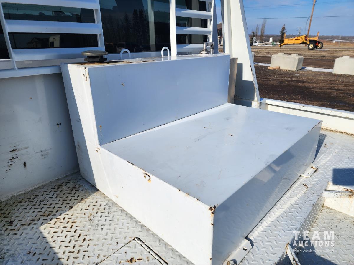 Duramax 6.6 L V8 diesel engine, Allison automatic transmission, A/C, leather interior, stereo, tool boxes, spring suspension, hydraulic brakes, P/W, P/L, steel deck 9ft (total length) x 8 ft 5 inch wide, extra fuel storage, interior fuel pump switch (on the fly fueling), 5th wheel hitch, rear trailer tow package with electric brake controller, 225/70R19.5 tires