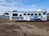 Front living quarters include solid wood Duster interior, full fridge with freezer (propane/electric), stove, microwave, king size master area with privacy door and storage cabinets, full bathroom with shower, cupboards have interior lighting, decorative rope lights, sleeps 5, A/C, furnace, stereo with speakers inside and outside, electric awning, setup for 110 power or 3000 watt generator, electric landing gear, solar panel on roof, rear area includes, 4 horse stalls with dividers, feed bunks double as waterers, full floor rubber matting, drop down windows with bars, exterior LED lighting, hay pod on roof, (2) tack areas with saddle stands, spring suspension, 99 inch wide, spare tire, 235/85R16 tires