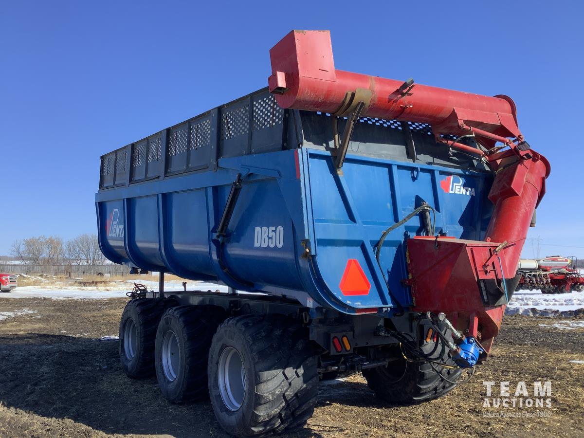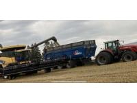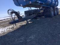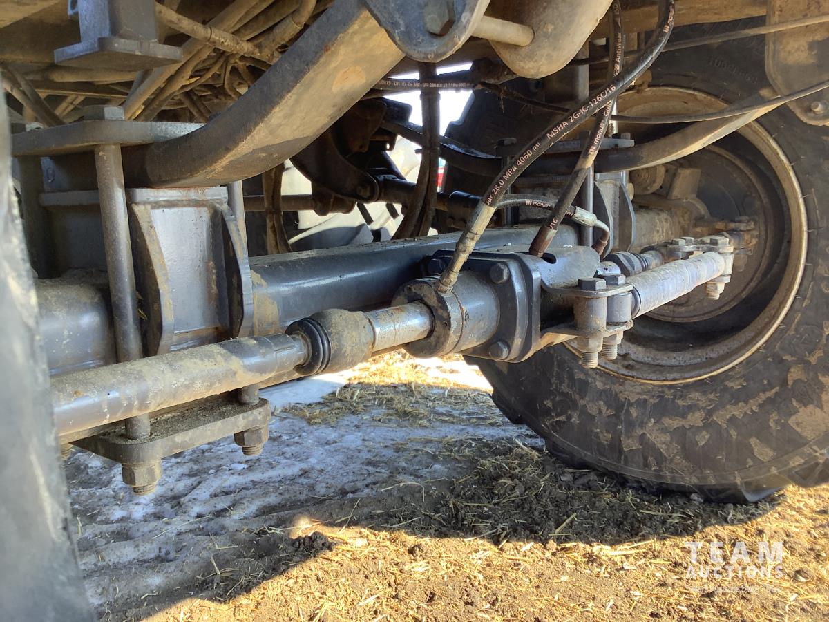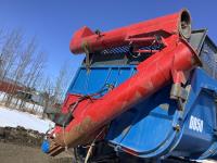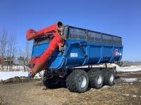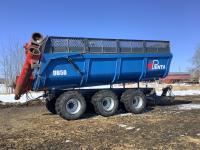 front and rear axle steering, spring suspension, hydraulic brakes on all 6 wheels, telescopic hoist, rear hydraulic lift end gate with grain chute, removable silage extensions, plus c/w custombuilt 20-inch hydraulic drive rear mount grain unloading auger that is set up to come on and off the trailer in minutes