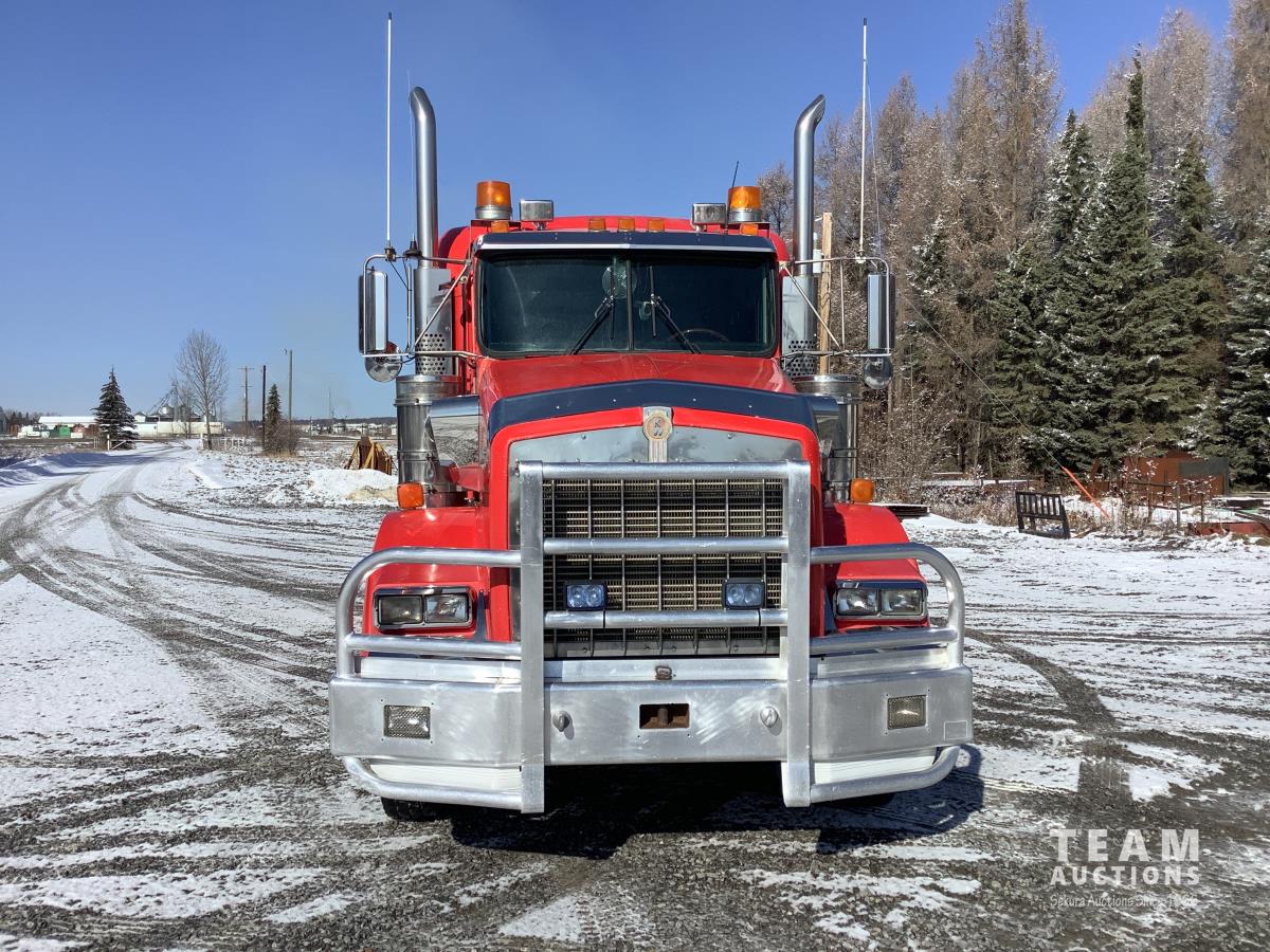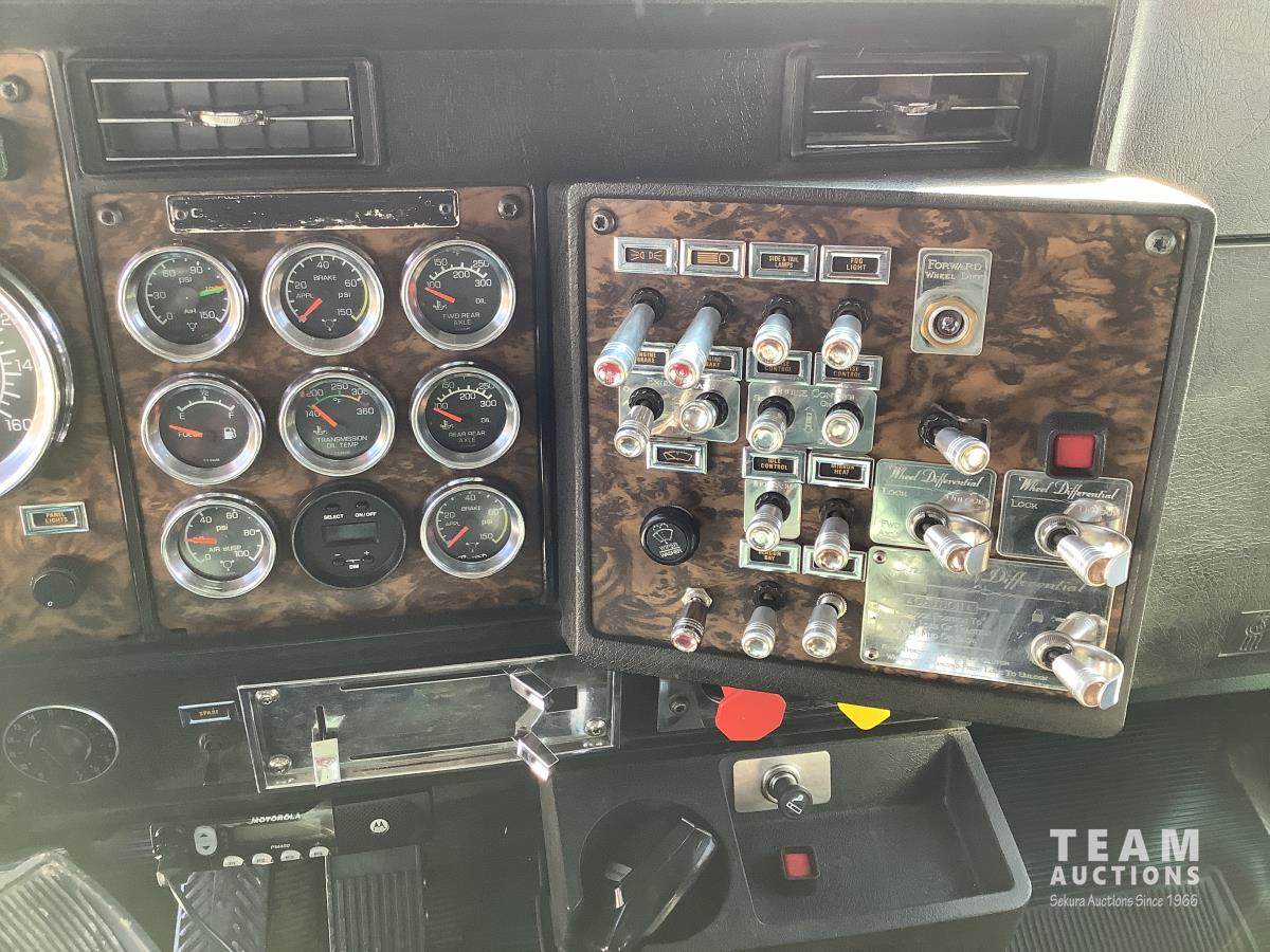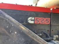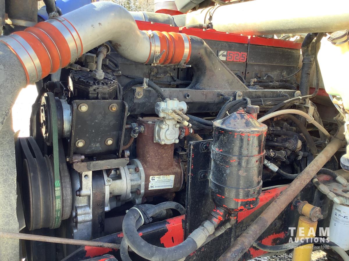 Cummins N14 525 HP engine, engine brake, Eaton Fuller 18 speed transmission, integral 28 inch sleeper, aluminum moose bumper, beacons, 15 ft steel box, roll tarp, rear pintle hitch with trailer air brake control to the rear, Henderson air ride suspension, 13,000 lb front axle, 46,000 lb rear axles, full lockers, all aluminum wheels, 11R24.5 tires