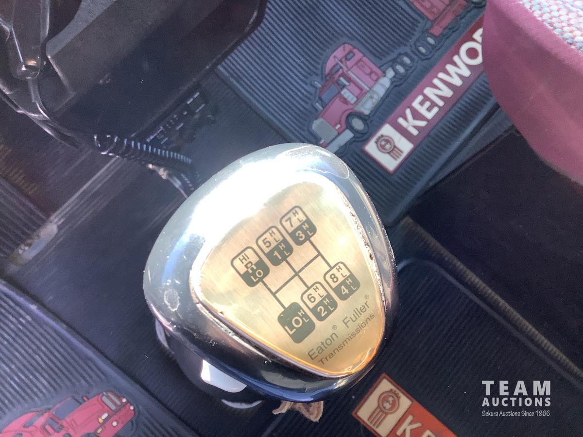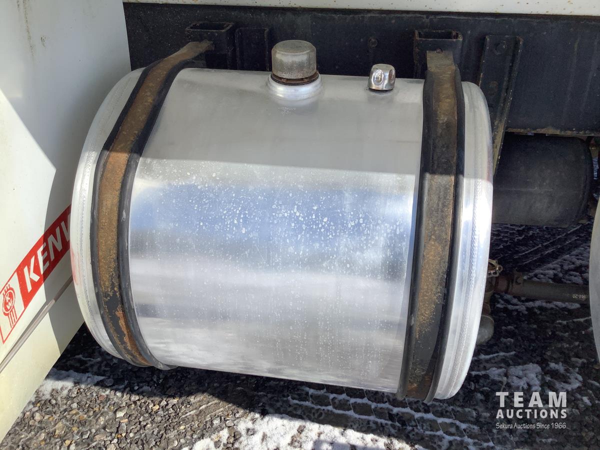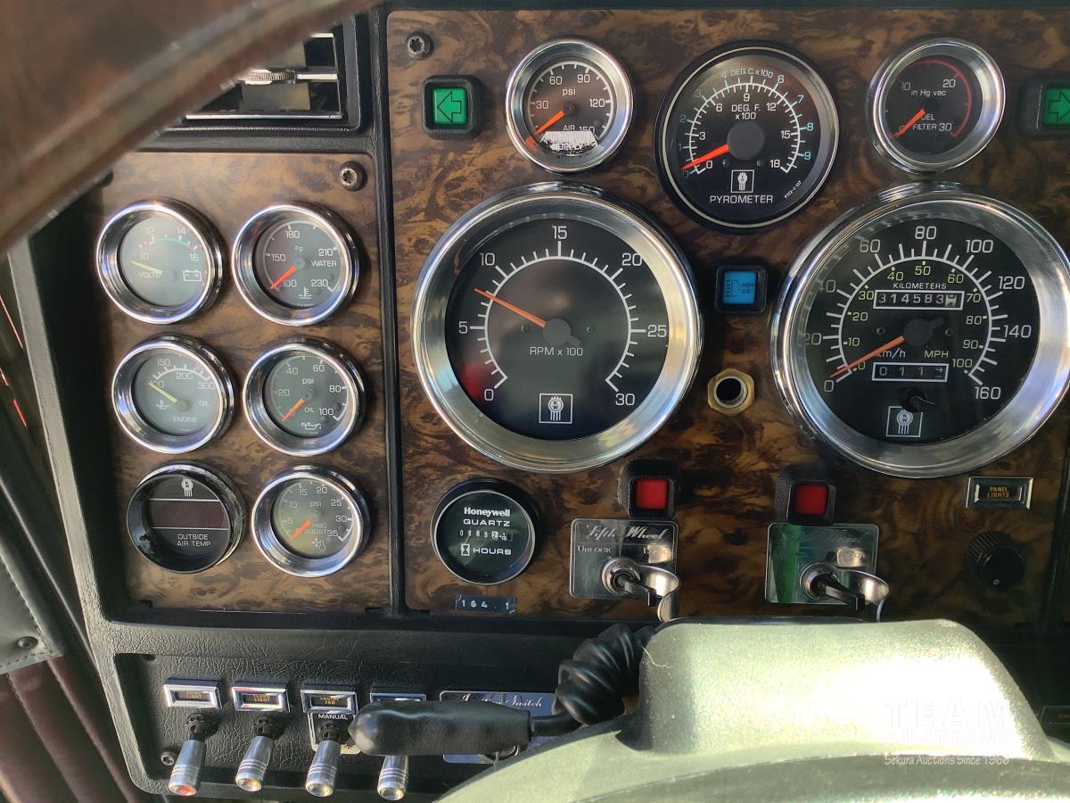 Cummins N14 525 HP engine, engine brake, Eaton Fuller 18 speed transmission, integral 28 inch sleeper, aluminum moose bumper, beacons, 15 ft steel box, roll tarp, rear pintle hitch with trailer air brake control to the rear, Henderson air ride suspension, 13,000 lb front axle, 46,000 lb rear axles, full lockers, all aluminum wheels, 11R24.5 tires