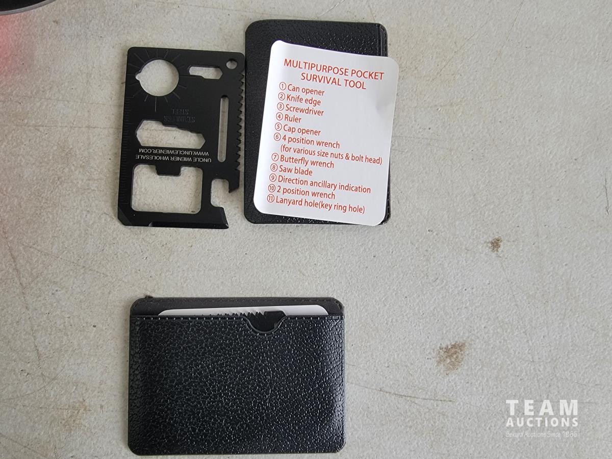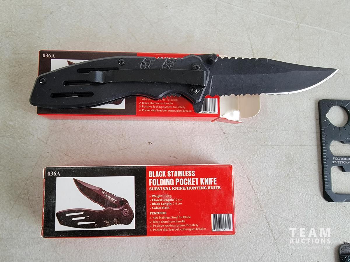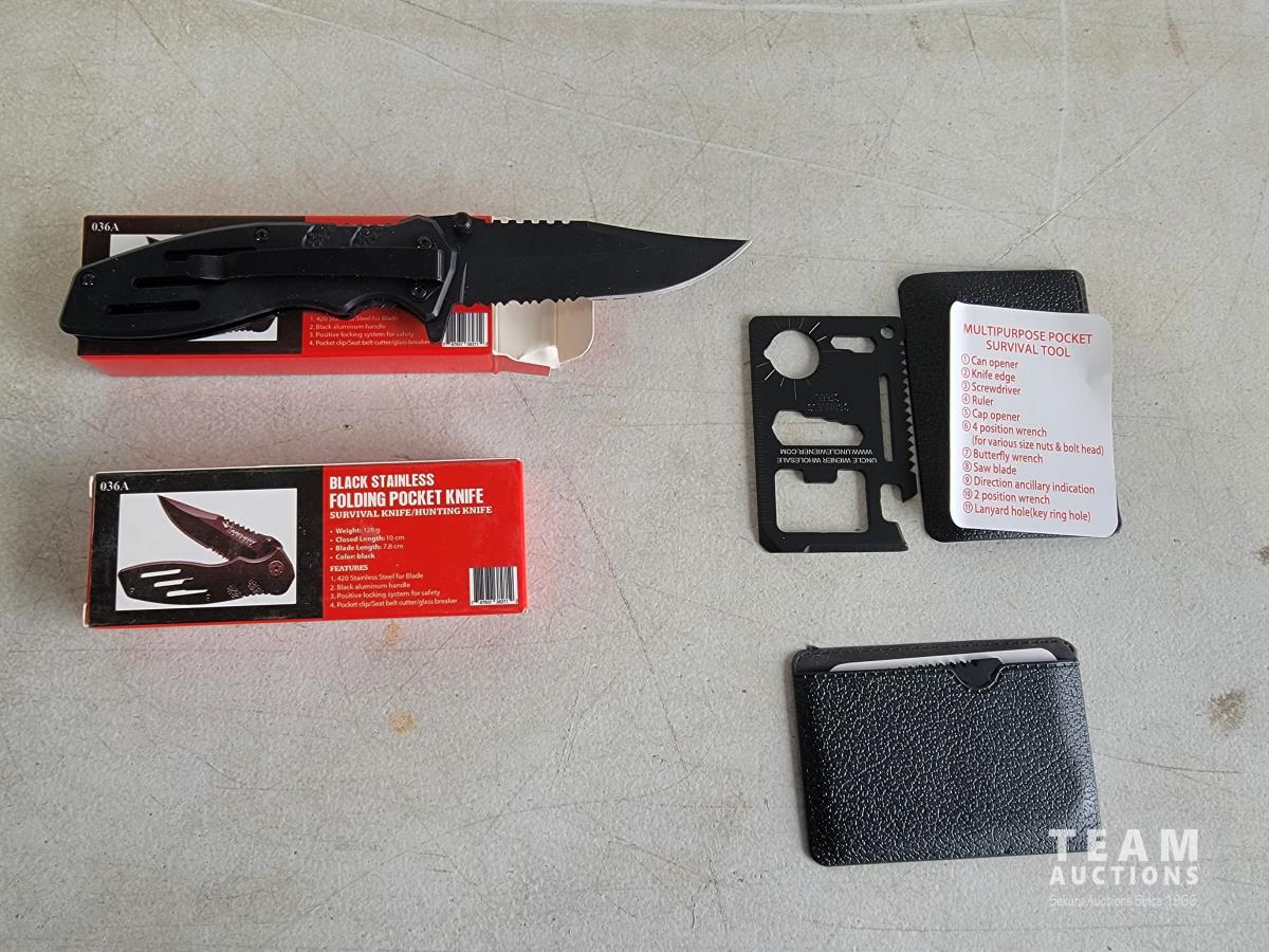 2196 (2) Black Stainless Folding Pocket Knives and (2) Multipurpose Pocket Survival Tool (Unused)