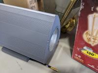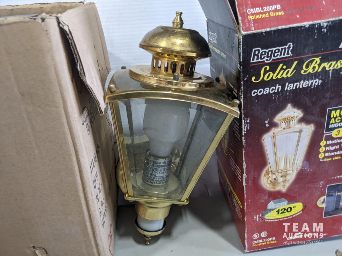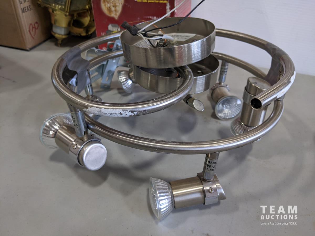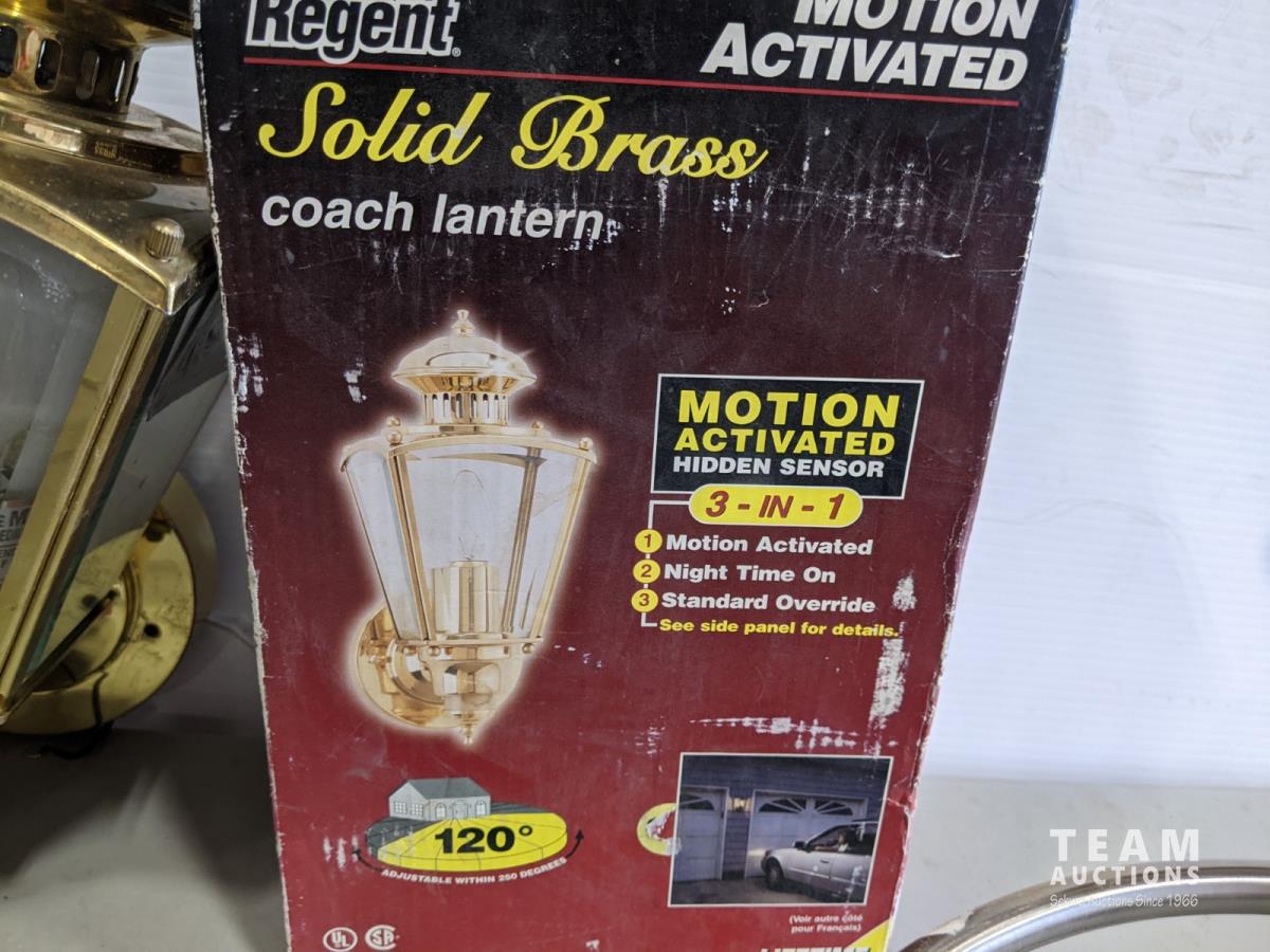 1884 (2) LED Hard Wired Light, (2) Brass Motion Detection Light and (2) Brushed Nickel Round Lights