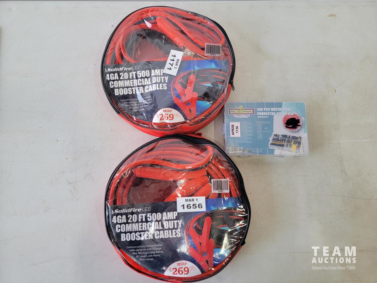 1940 (2) Solidfire 4 Ga 20Ft 500Amp Commercial Duty Booster Cables and 240 Piece Waterproof Connector Set (Unused)