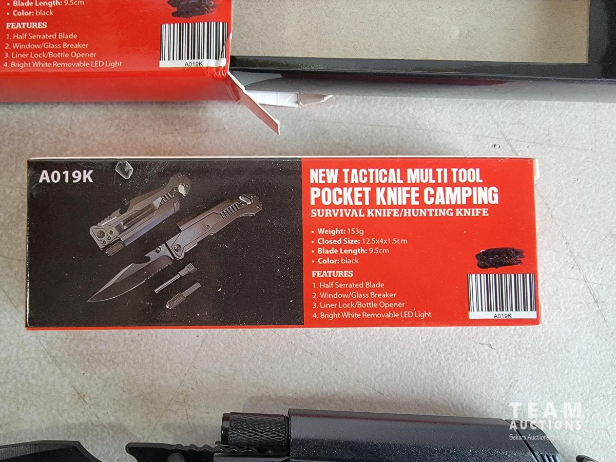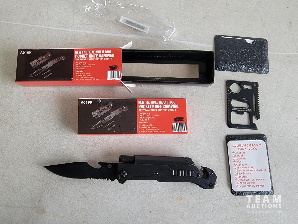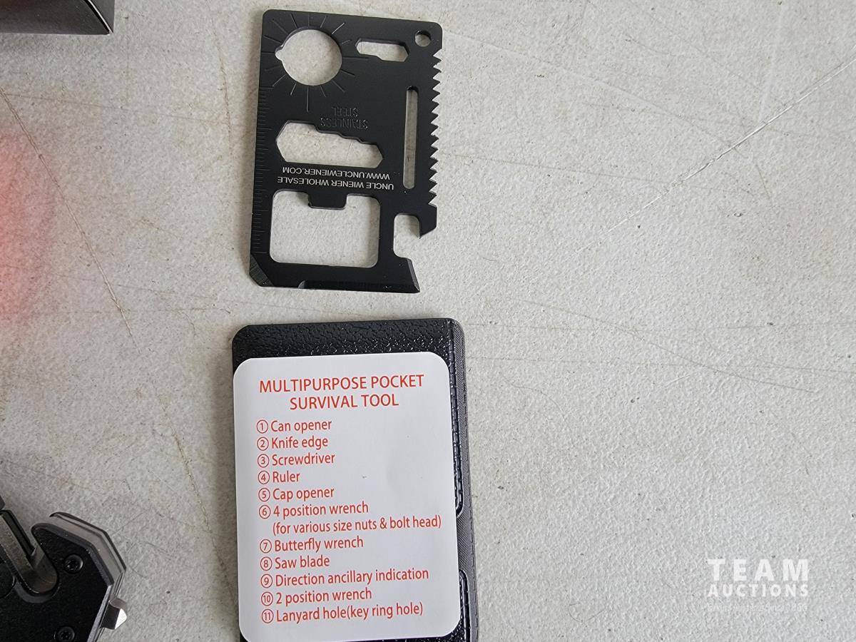 2200 (2) Tactical Multi-Tool Pocket Knives and (2) Multipurpose Pocket Survival Tool (Unused)