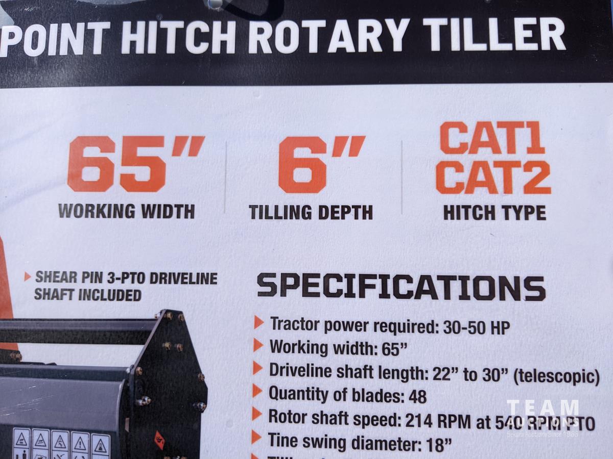 30-50 HP tractor, 6 inch tilling depth, PTO shaft included, category 1 & 2 hookup