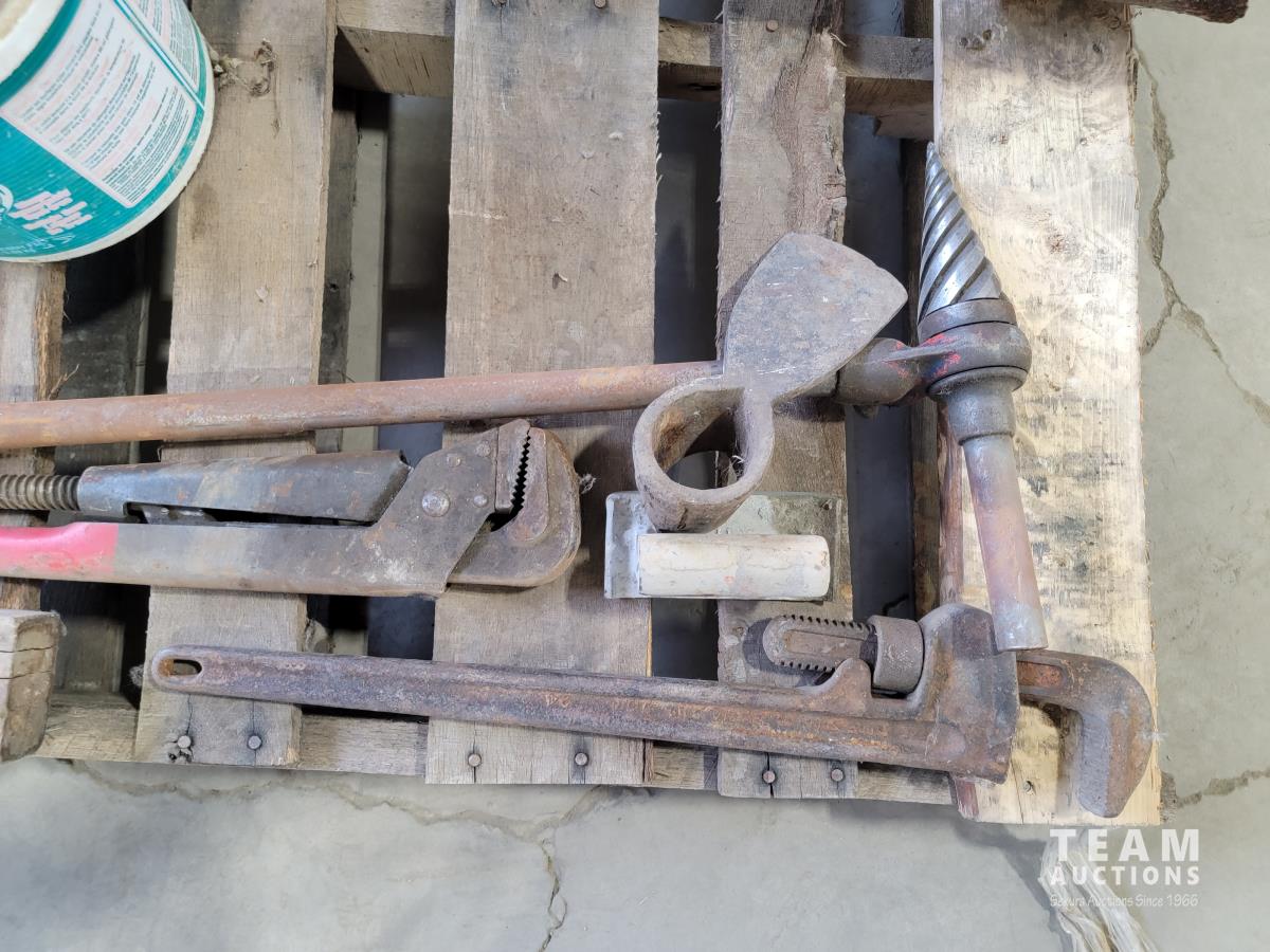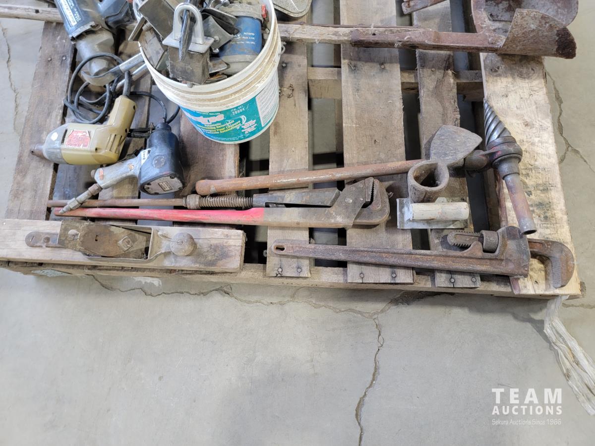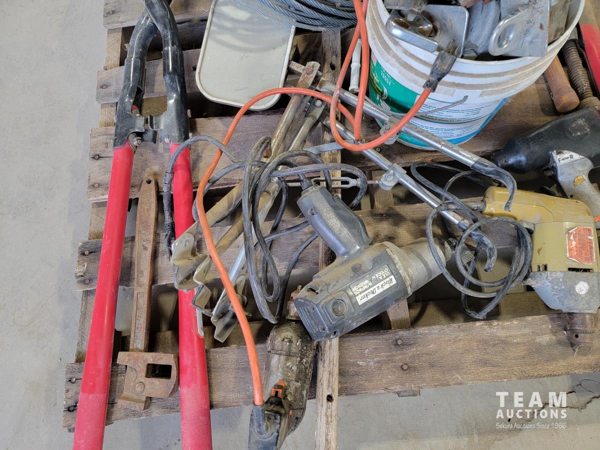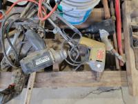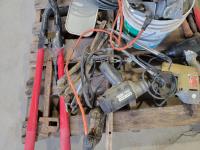 Various antique hand tools, planer, post hole digger, wire cable, pipe flange, air tools and corded power tools
