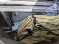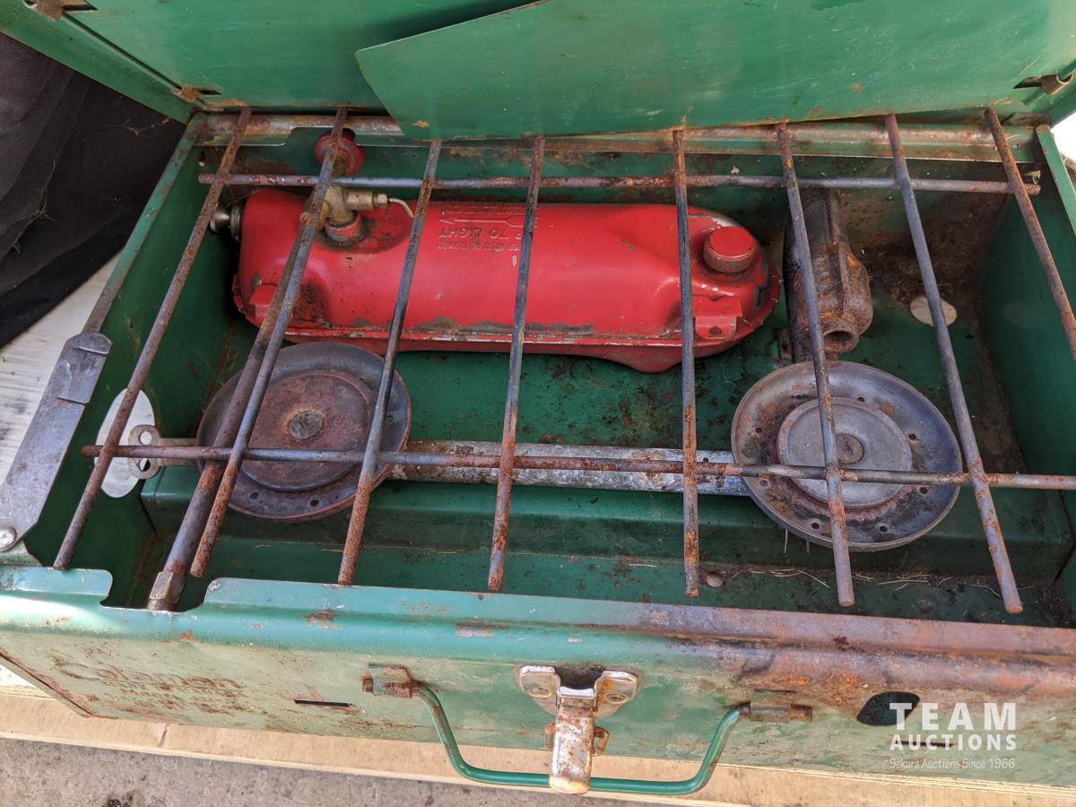 Camp kitchen in bag, enamel dishes and camp stove