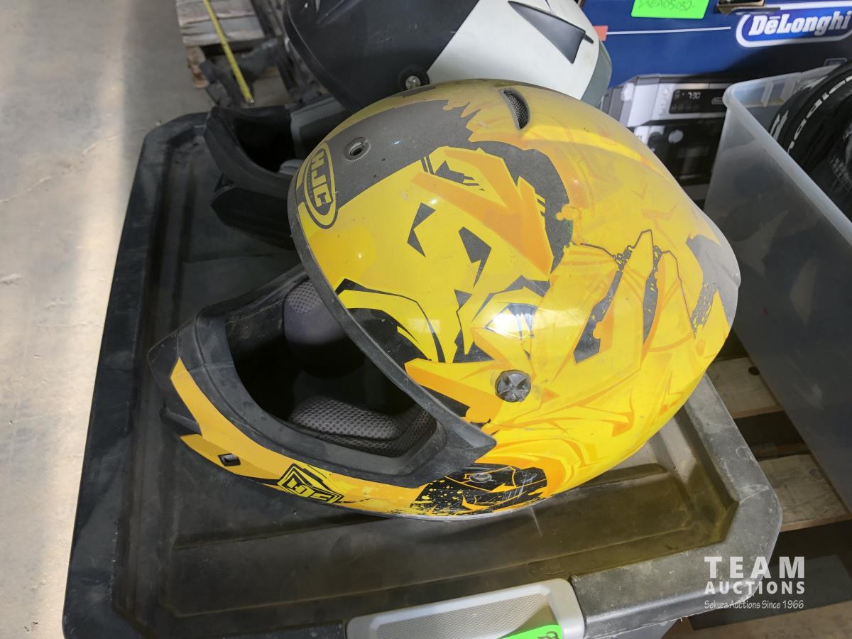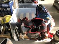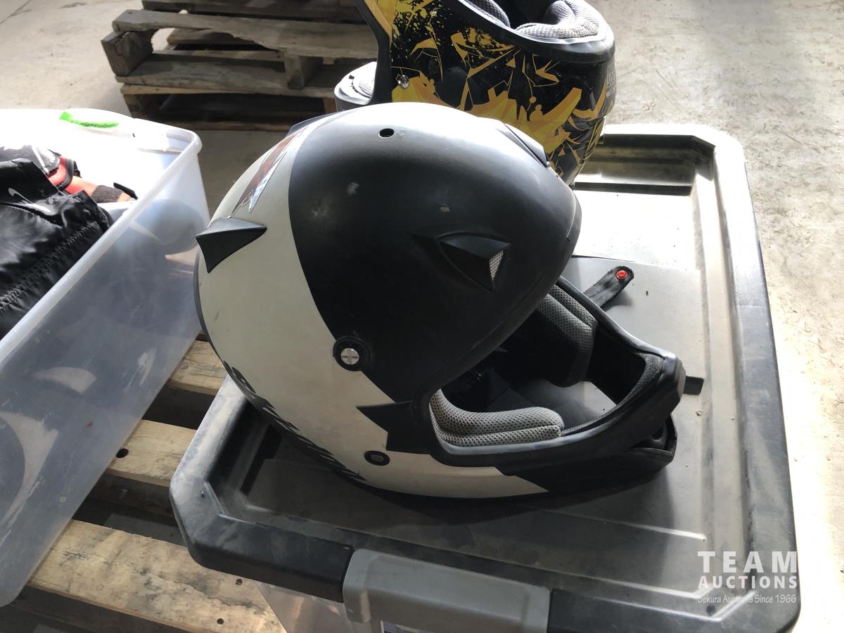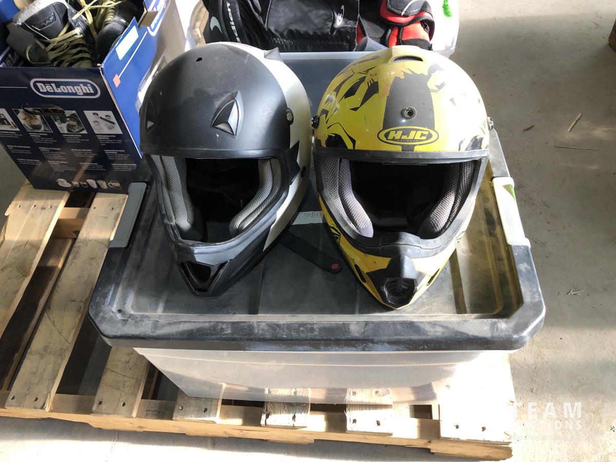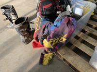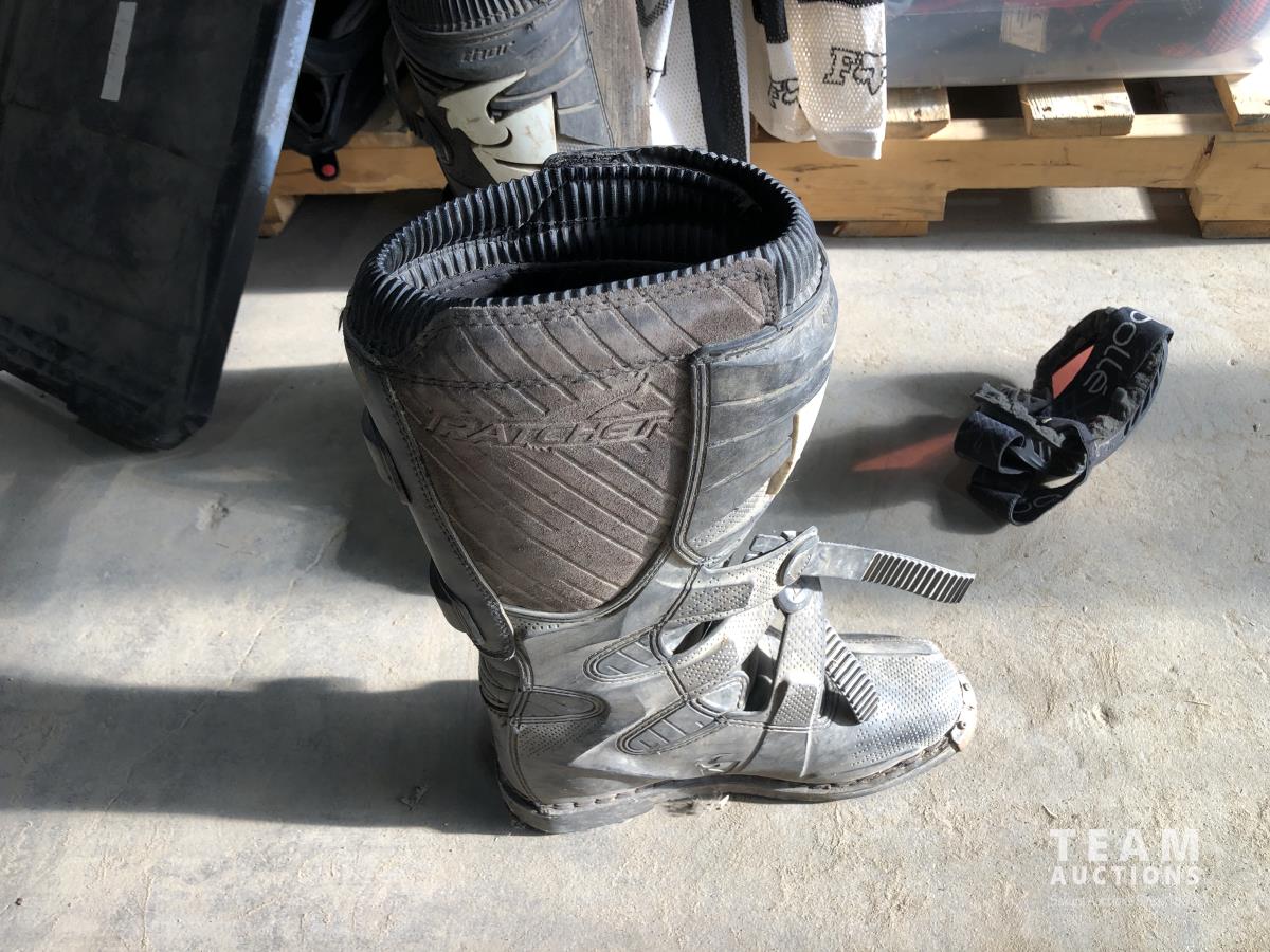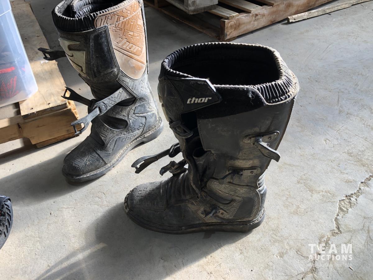 (1) HJC helmet size small, (1) Ski-doo helmet size large, (1) pair of Thor Ratchet boots euro size 42, (1) pair of Thor boots size unknown, pants, chest protector, gloves and goggles