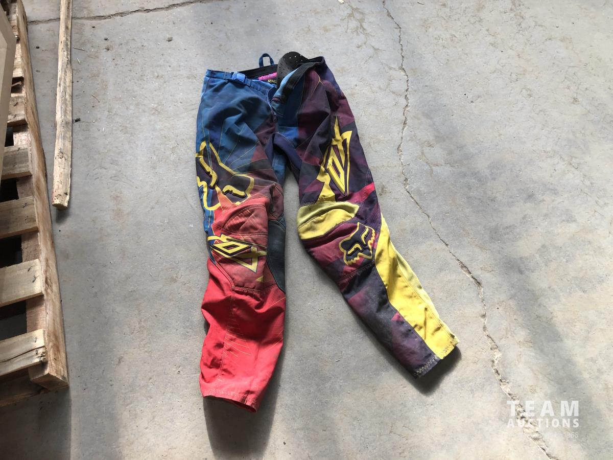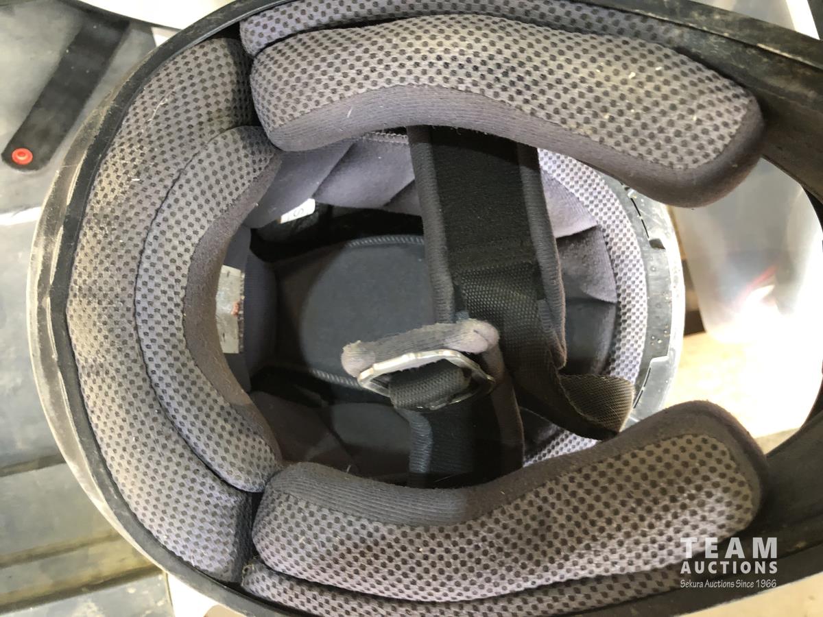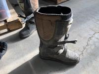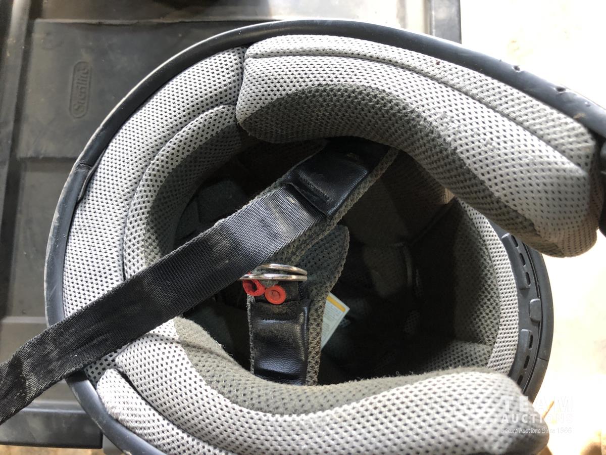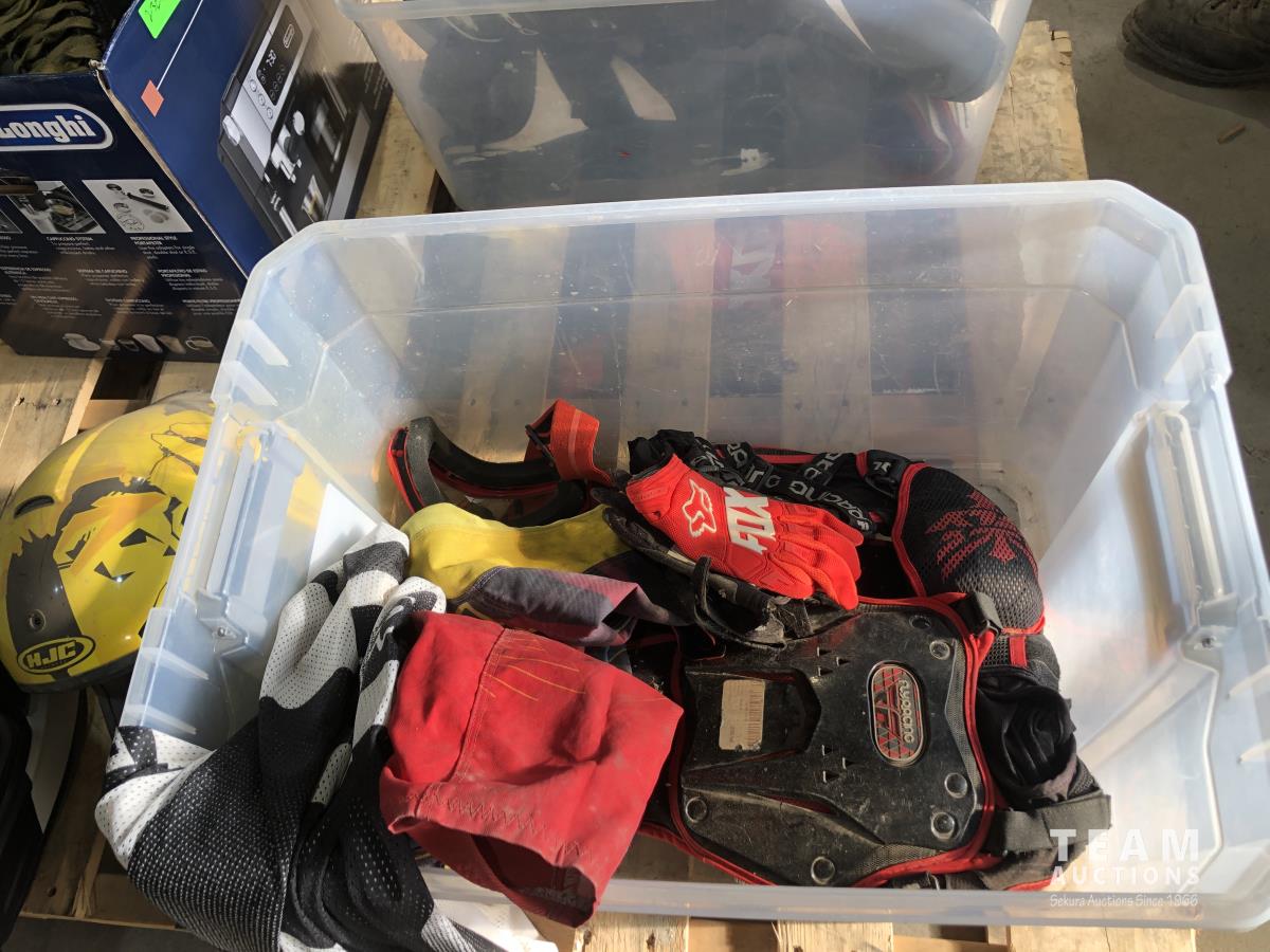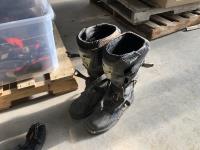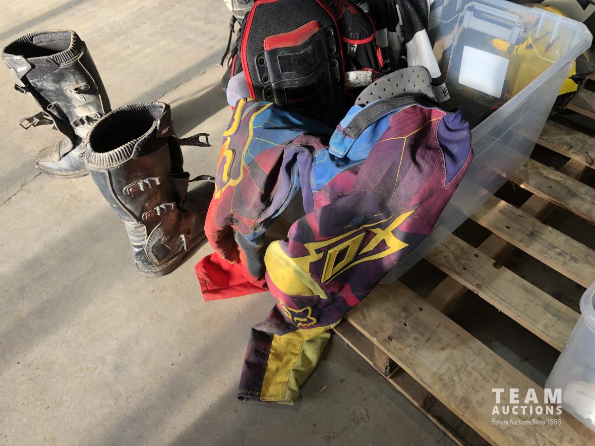 (1) HJC helmet size small, (1) Ski-doo helmet size large, (1) pair of Thor Ratchet boots euro size 42, (1) pair of Thor boots size unknown, pants, chest protector, gloves and goggles