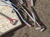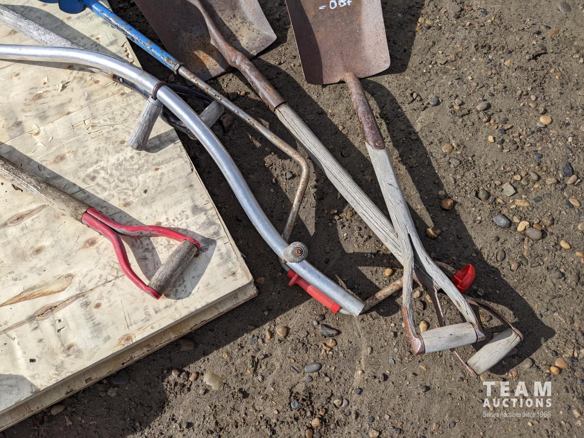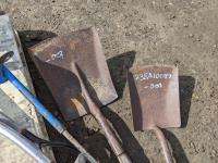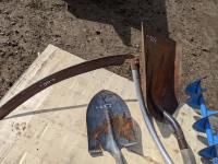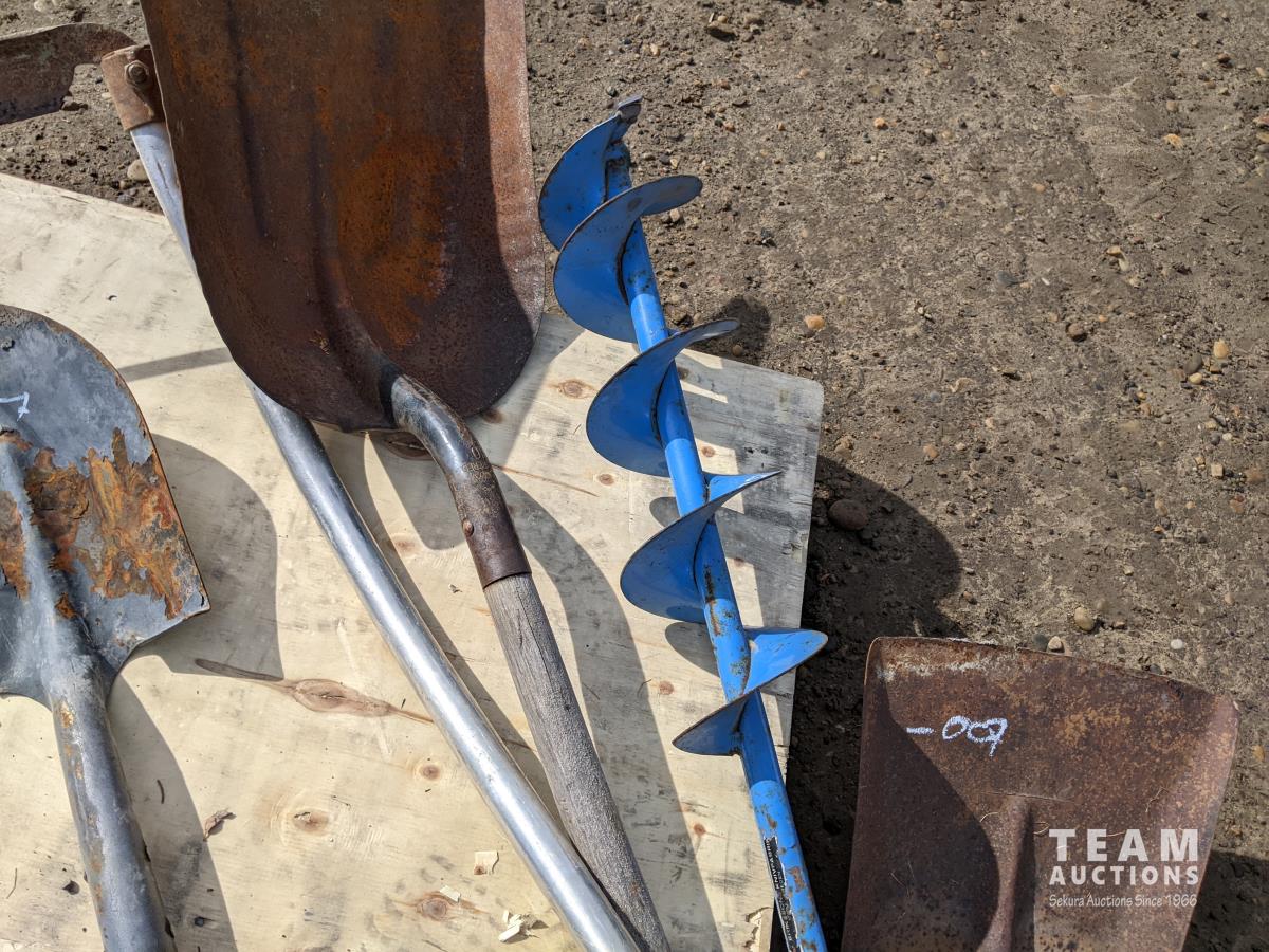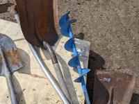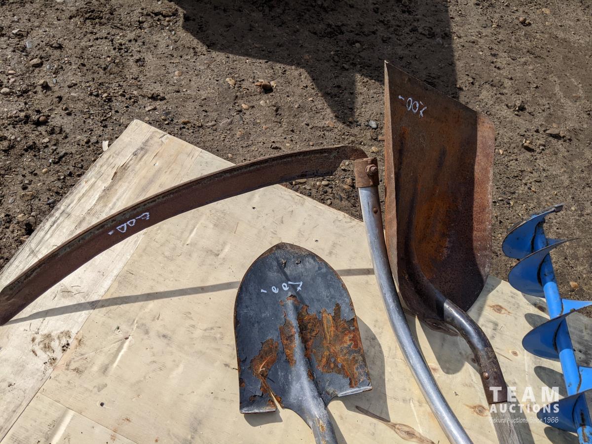 (4) shovels, auger and scythe long handle
