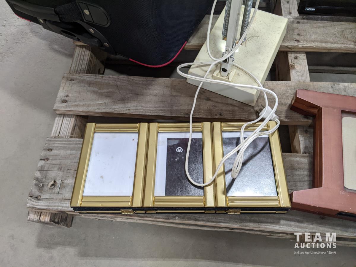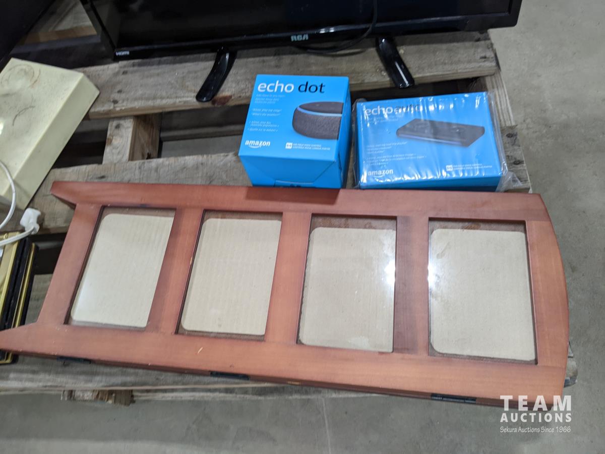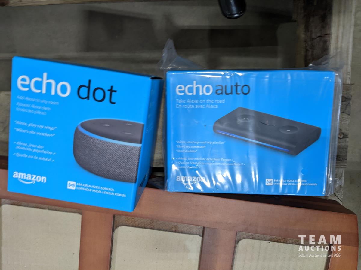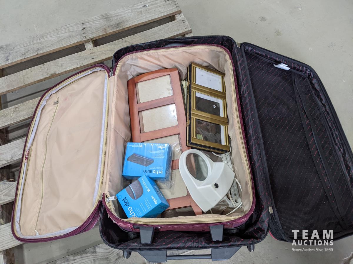 suitcases, magnifying glass, picture frame, Echo dot and Echo auto