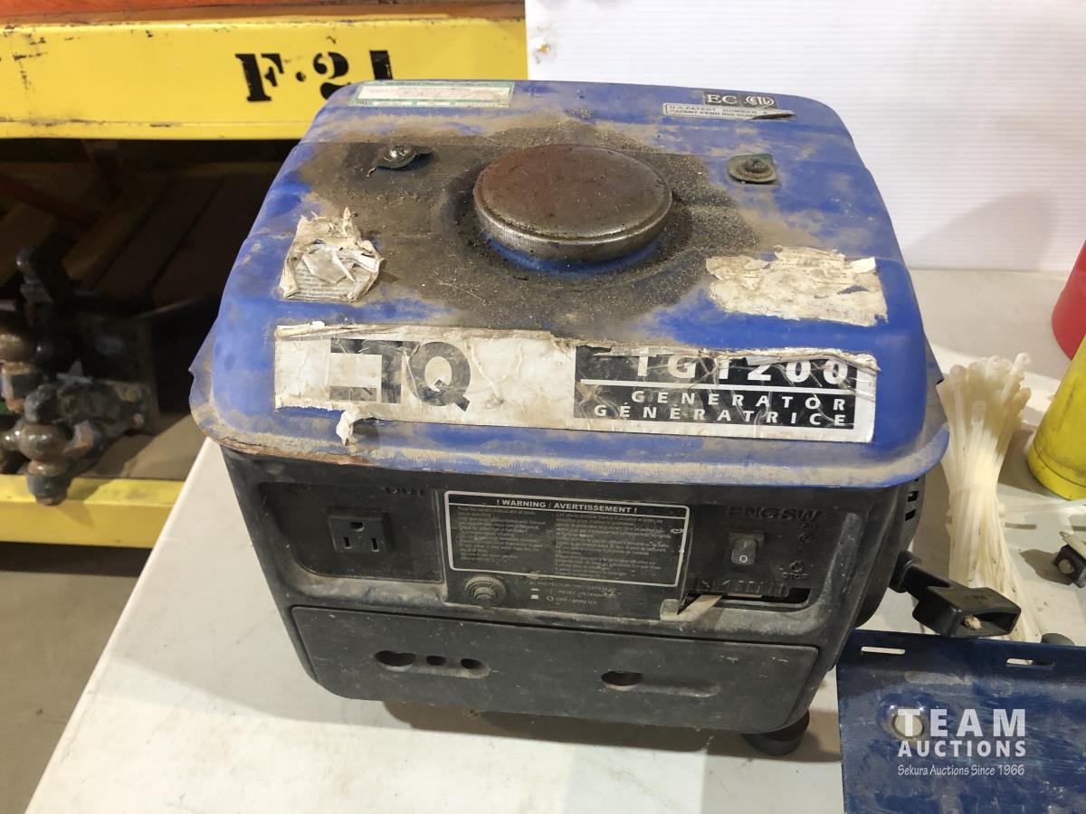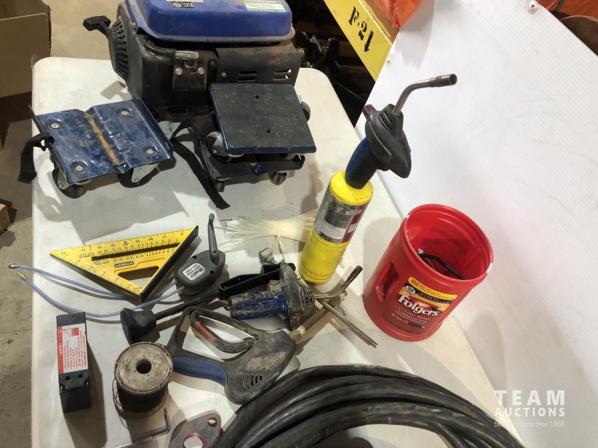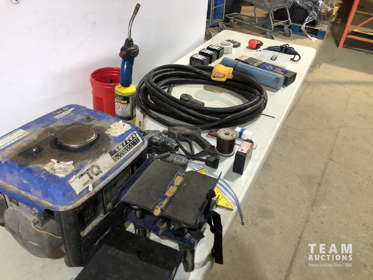 TGT200 generator (inoperable), snow mobile dolly's, heavy duty extension cord 240v, Mastercraft rotary tool, welding rods and bike tire tubes