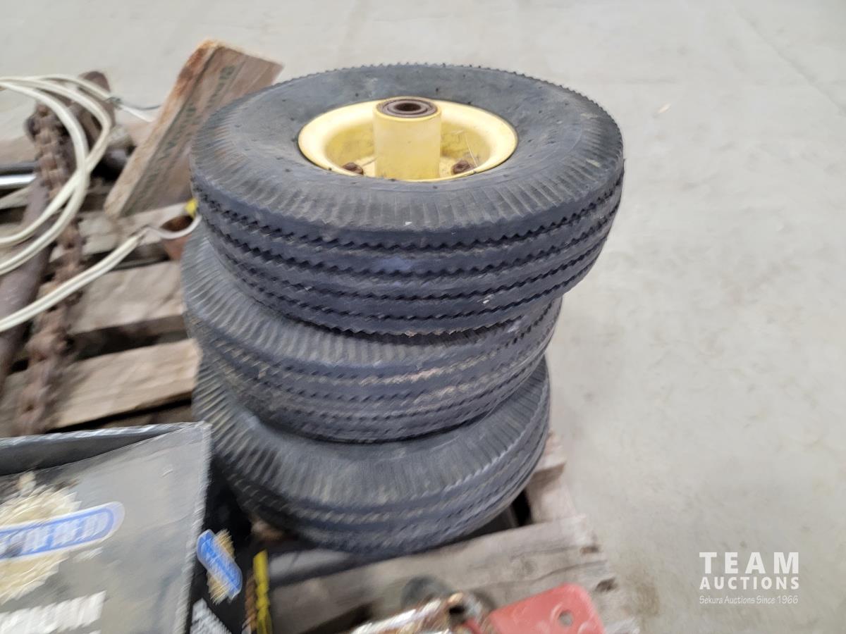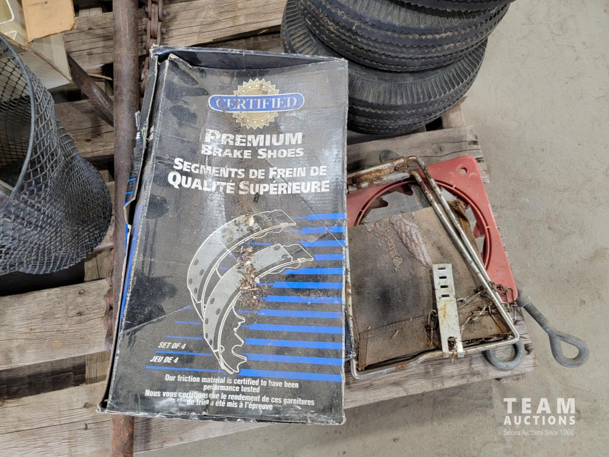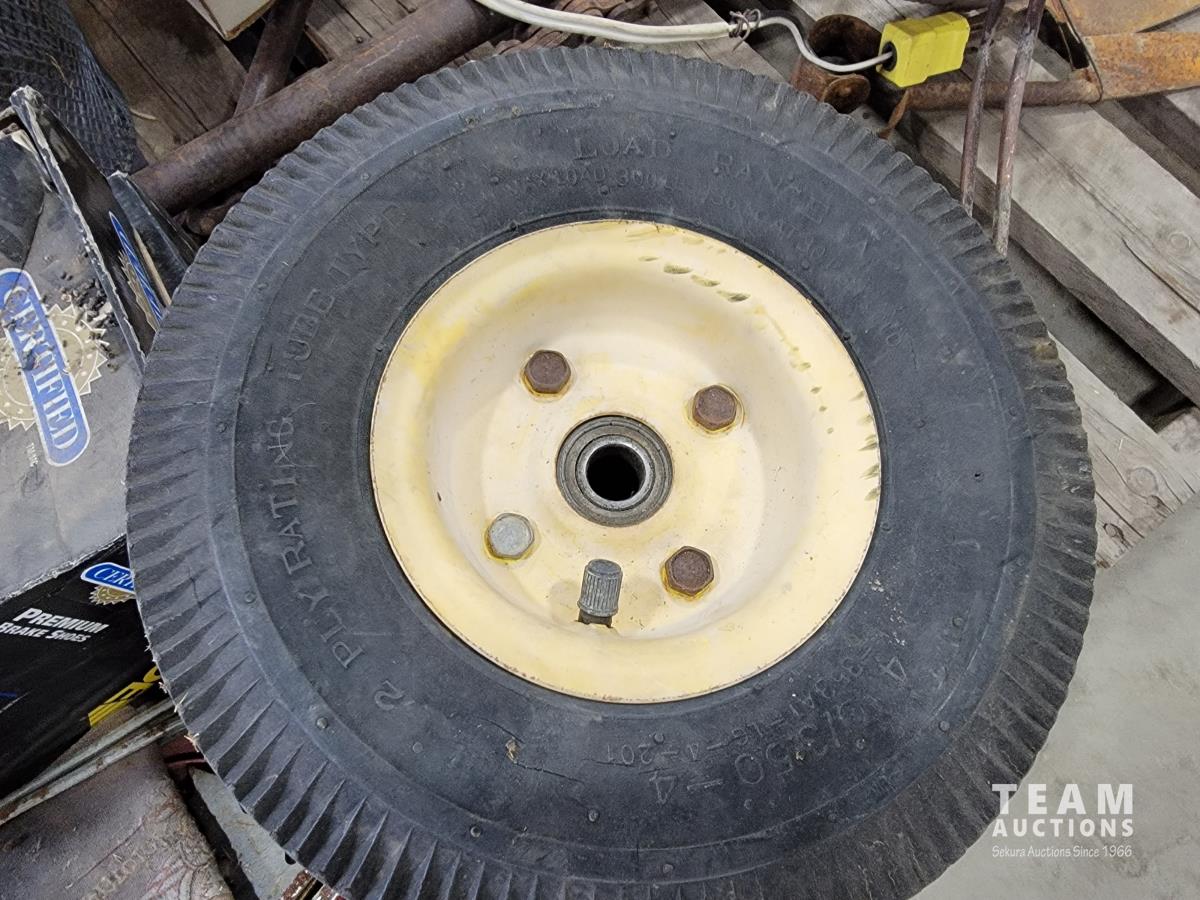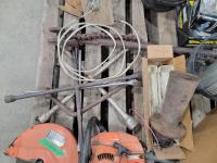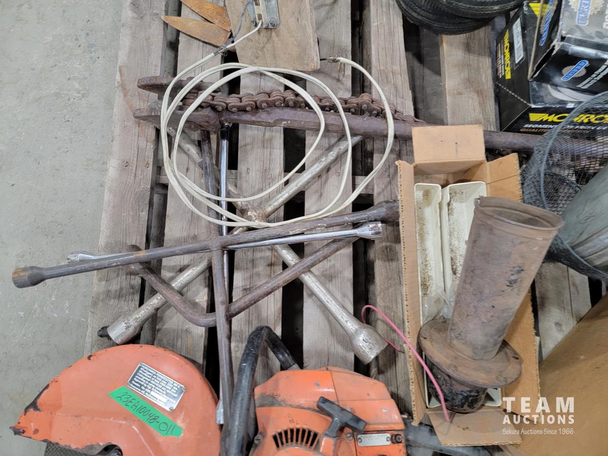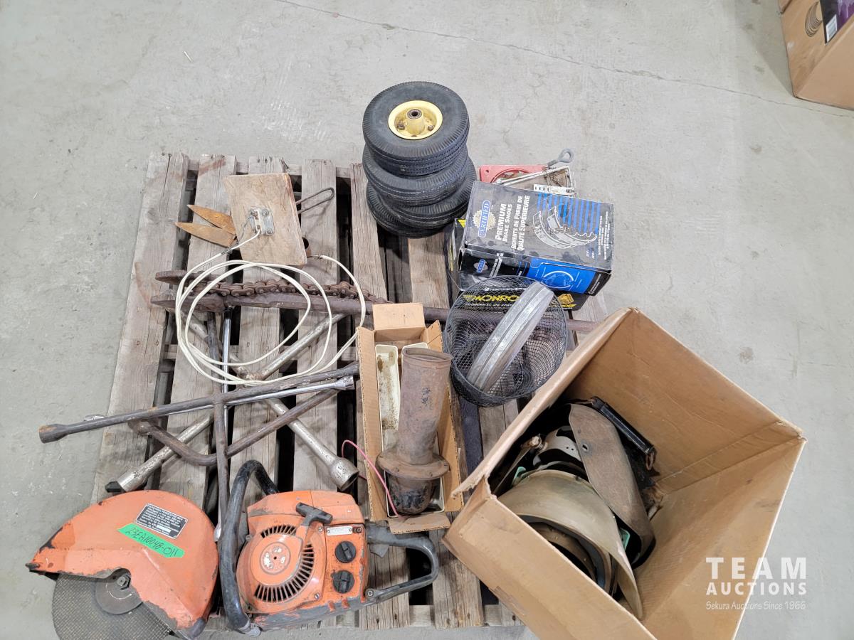 Welding helmets, tire irons, Husqvarna power cutter, (4) wheels, brake shoes