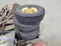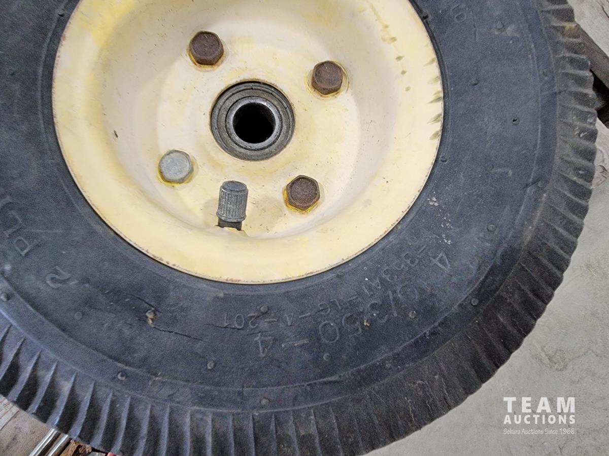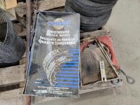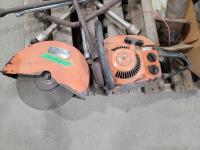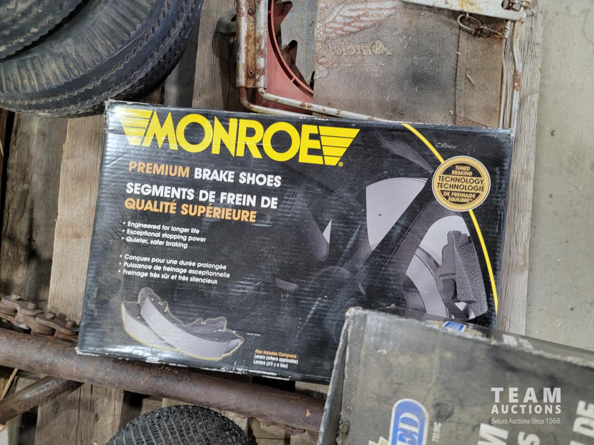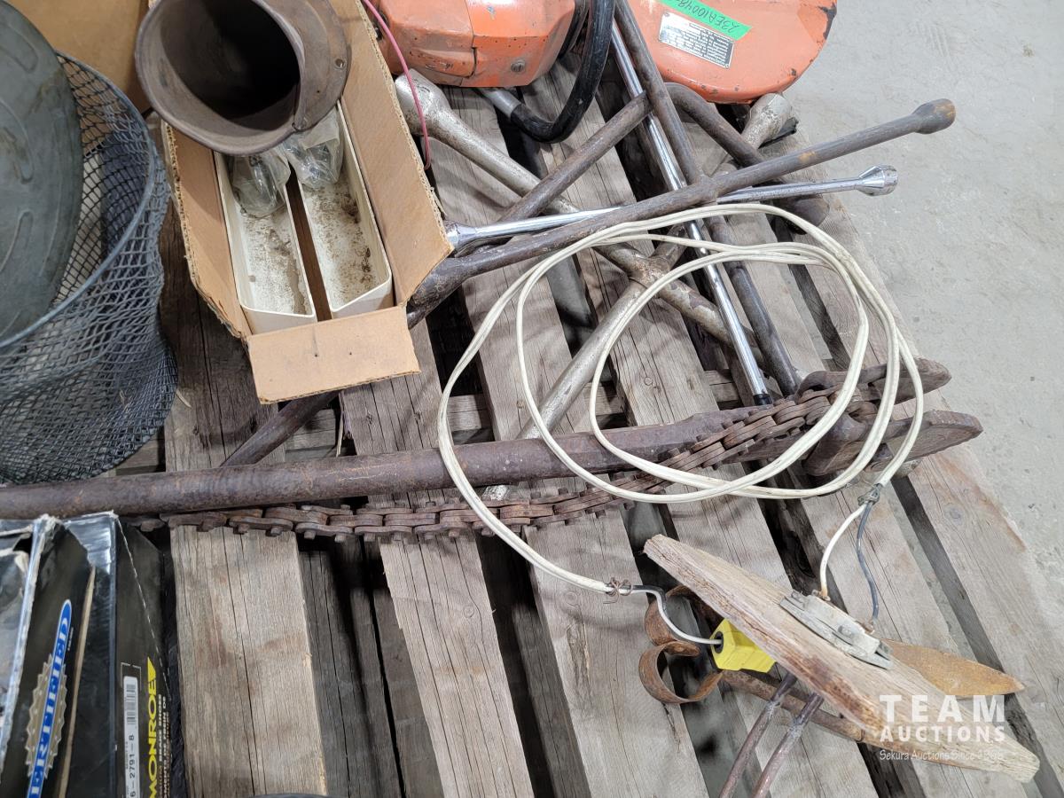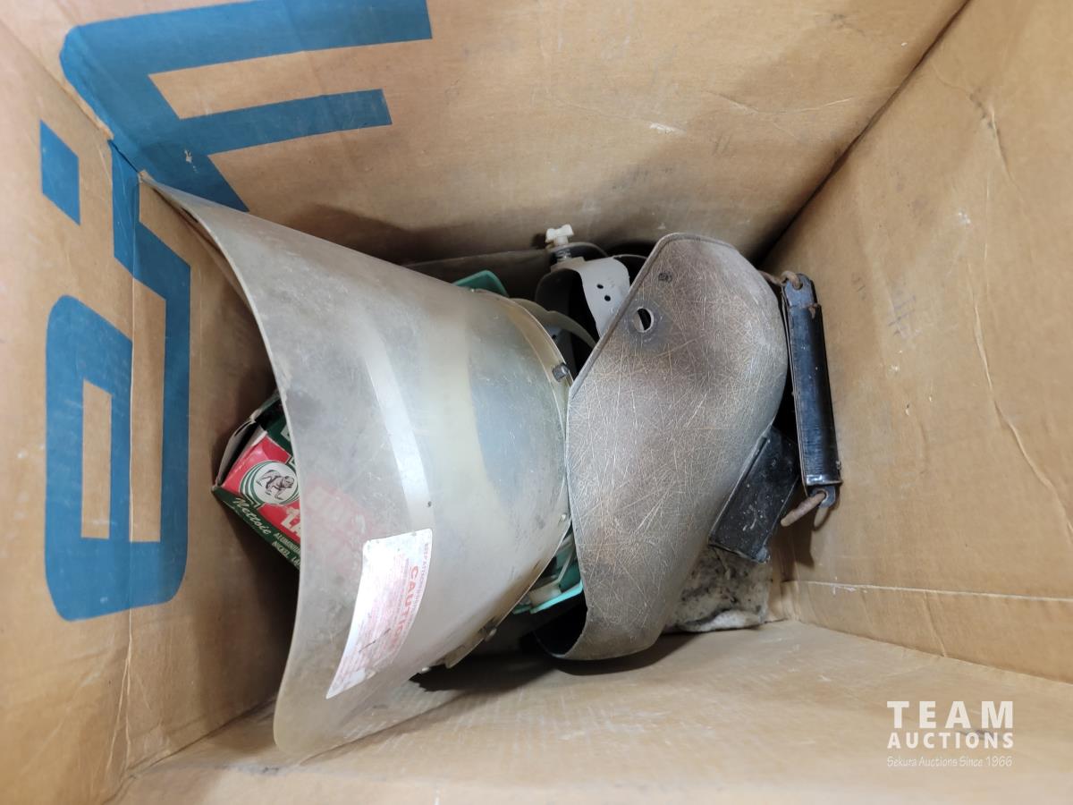 Welding helmets, tire irons, Husqvarna power cutter, (4) wheels, brake shoes