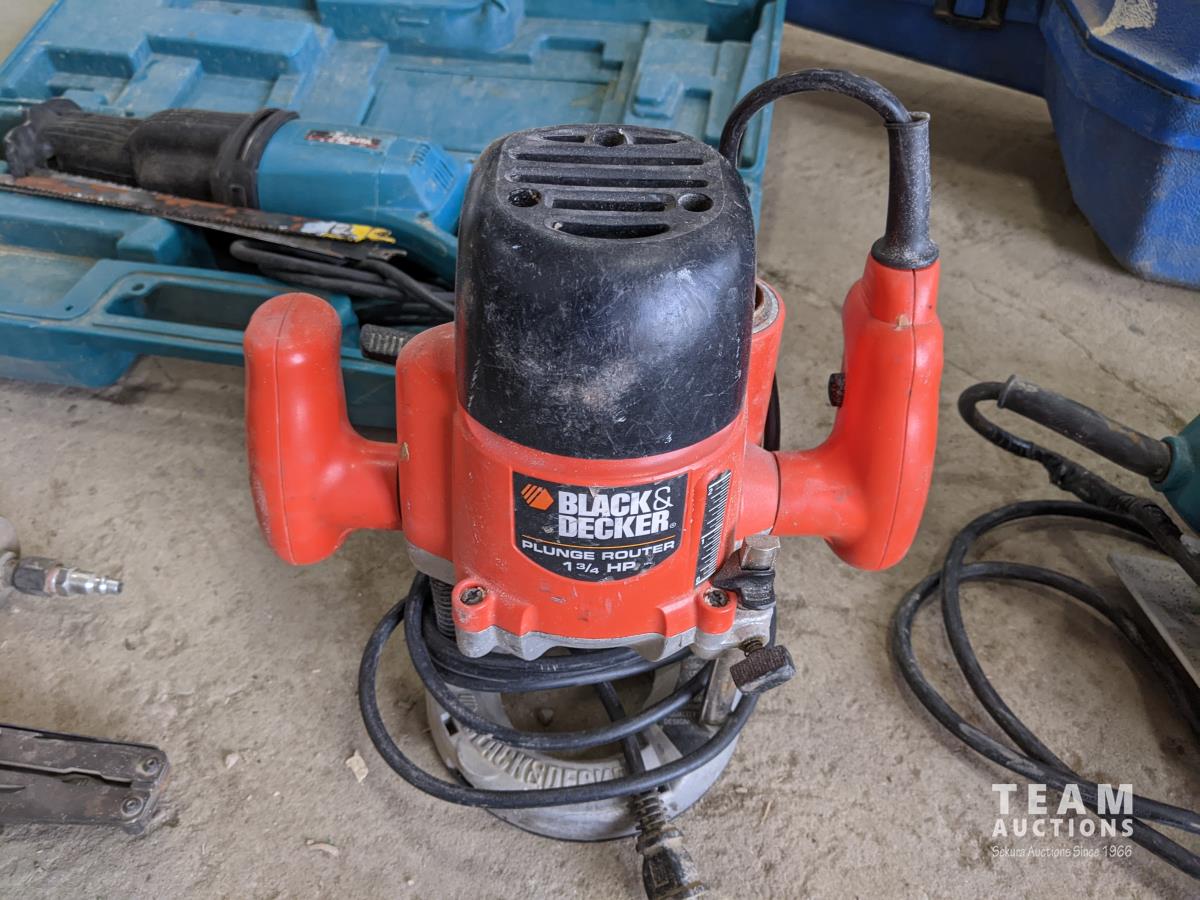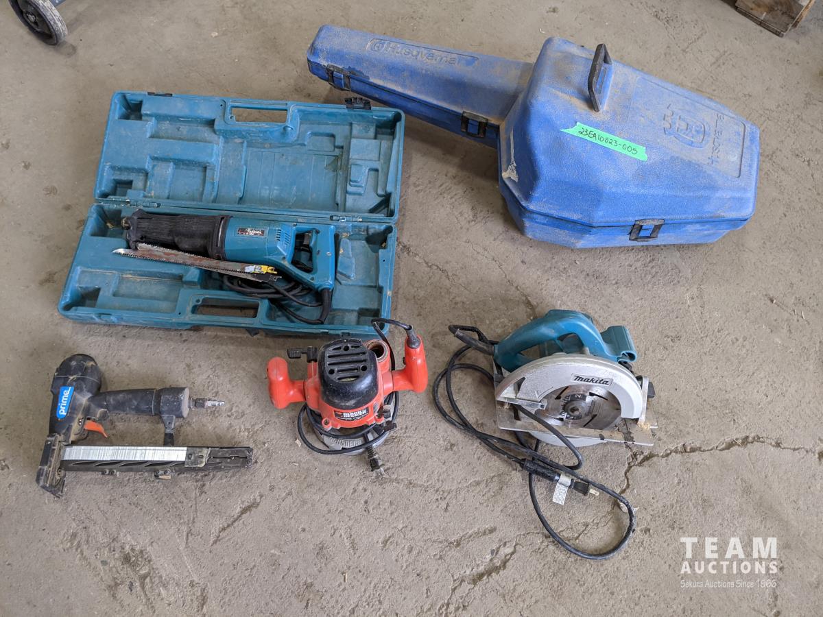 Makita reciprocating saw, circular saw, Black & Decker router, stapler