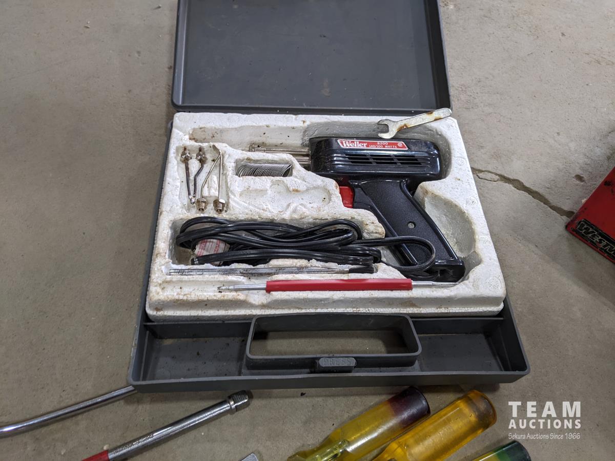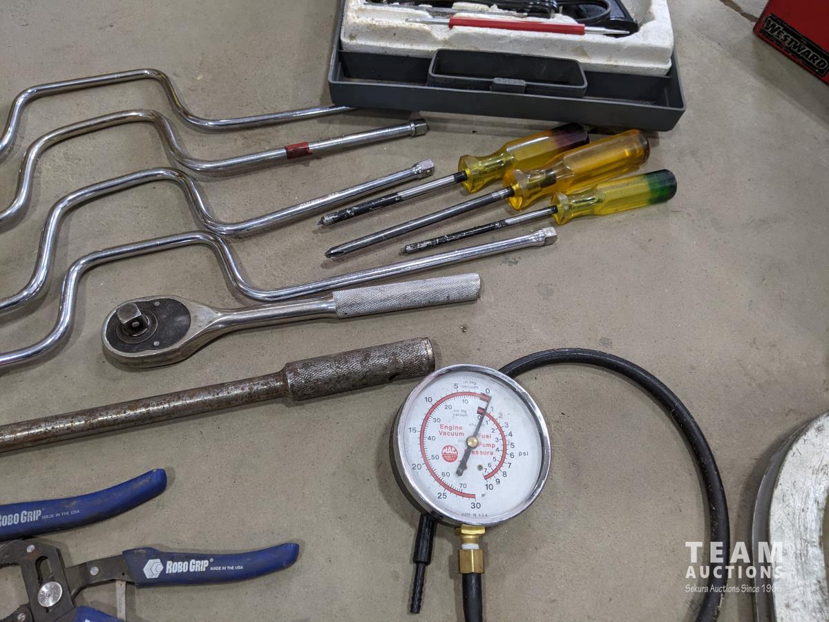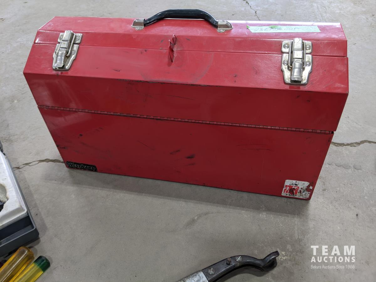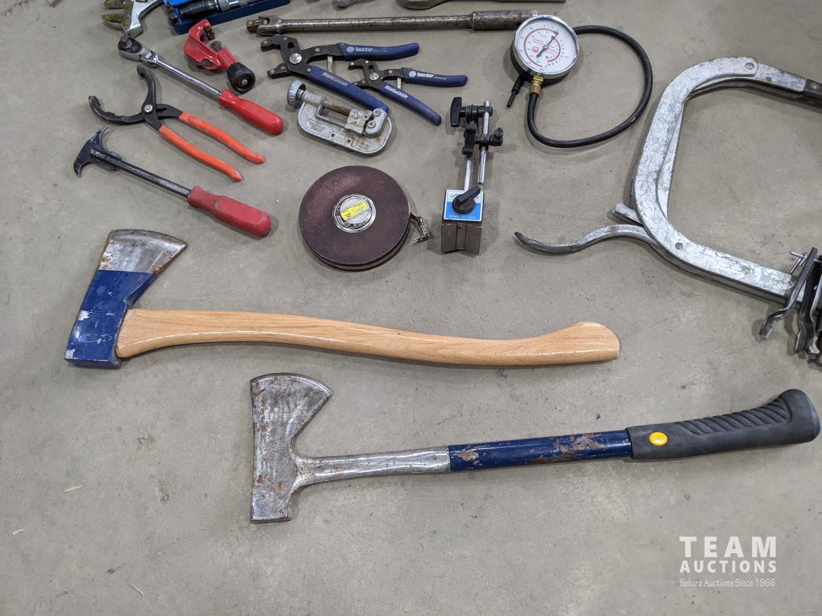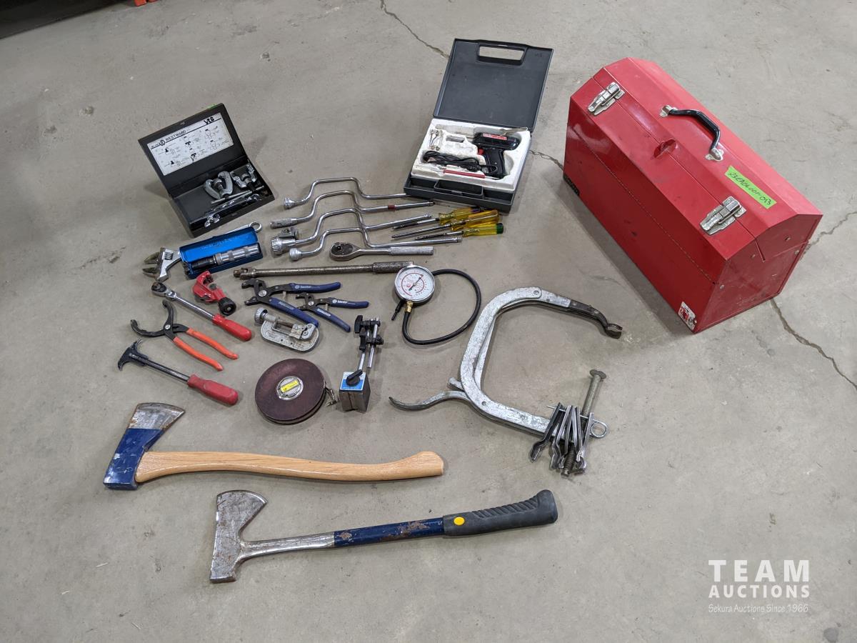 Westward cantilever tool box, 100 ft tape measure, Proto easy-outs, Mac seal puller, Proto speed wrenches, (2) axes, Proto 1/2 inch ratchet, Mac 3/8 inch ratchet, Gray valve spring compressor
