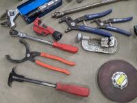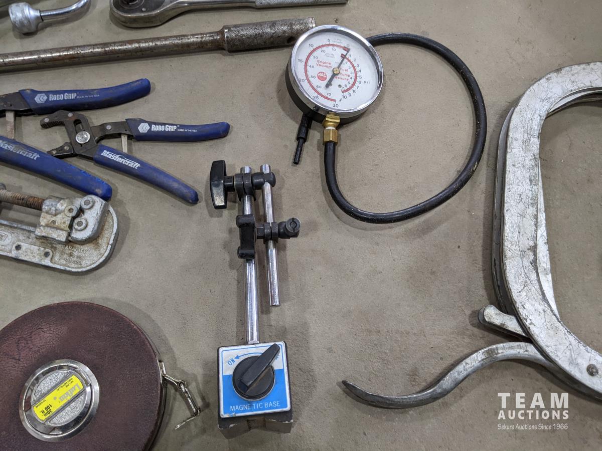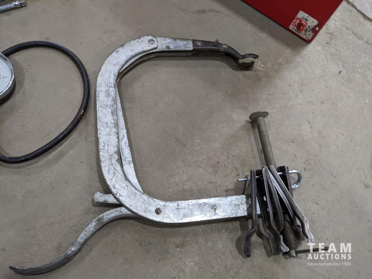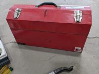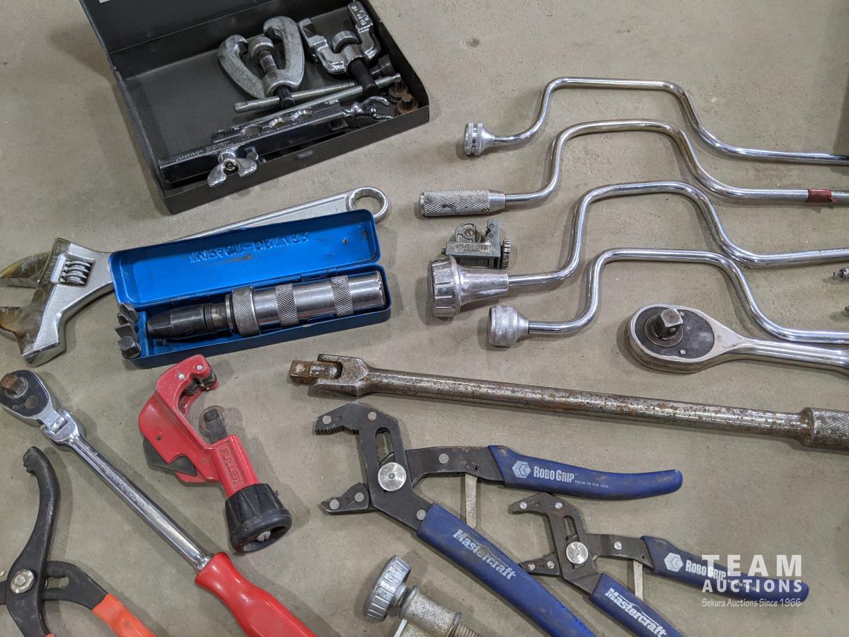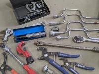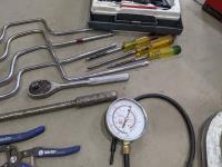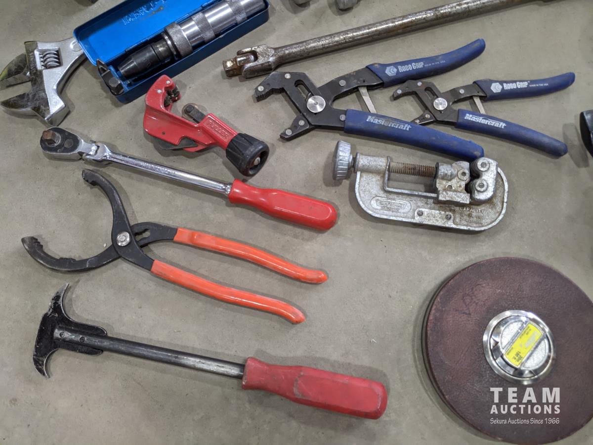 Westward cantilever tool box, 100 ft tape measure, Proto easy-outs, Mac seal puller, Proto speed wrenches, (2) axes, Proto 1/2 inch ratchet, Mac 3/8 inch ratchet, Gray valve spring compressor