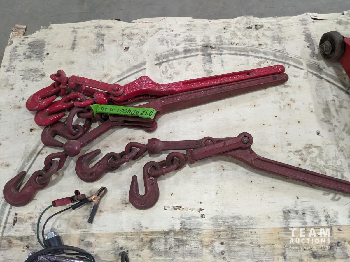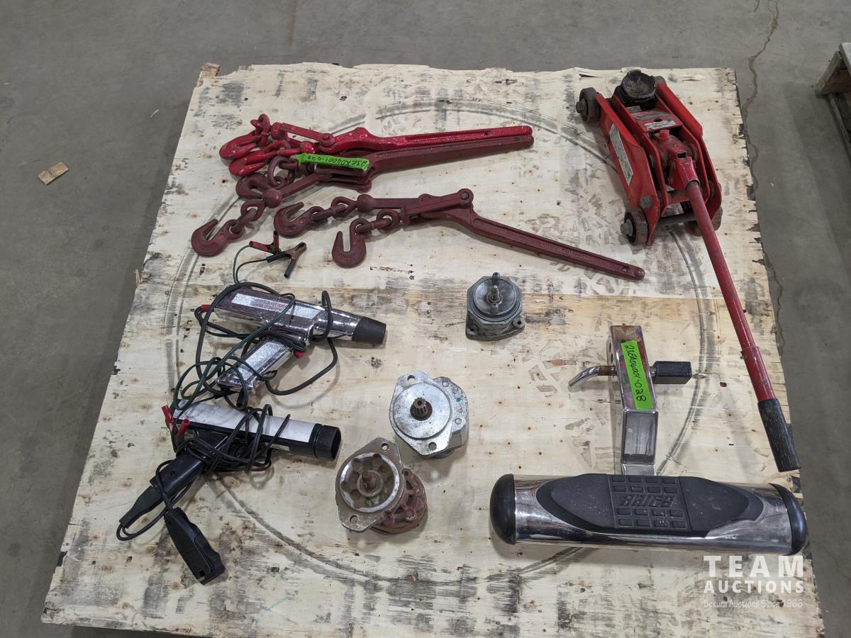 (3) chain booms, (2) timing guns, hitch step, 1-1/2 ton floor jack, Lincoln Kleen-pak bearing packer, miscellaneous parts