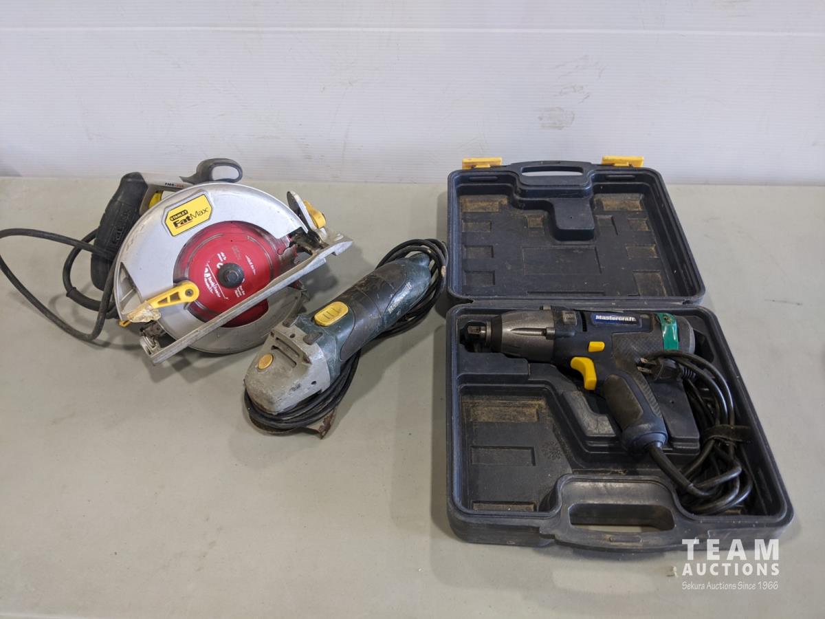 Mastercraft 1/2" drive impact, Mastercraft 4 1/2" angle grinder, Stanley Fat Max 7 1/4" circular saw