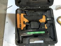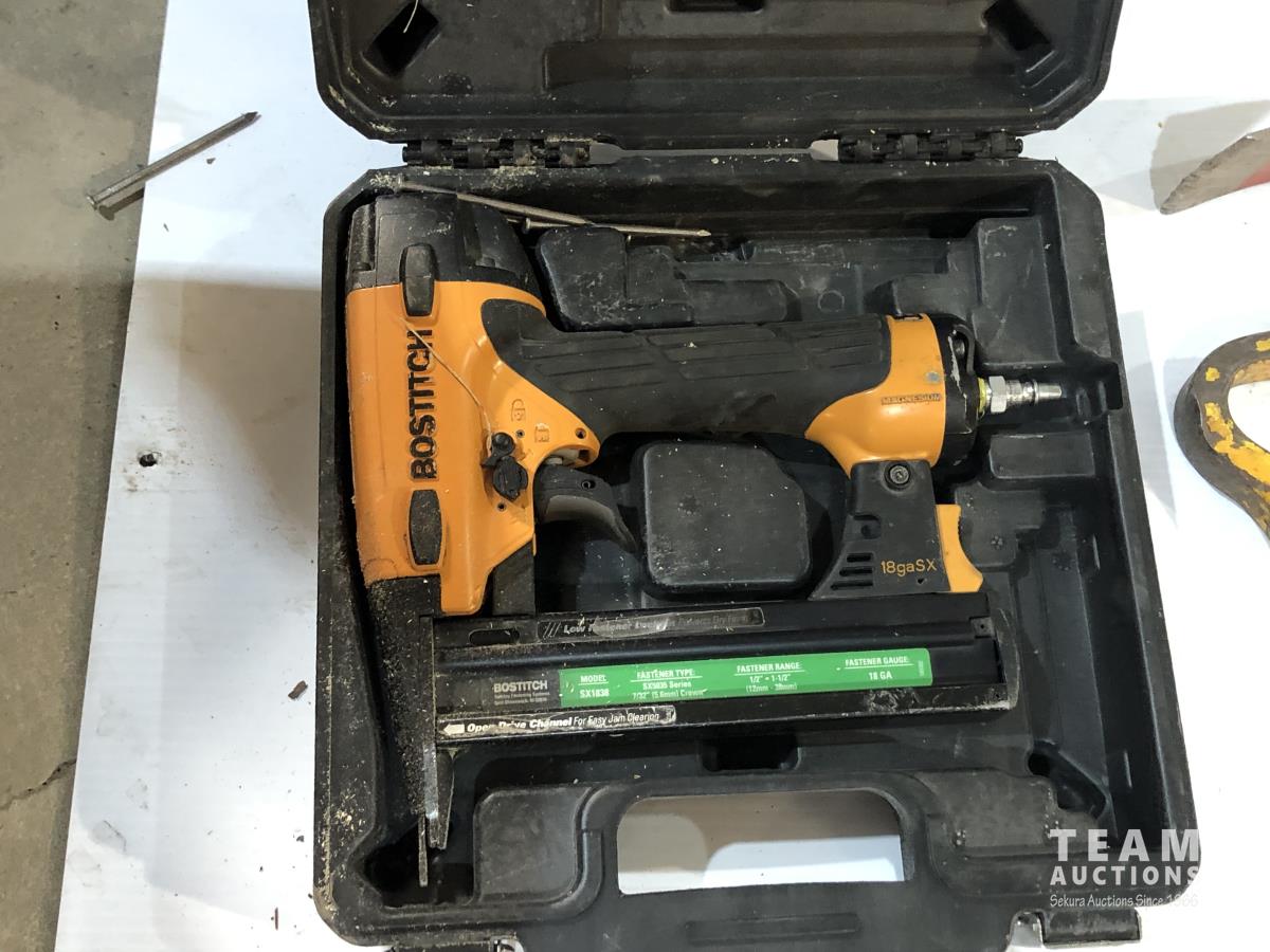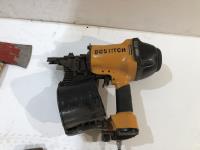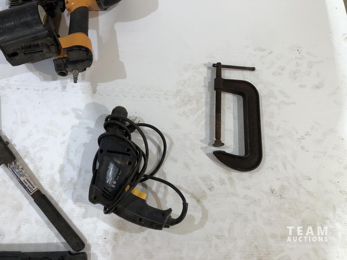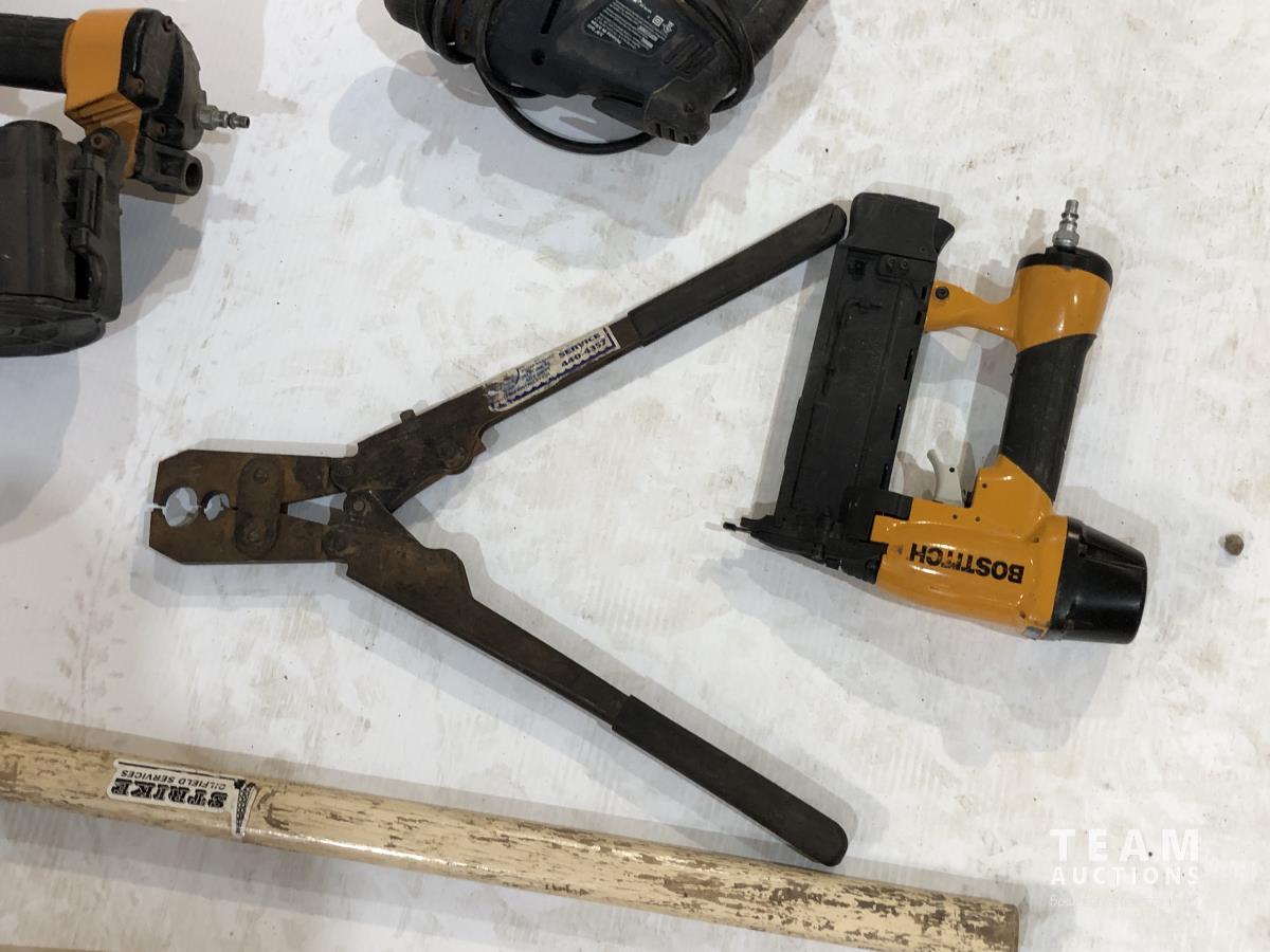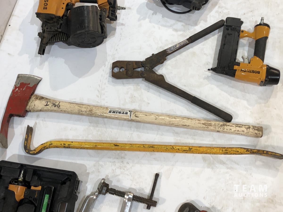 Axe, pry bar, Bostitch air coil framing nailer, (2) Bostitch brad nailers, pipe wrench, clamp and pex crimping pliers