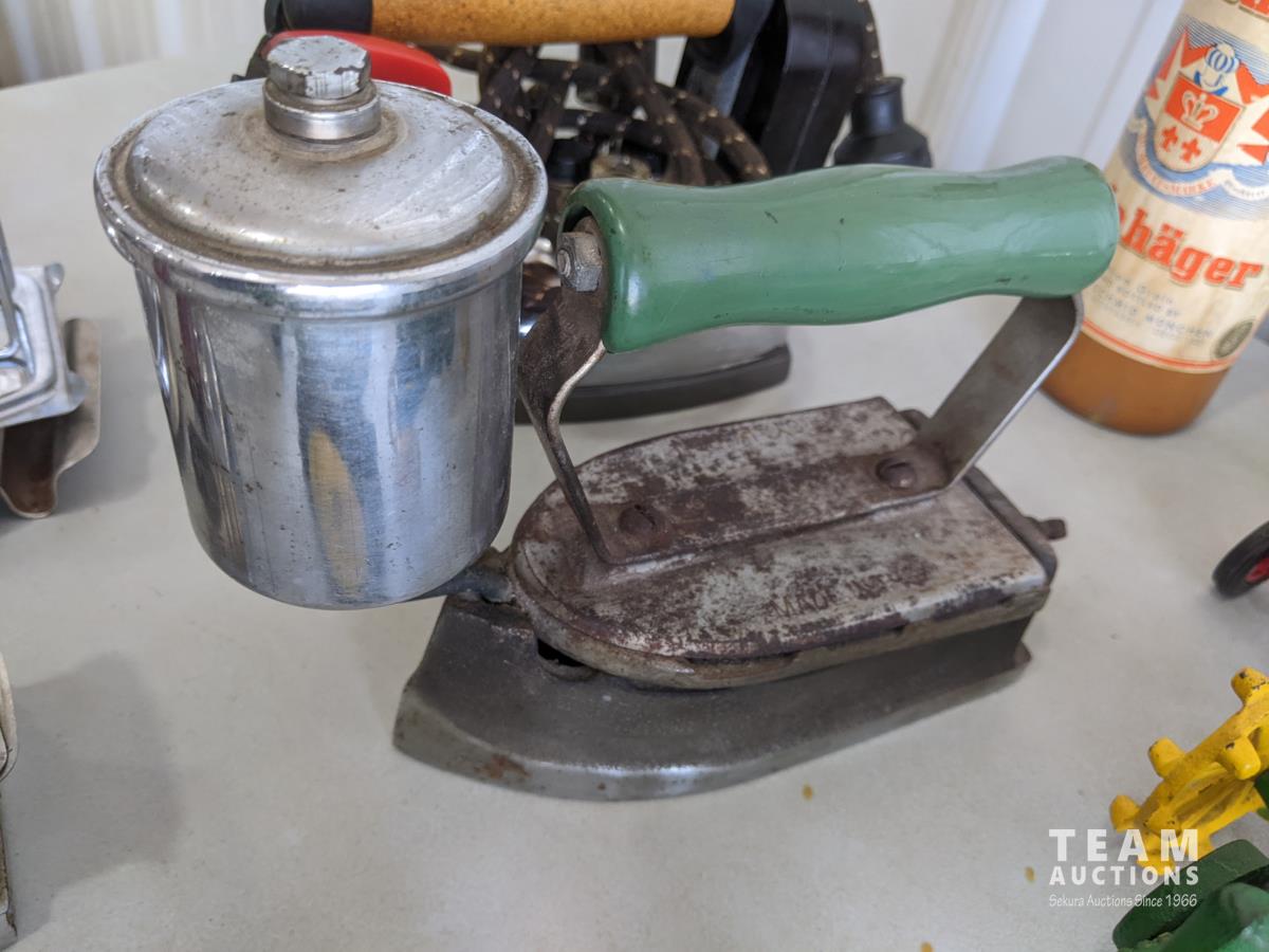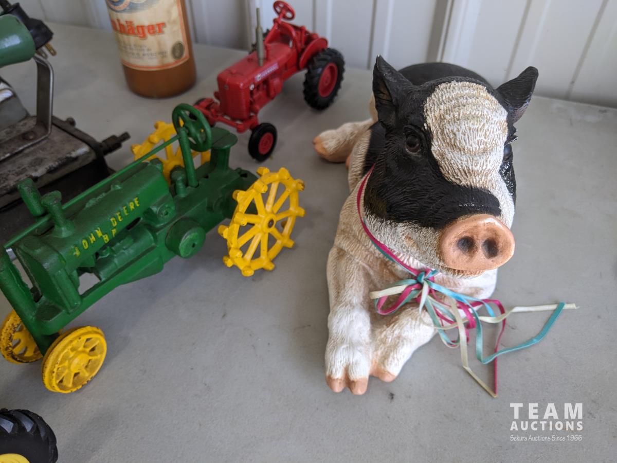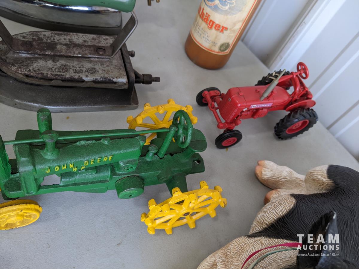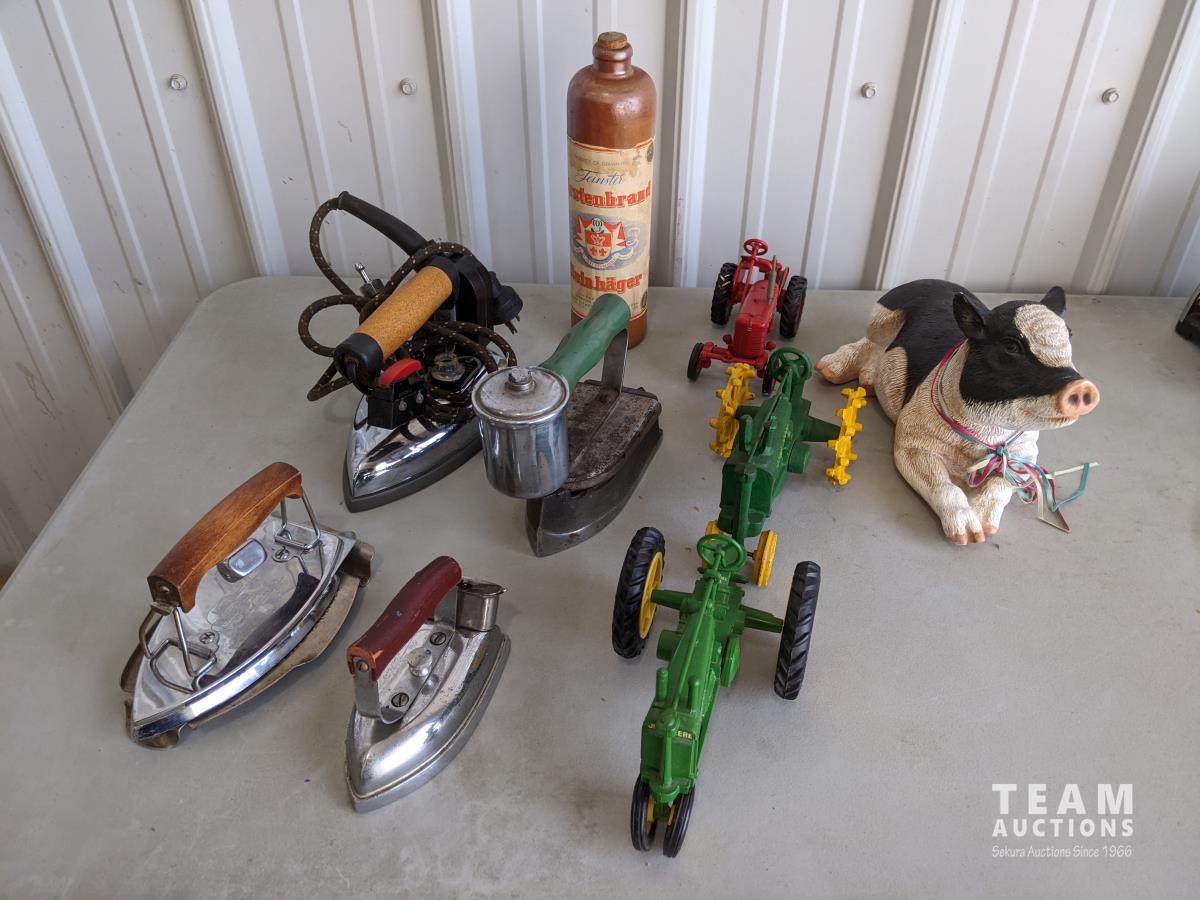 (4) Irons, (3) tractors, German bottle and pig figurine