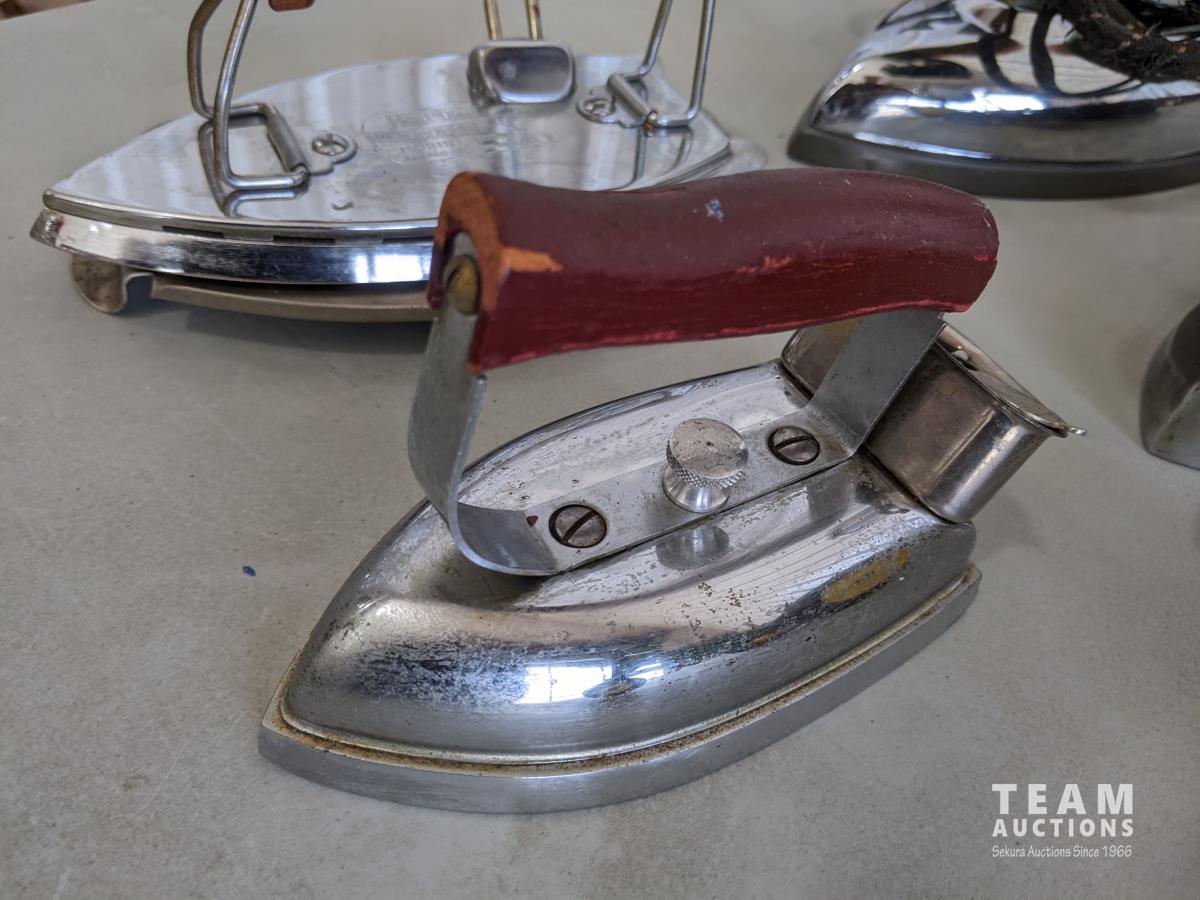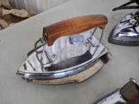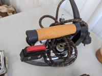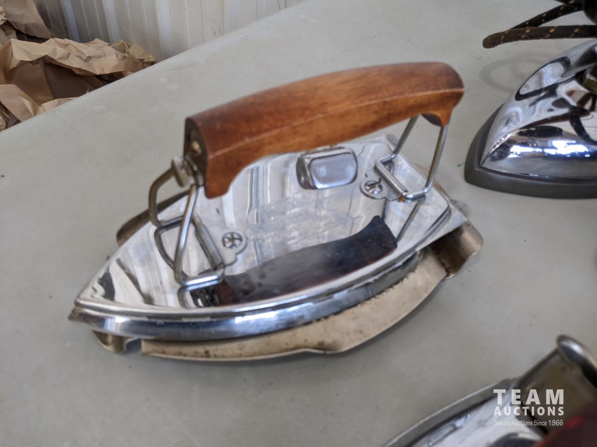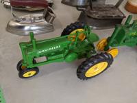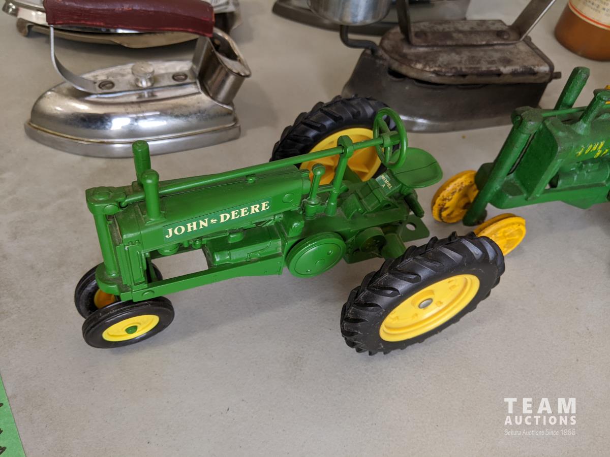 (4) Irons, (3) tractors, German bottle and pig figurine