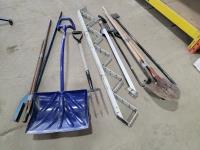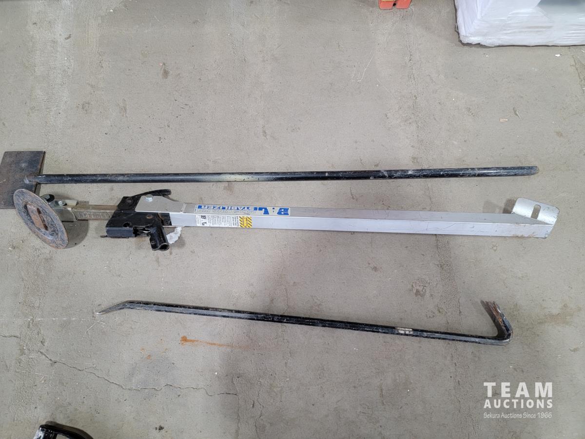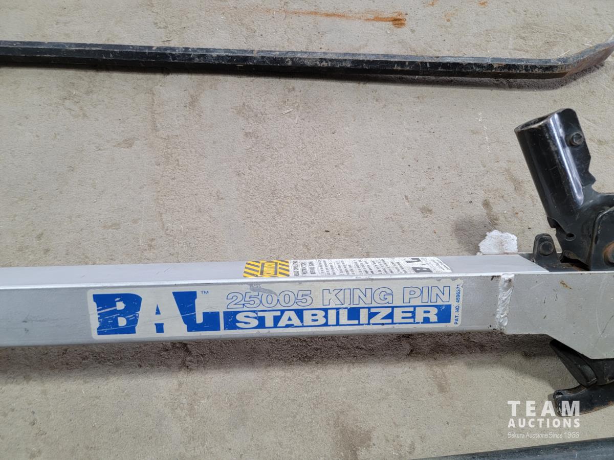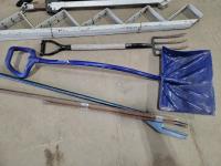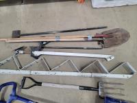 Pry bars, shovels, 4-prog forks, metal 5 step stair stringer and 25005 king pin bal stabilizer
