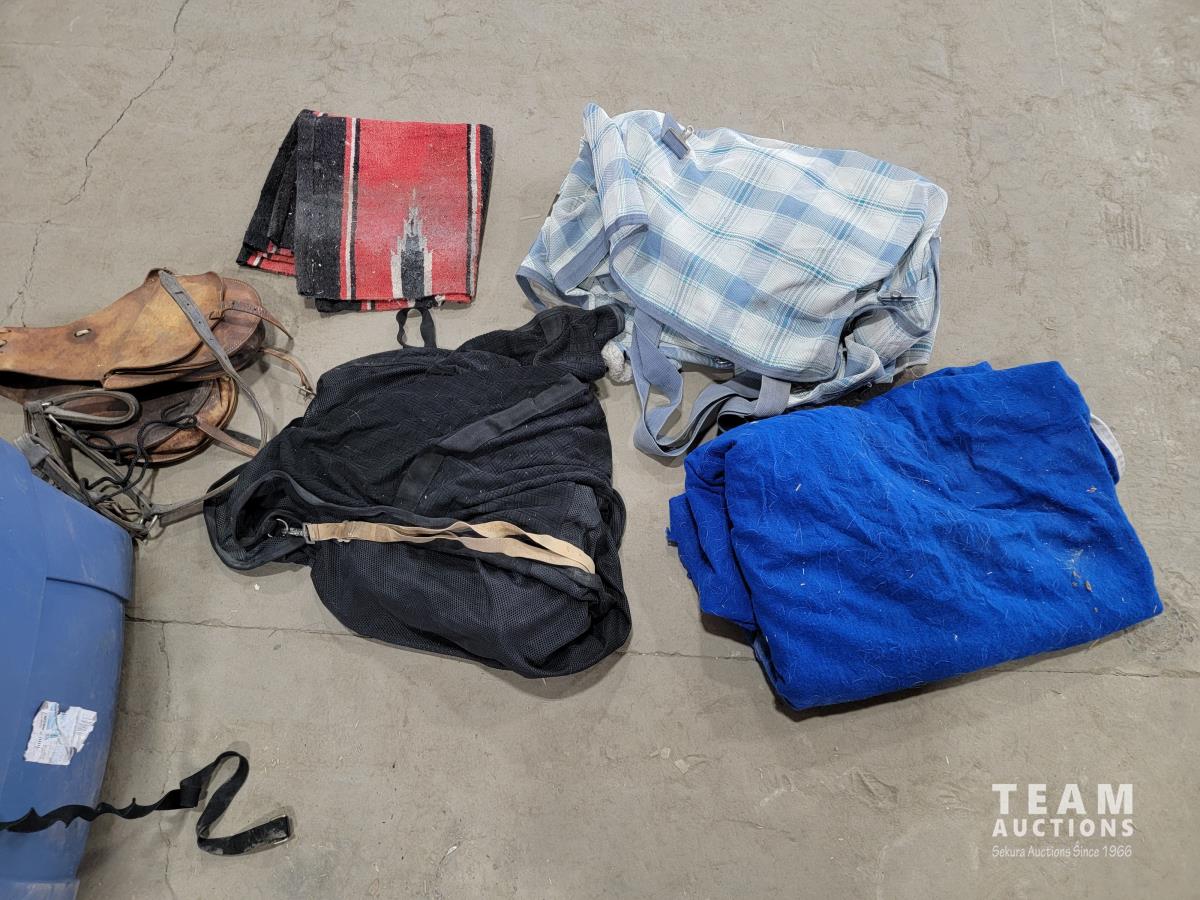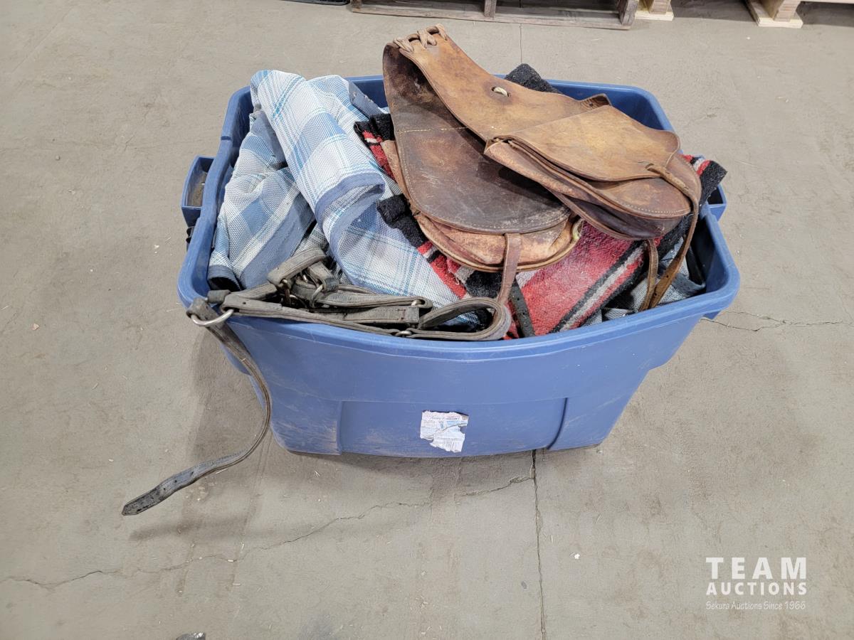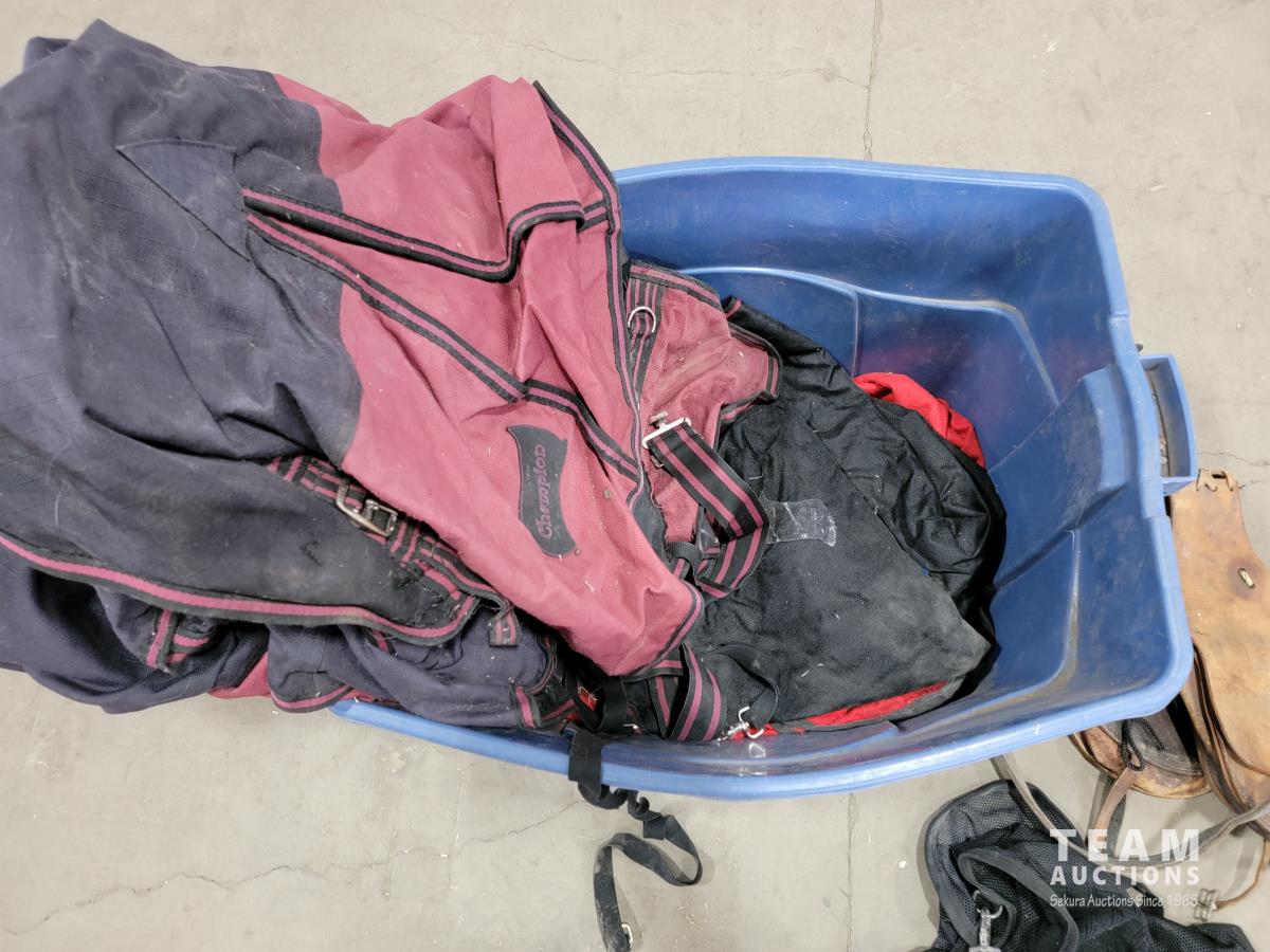 1180 Rubbermaid Container of Horse Blankets and Horse Tack
