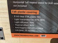 With 6 mil clear EVA plastic film, cold frame, hand crank roll-up sides, Peak ceiling roof