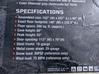 7 ft 9 inch peak hieght, side entry door, 240 sq ft floor space