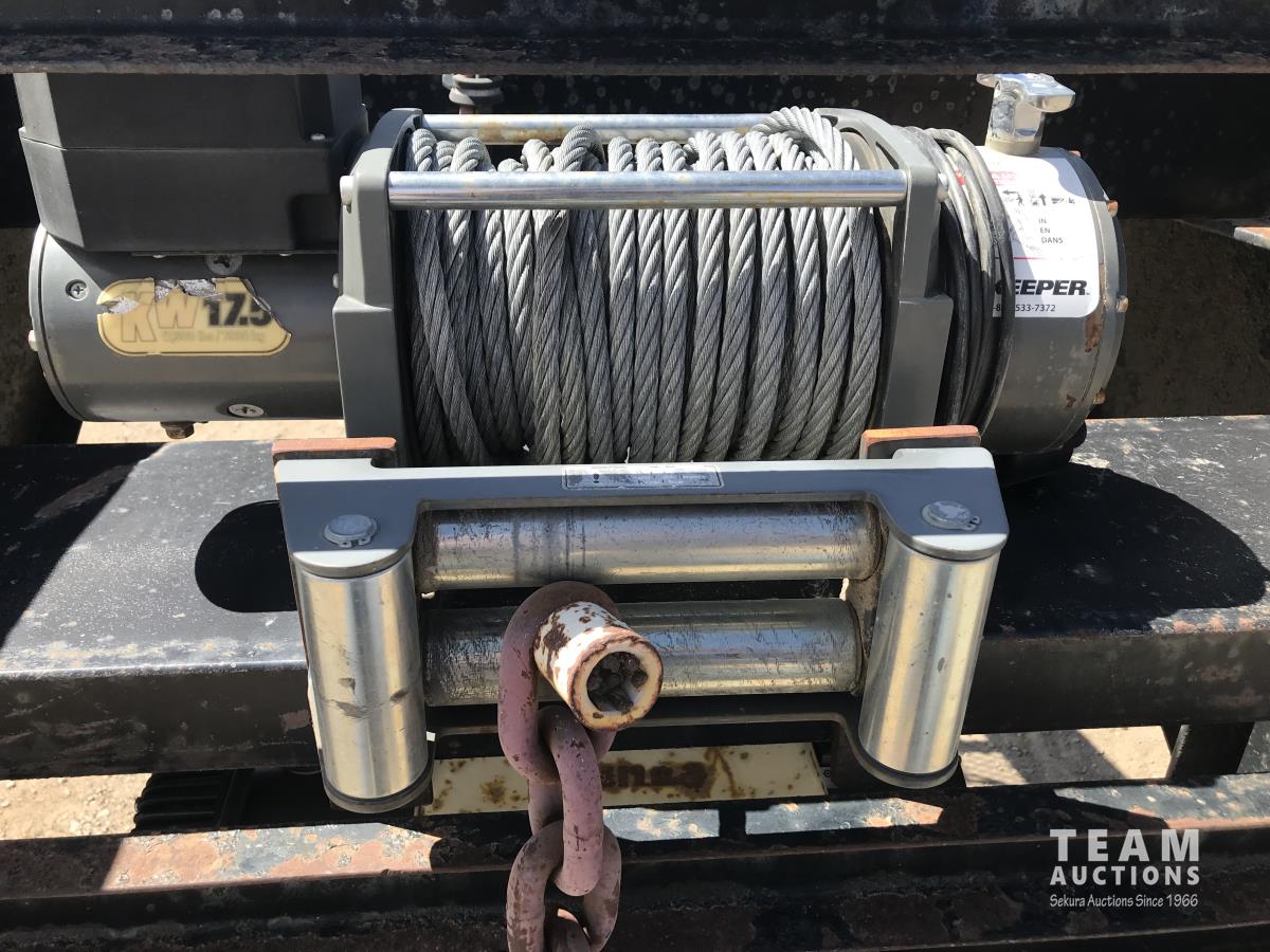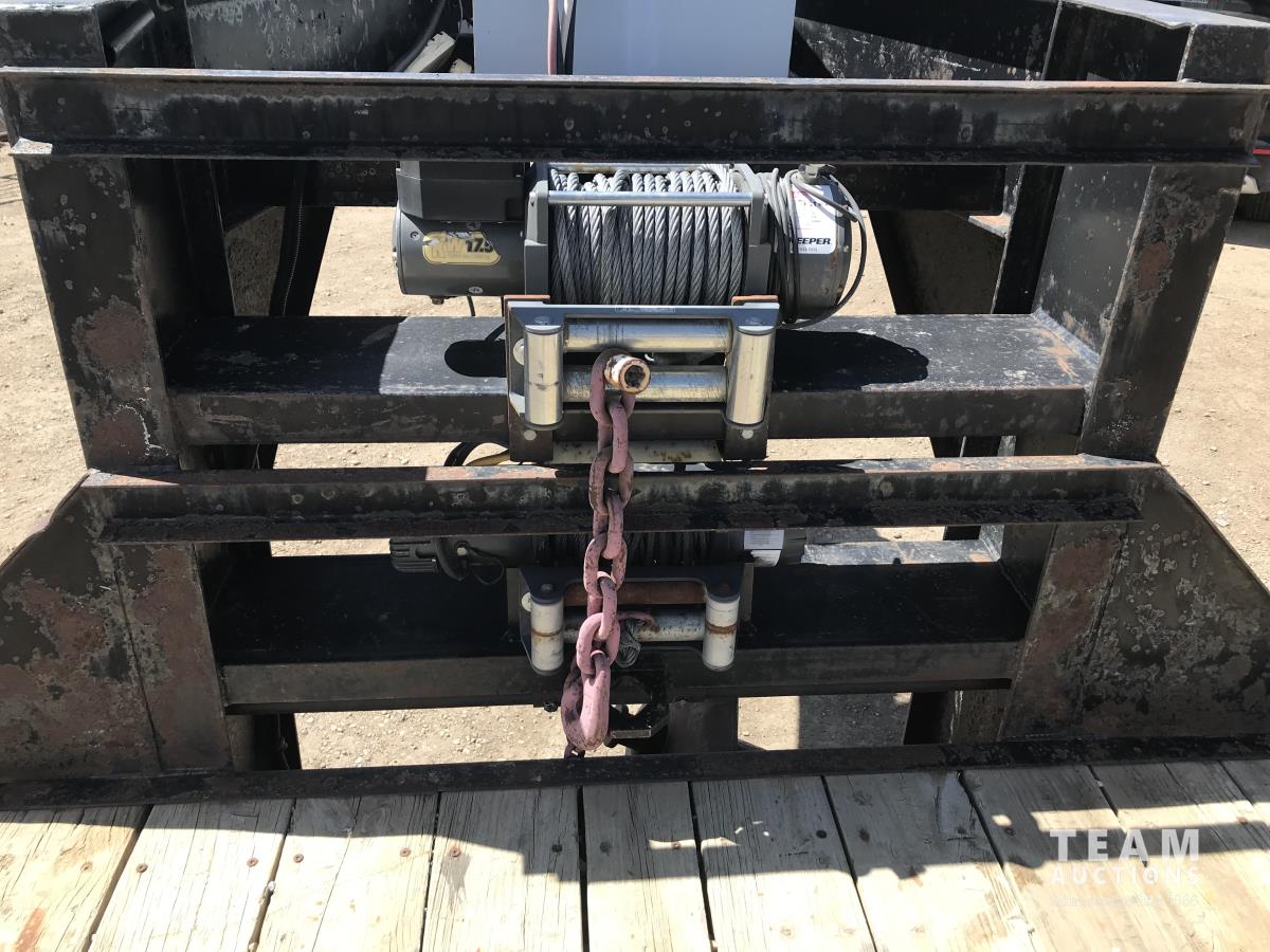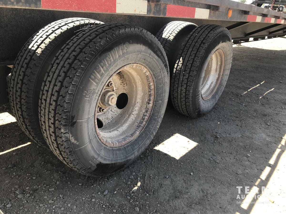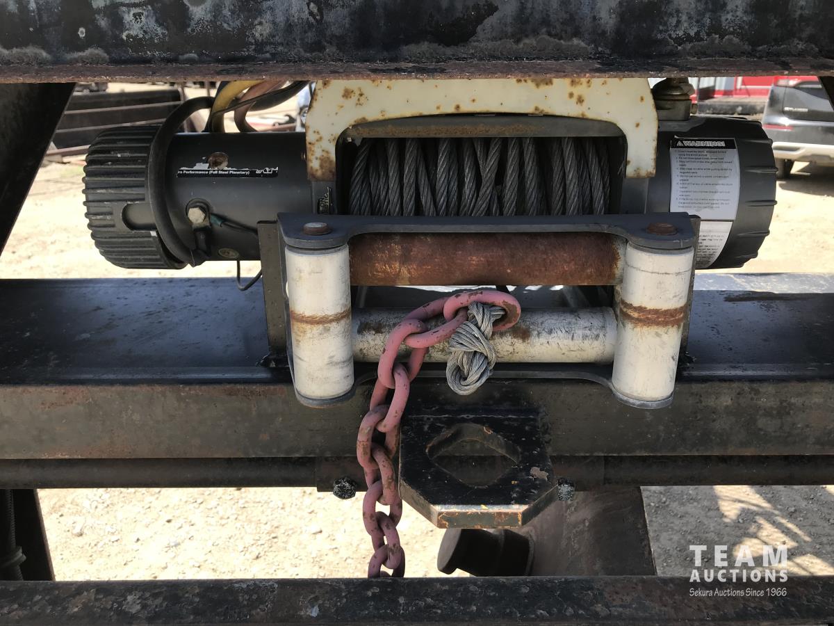 102 inch wide deck, wood deck, stake pockets, rub rails, cargo winches, rear live roll, 10, 500 Lb. axles, (2) 17, 500 lb. winch, spring suspension, ST235/80R16 tires