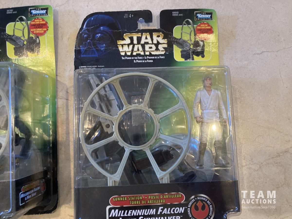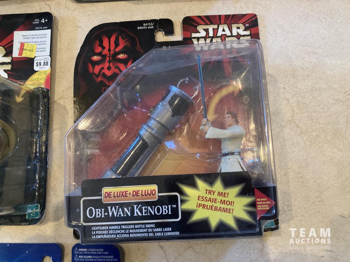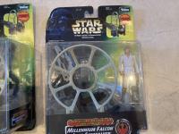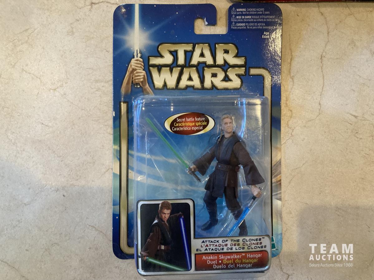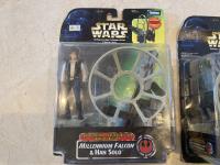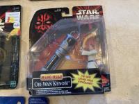 2002 Hasbro Star Wars, Attack of the Clones collection 1, Anakin Sky Walker Hangar Duel. Anakin Skywalker with force flipping attack. Anakin Skywalker, Slashing Lightsabers Power of the millennium Falcon Gunner Station w/ Luke Skywalker. 1999 Hasbro Obi-Wan Renobi Delux.