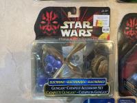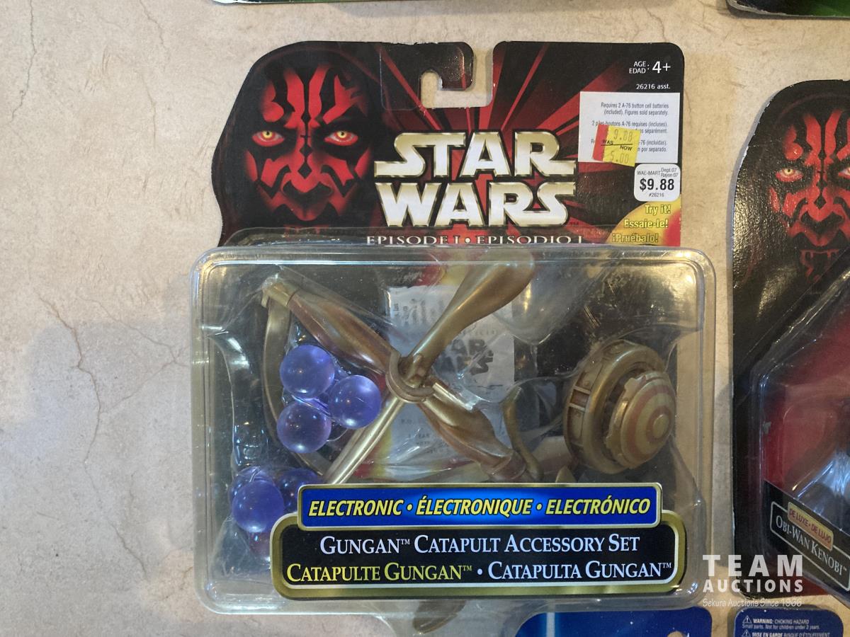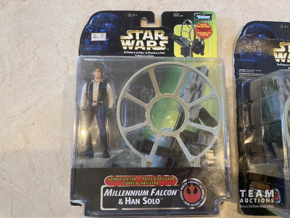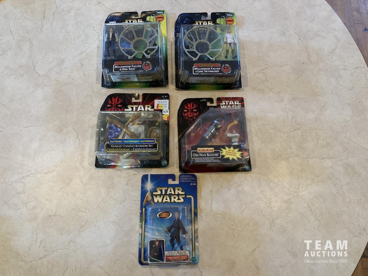 2002 Hasbro Star Wars, Attack of the Clones collection 1, Anakin Sky Walker Hangar Duel. Anakin Skywalker with force flipping attack. Anakin Skywalker, Slashing Lightsabers Power of the millennium Falcon Gunner Station w/ Luke Skywalker. 1999 Hasbro Obi-Wan Renobi Delux.