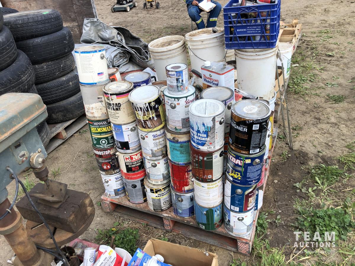 1890 Qty of Misc Paints, Stain, Adhesives and Misc Shop Fluids