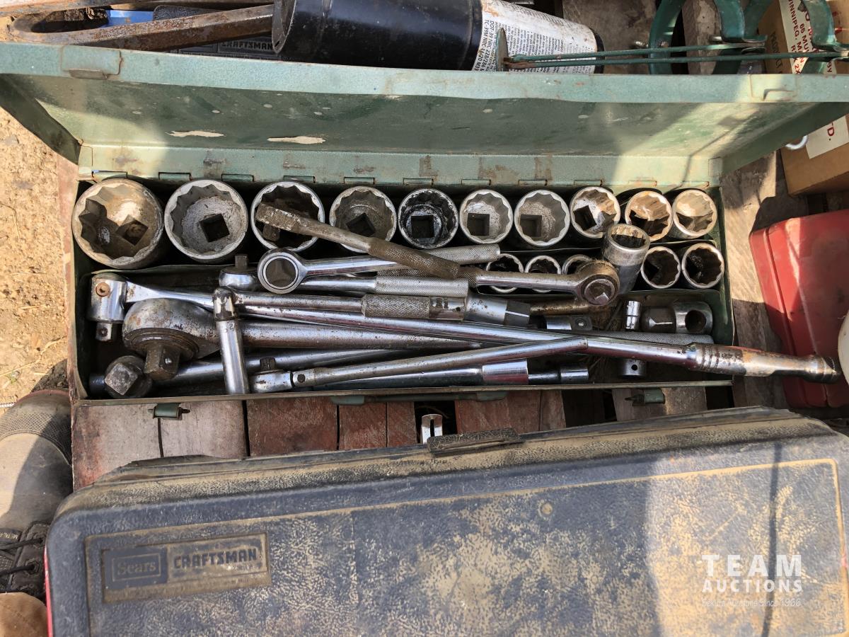 socket sets, crow bars, drill press, propane torch, caulking guns, tubes of silicone, tool boxes