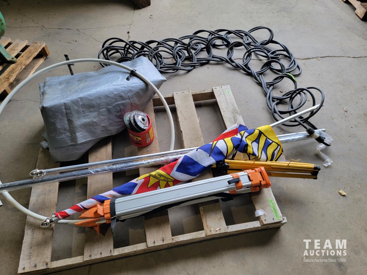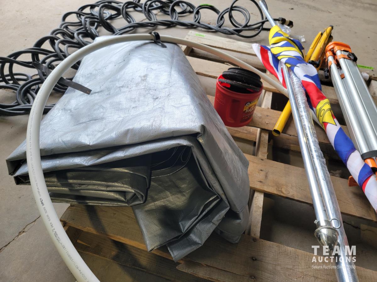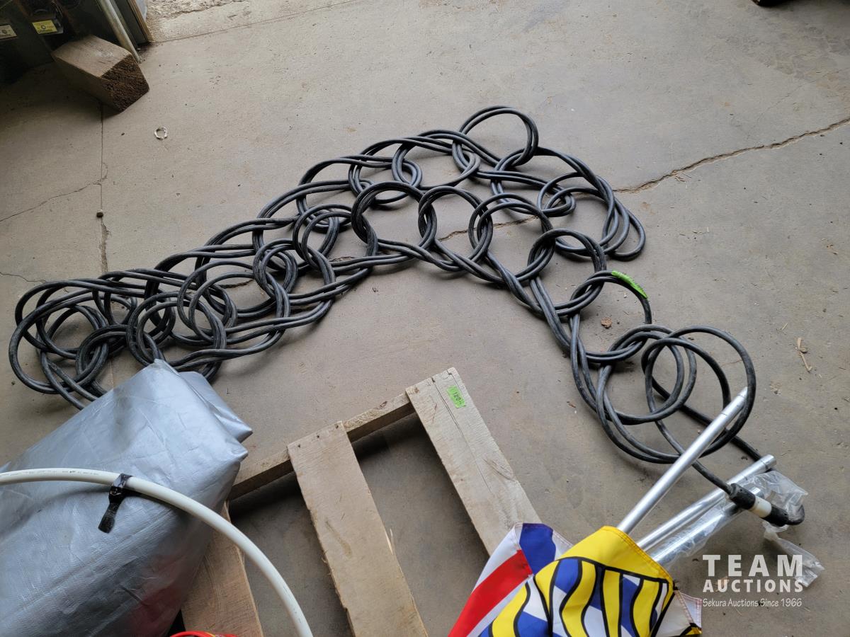 100 ft /200 ft heavy duty extension cord, tarp, tripod, flag, assortment of zip discs and apex pipe