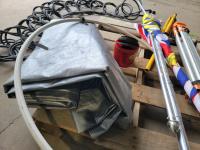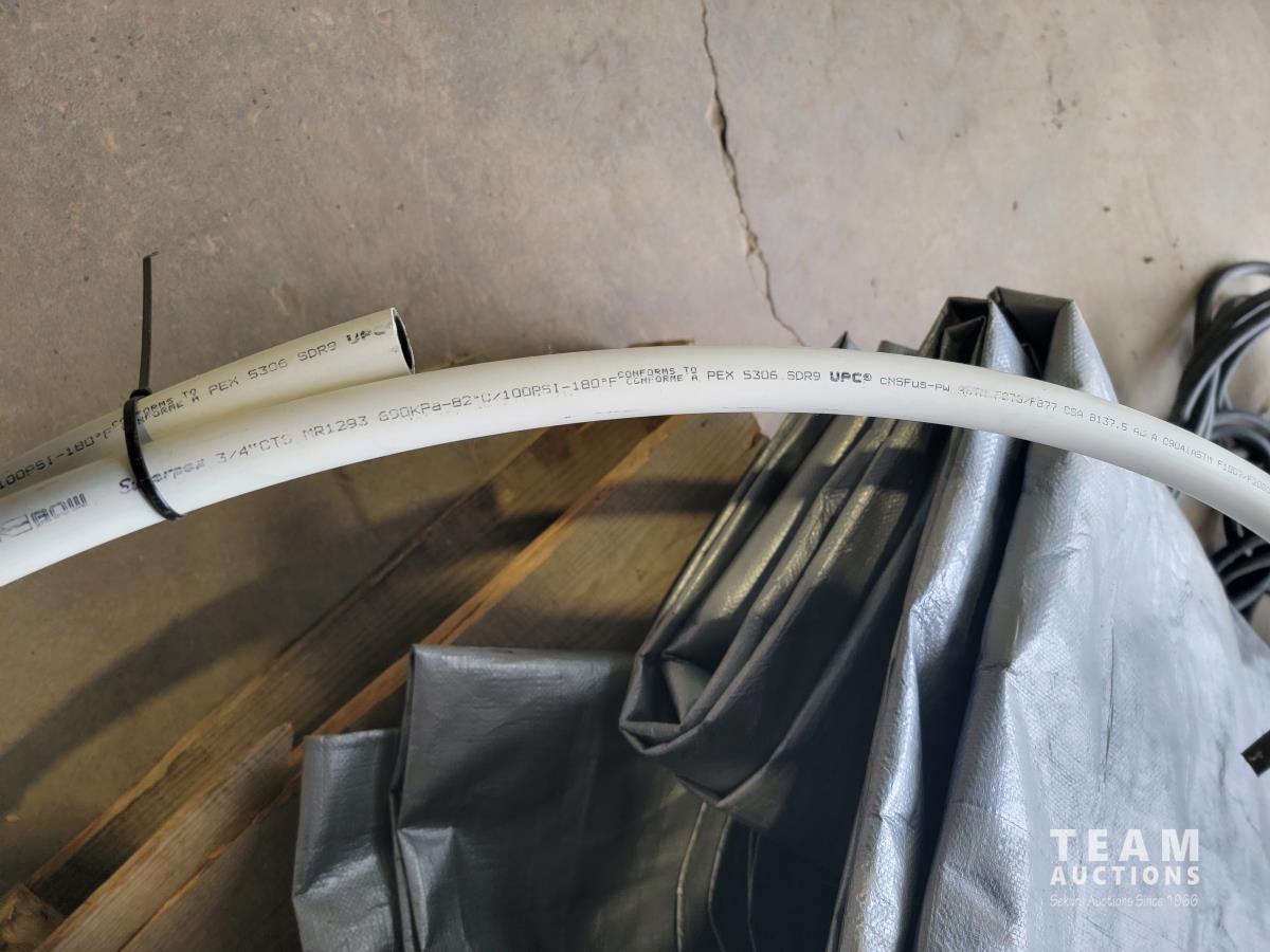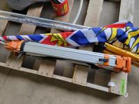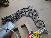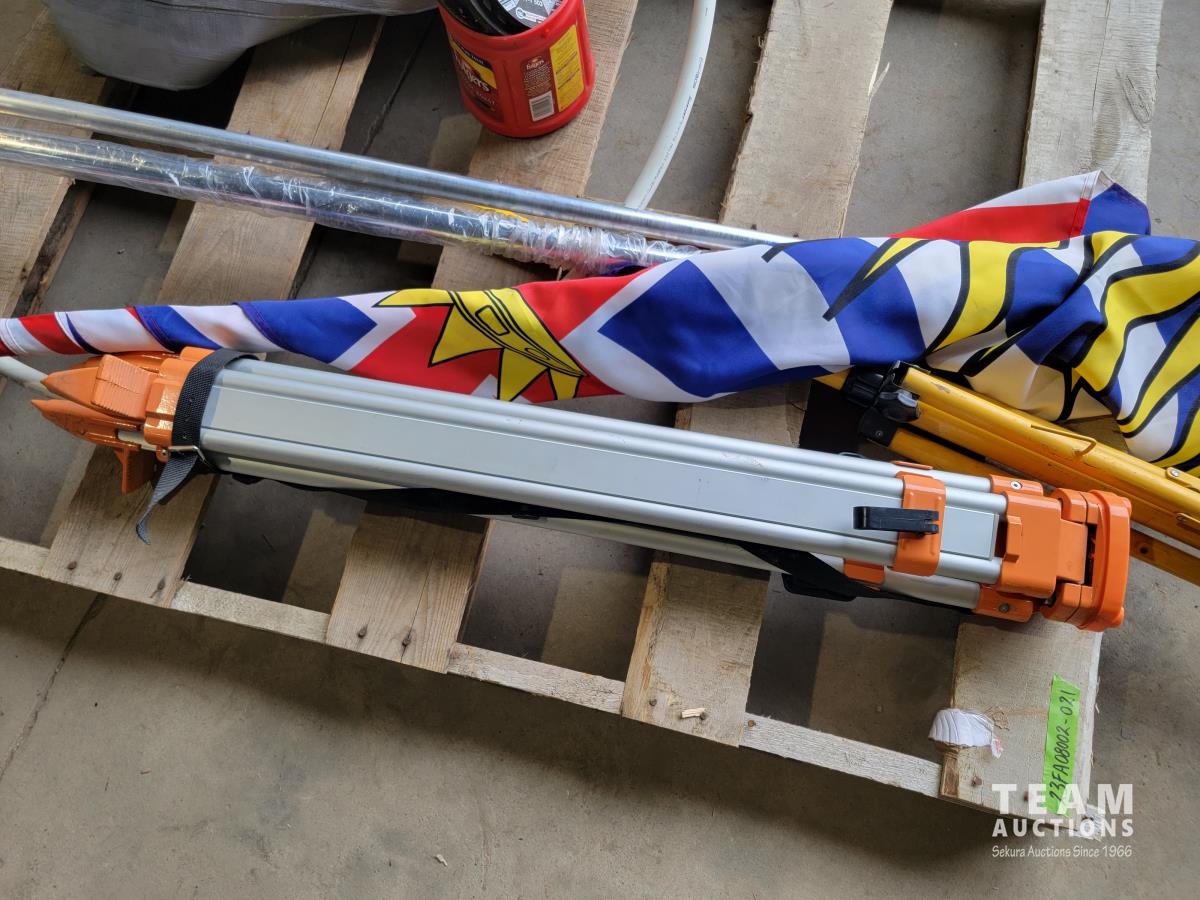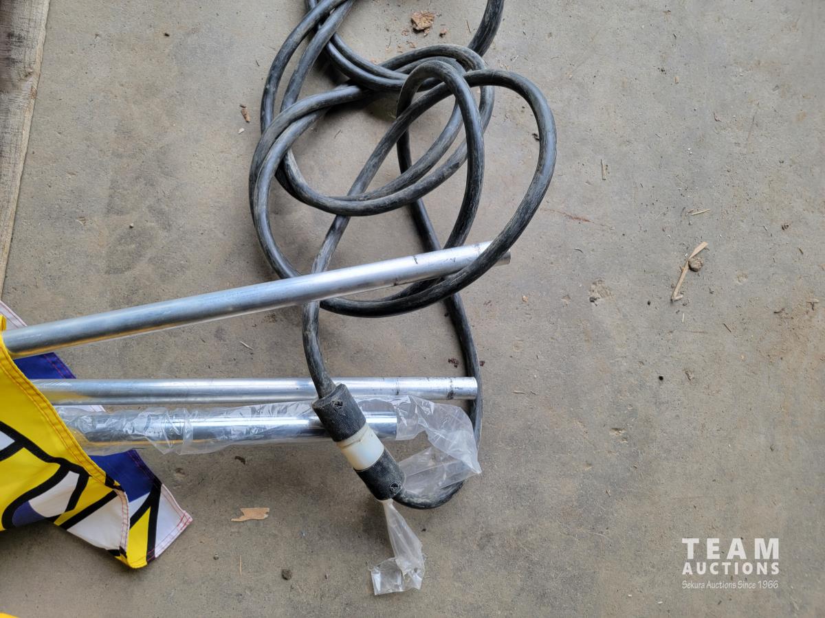 100 ft /200 ft heavy duty extension cord, tarp, tripod, flag, assortment of zip discs and apex pipe