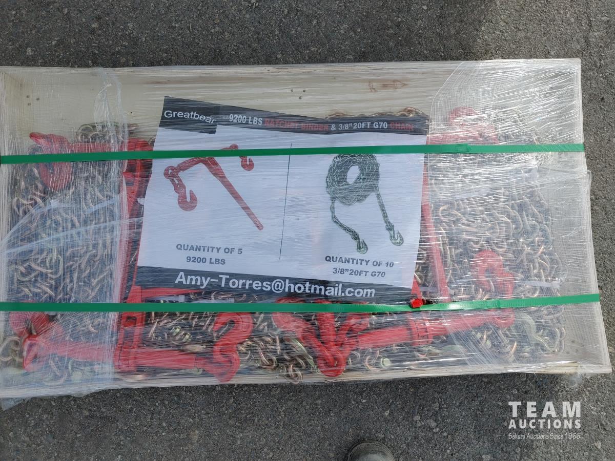 38 2023 Greatbear (10) 3/8 Inch X 20 Ft G70 Chains and (5) 9200 lb Ratchet Load Binders (Unused)