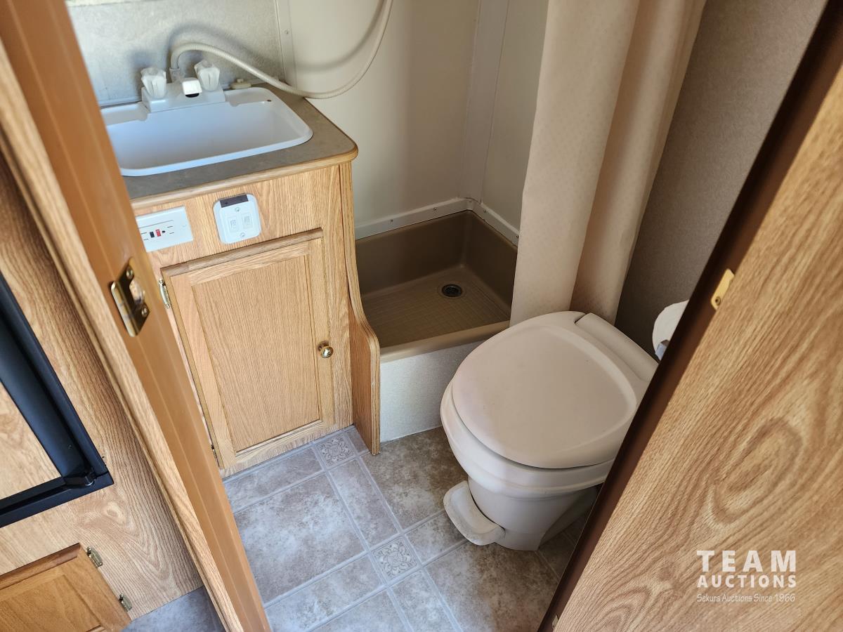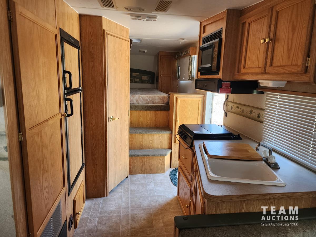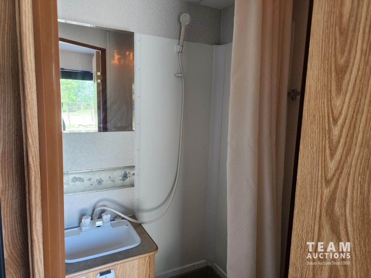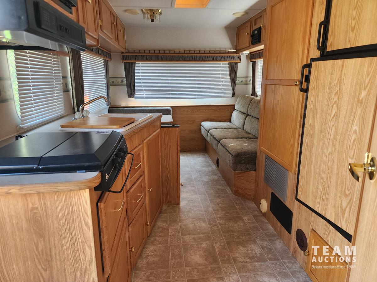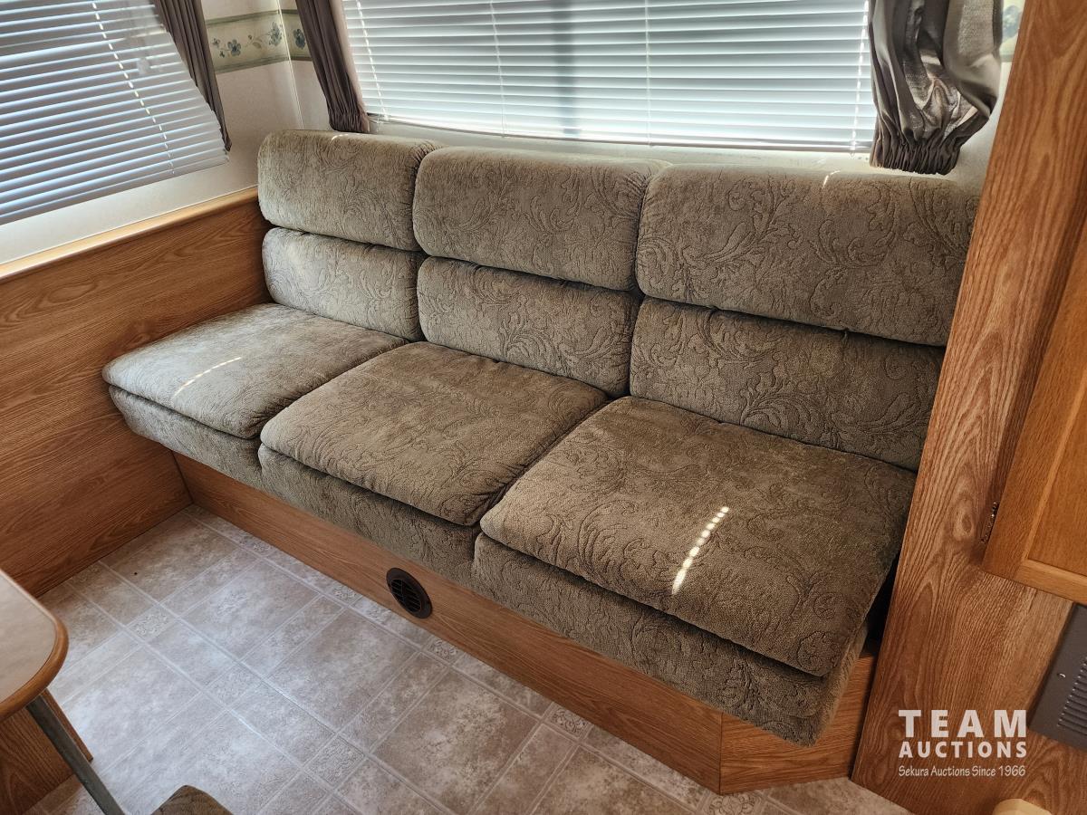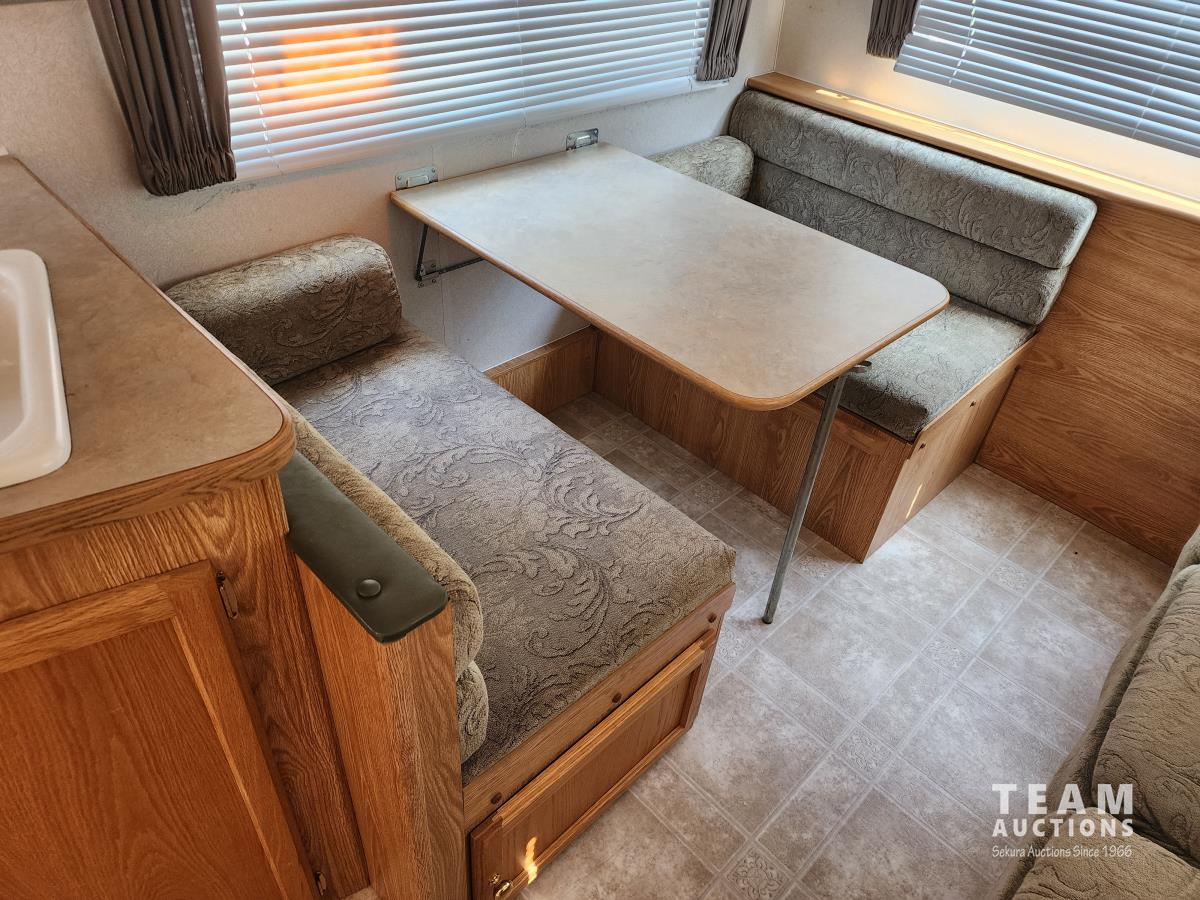 Fridge, stove, microwave, dinette, couch, queen bed, bathroom, A/C, heat, awning, spare tire, 205/75R15 tires