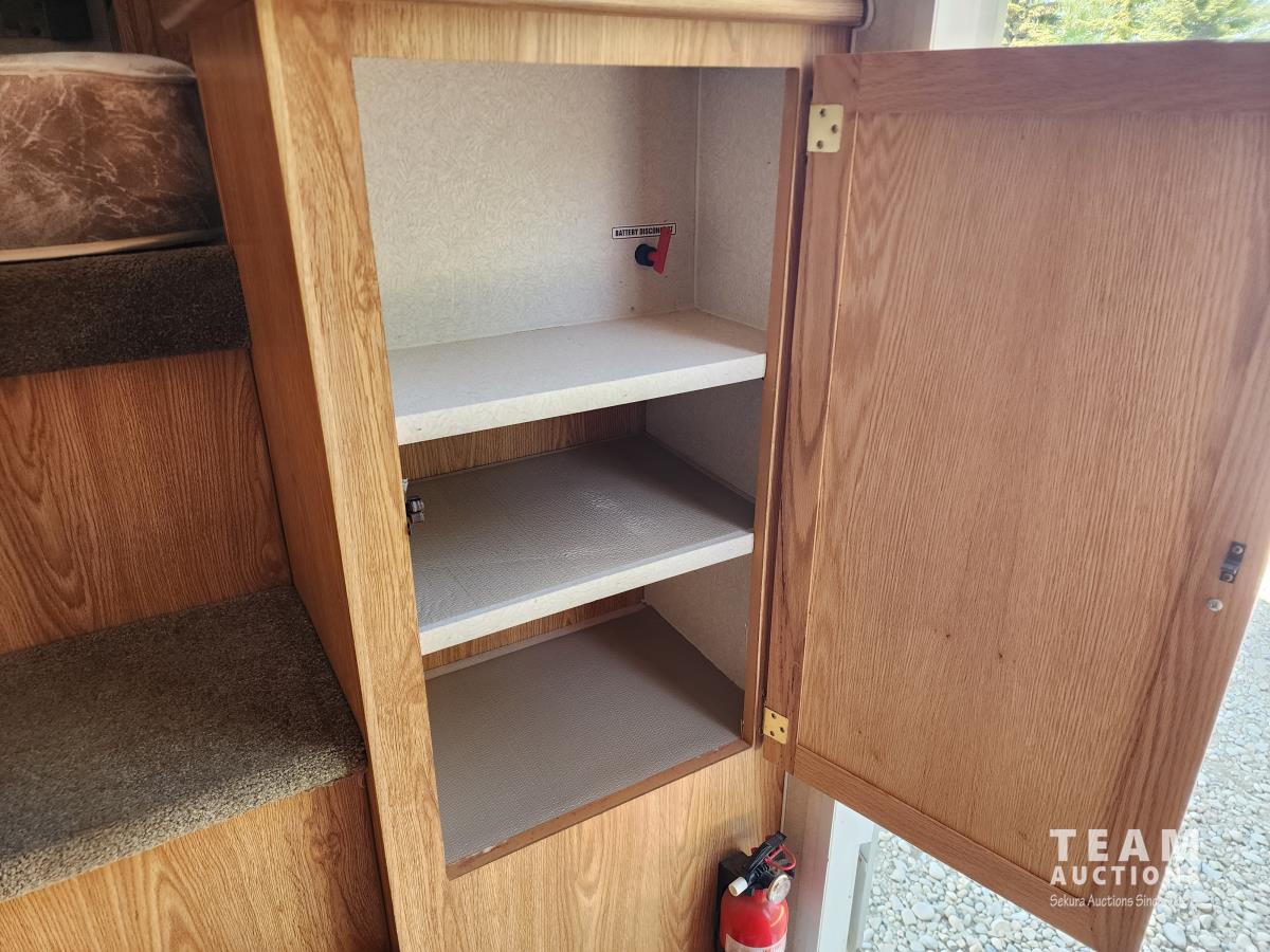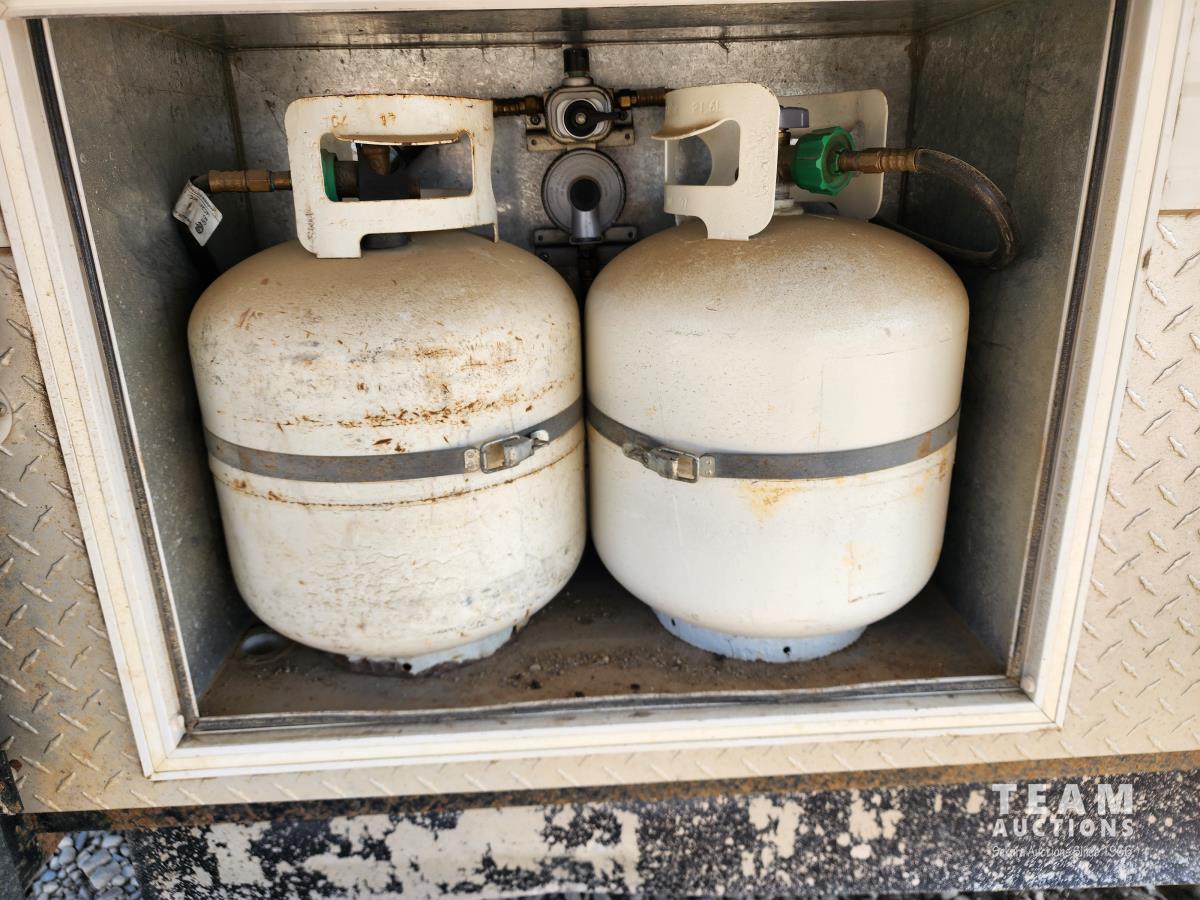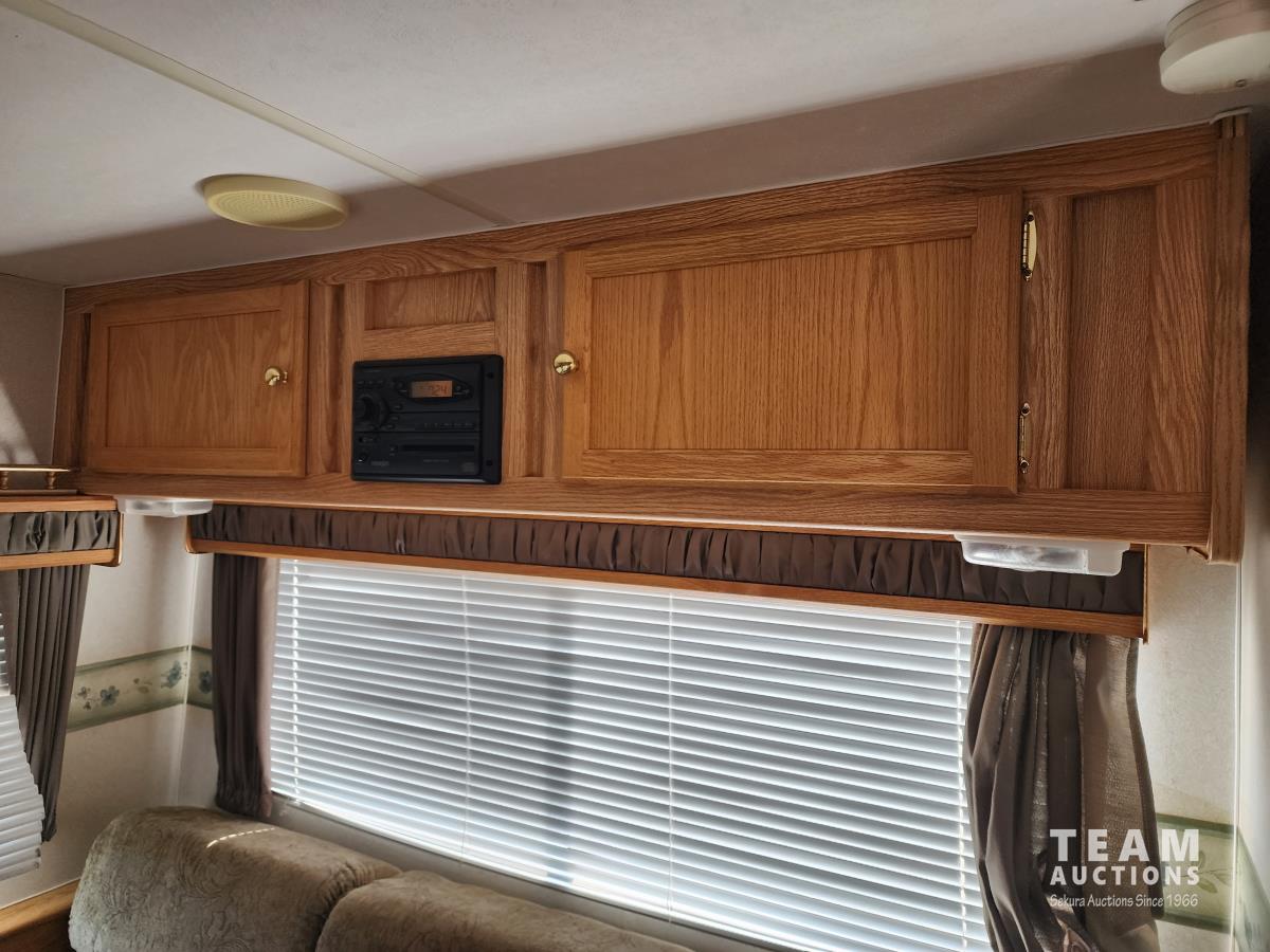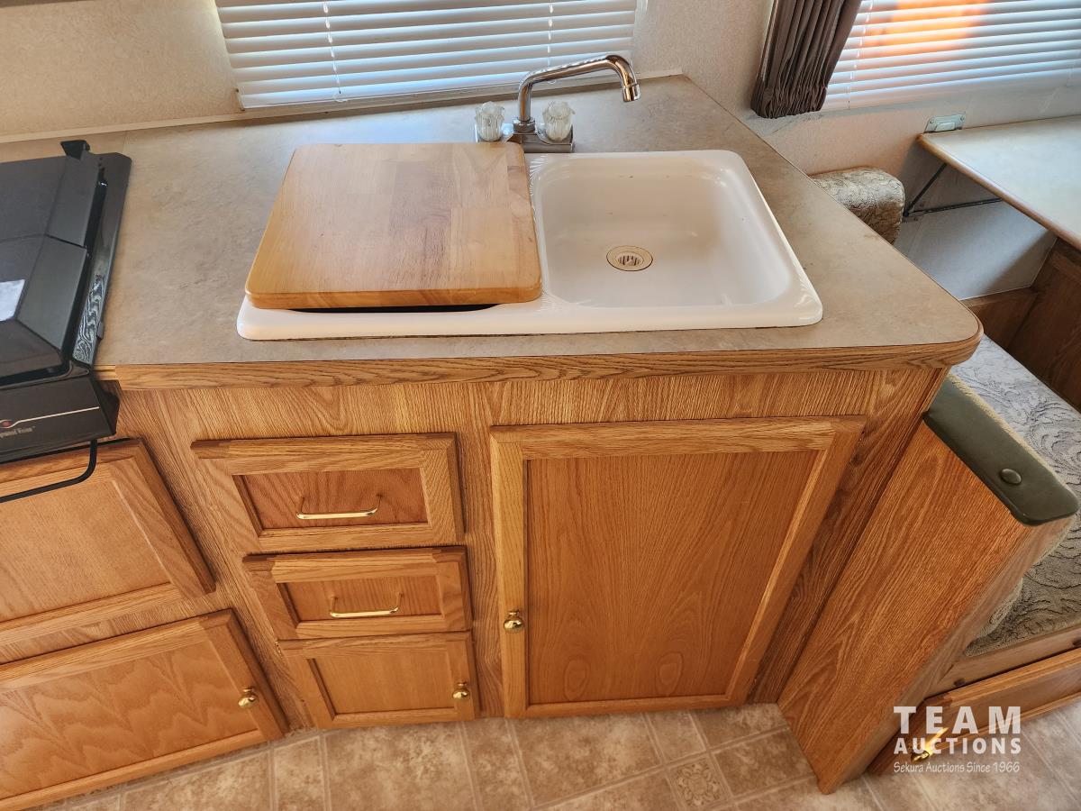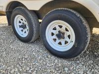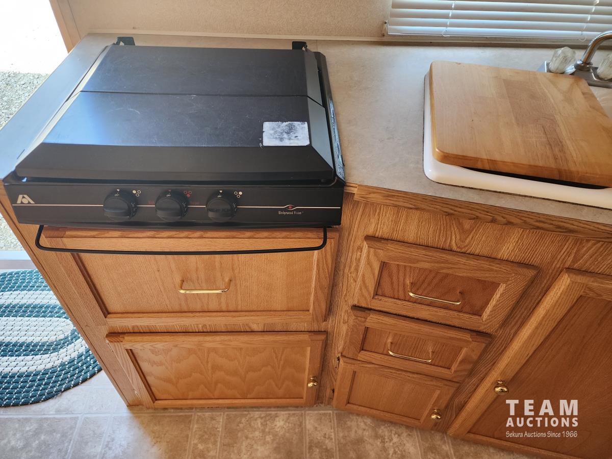 Fridge, stove, microwave, dinette, couch, queen bed, bathroom, A/C, heat, awning, spare tire, 205/75R15 tires