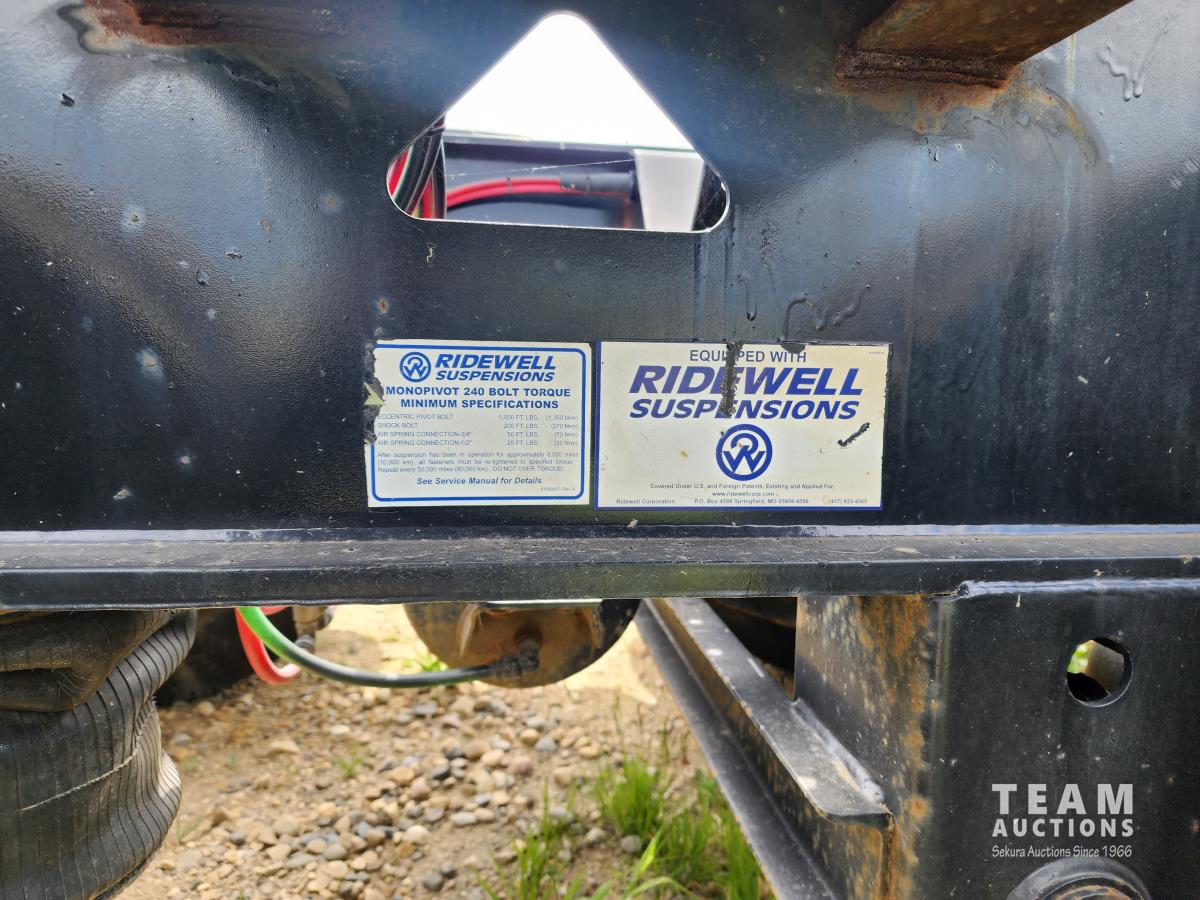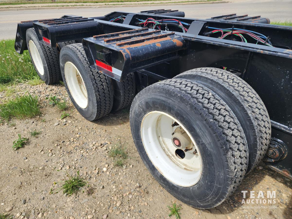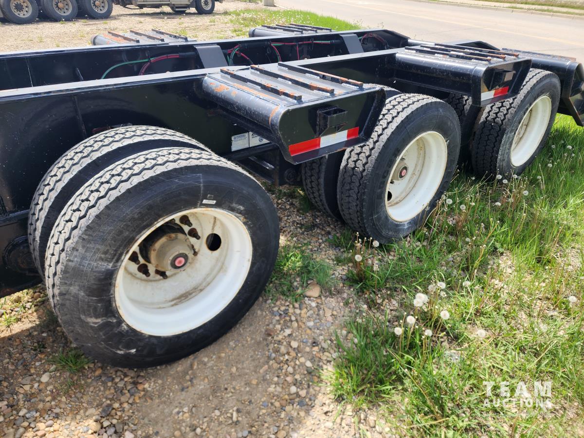 102 inch wide deck, wood deck, 20 ft main deck, beavertail, Tri/Tandem neck with 2 pin position, 2 speed landing gear, front deck shipping container corner locks, front fenders, air ride suspension, 11R22.5 tires