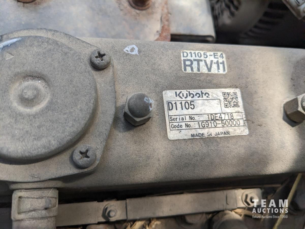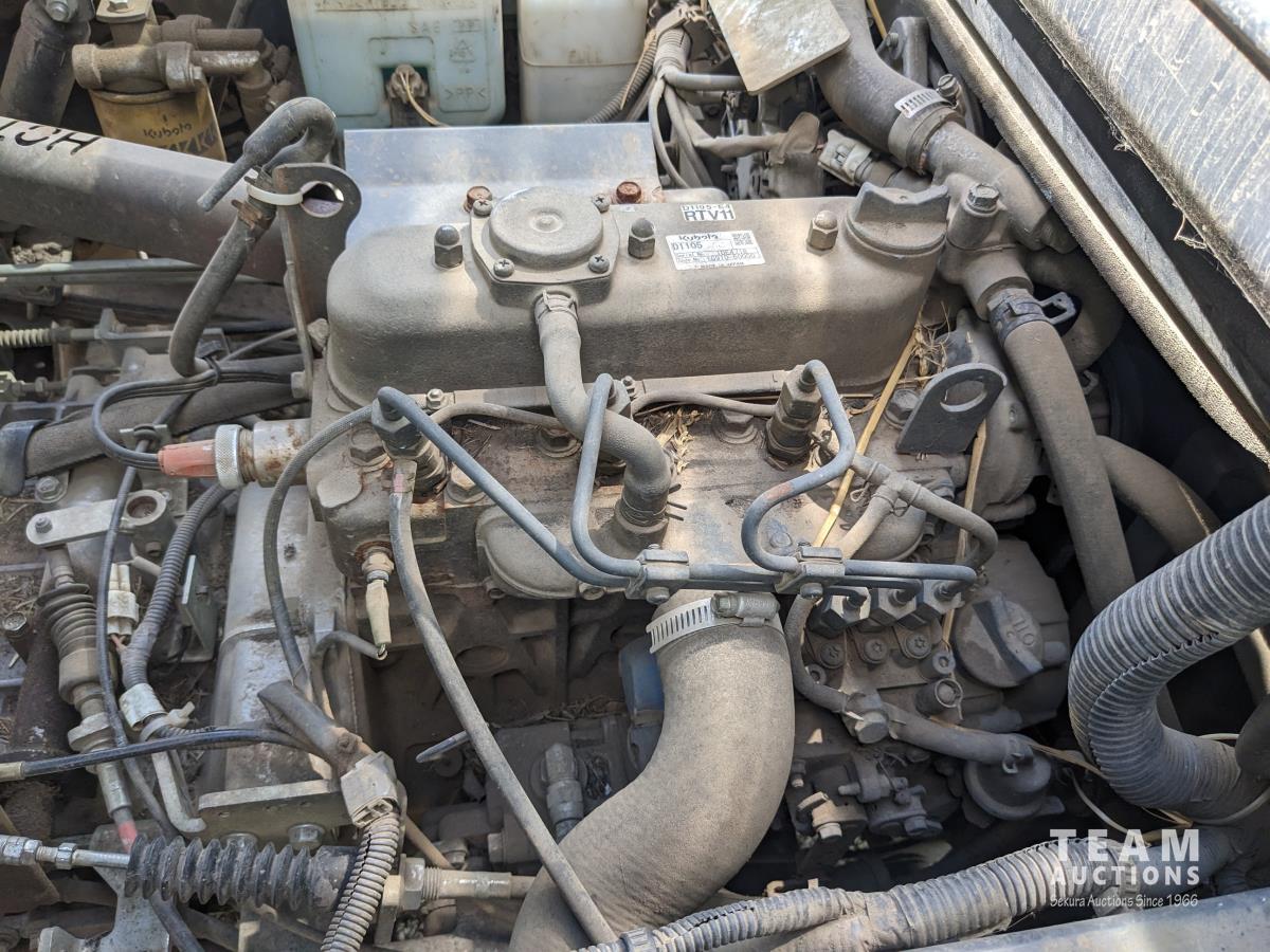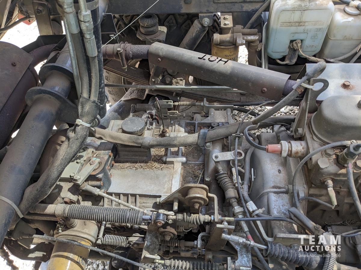 Front winch, Kubota D1105 3 cylinder diesel engine, 3 speed hydro transmission, cab, heat, A/C, radio, power steering, 2WD option, hydraulic dump box, 25X10.00-12 tires