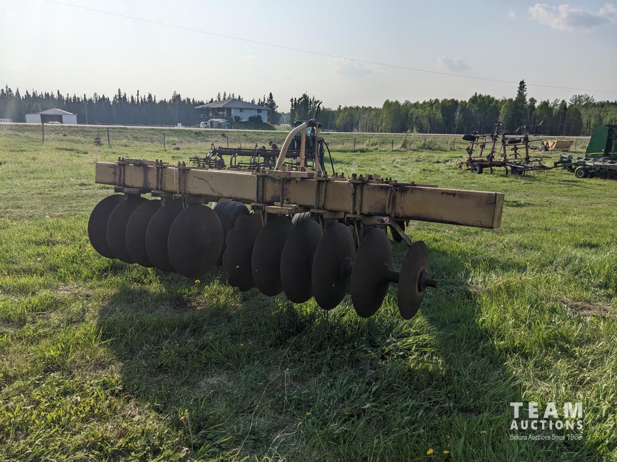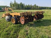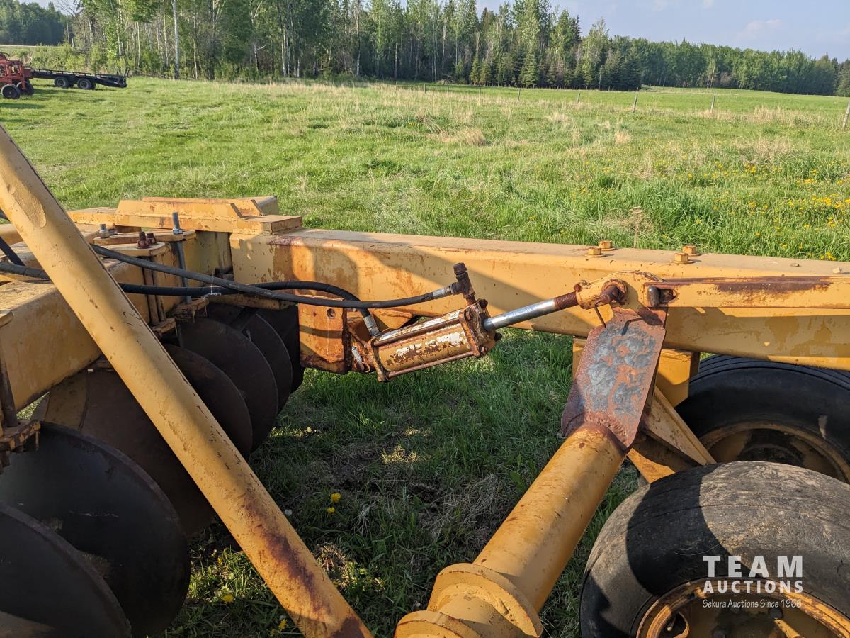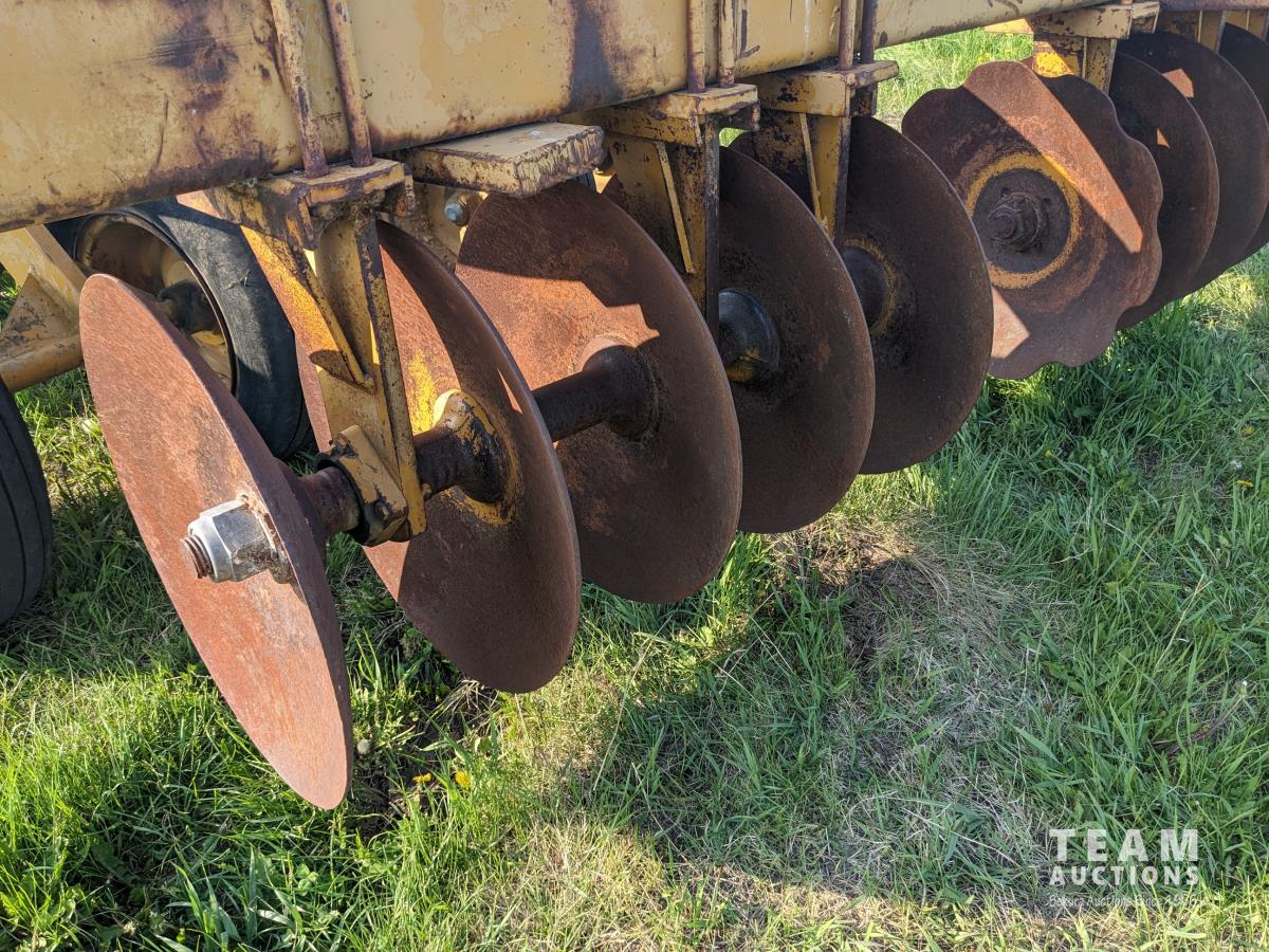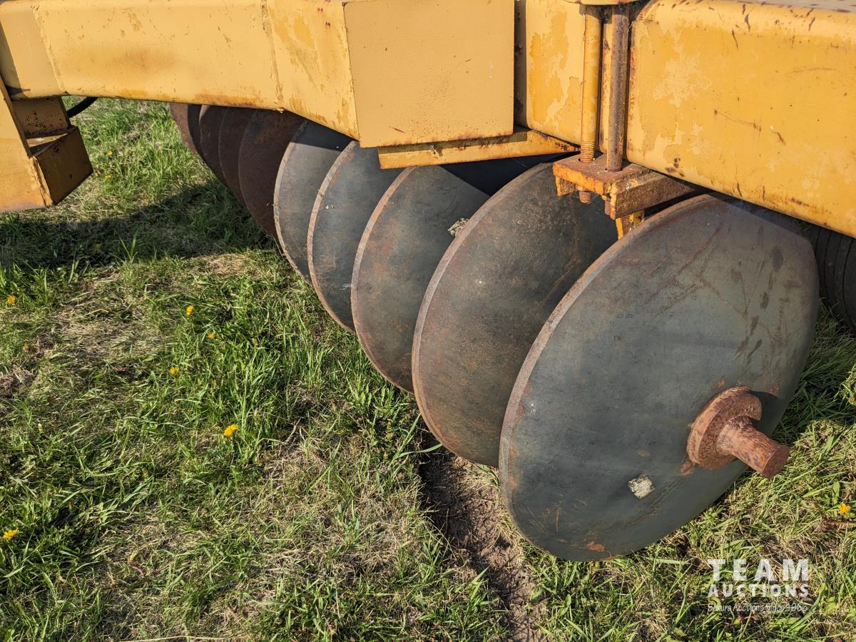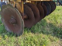 10 inch spacing, half of front gang has new 26 inch disc blades and other half 23.5 inch blades, rear 23 inch disc blades, hydraulic lift cylinder, adjustable gang angle, 11.5-16 duals