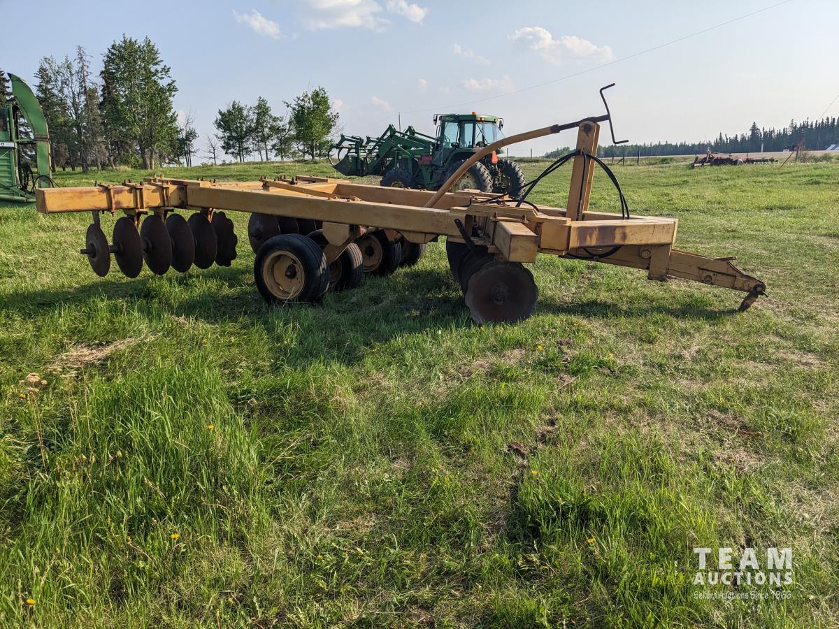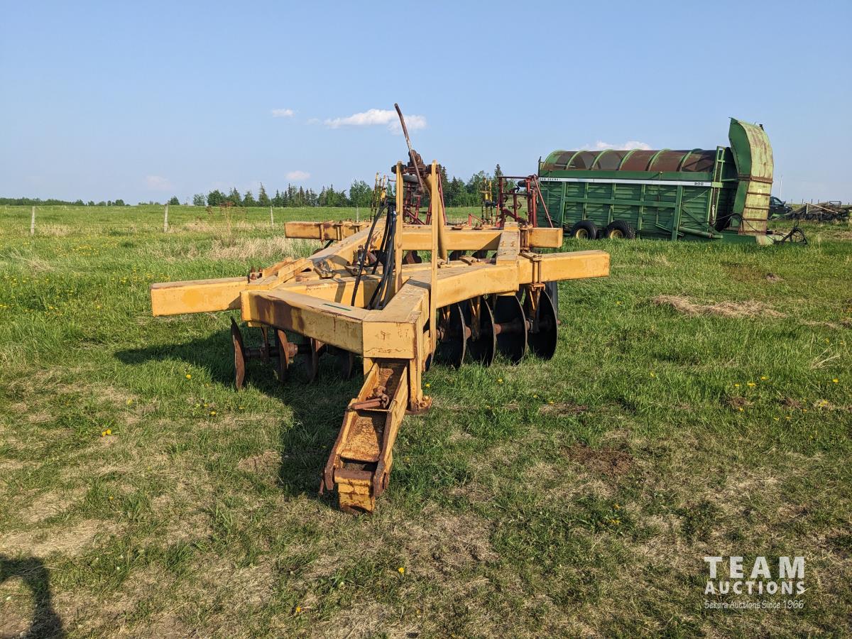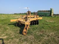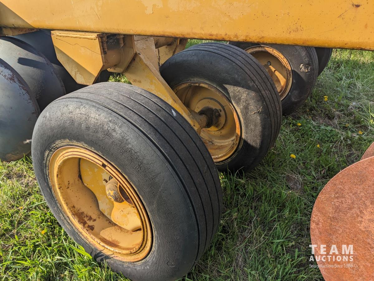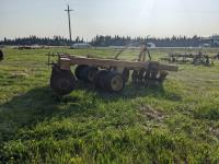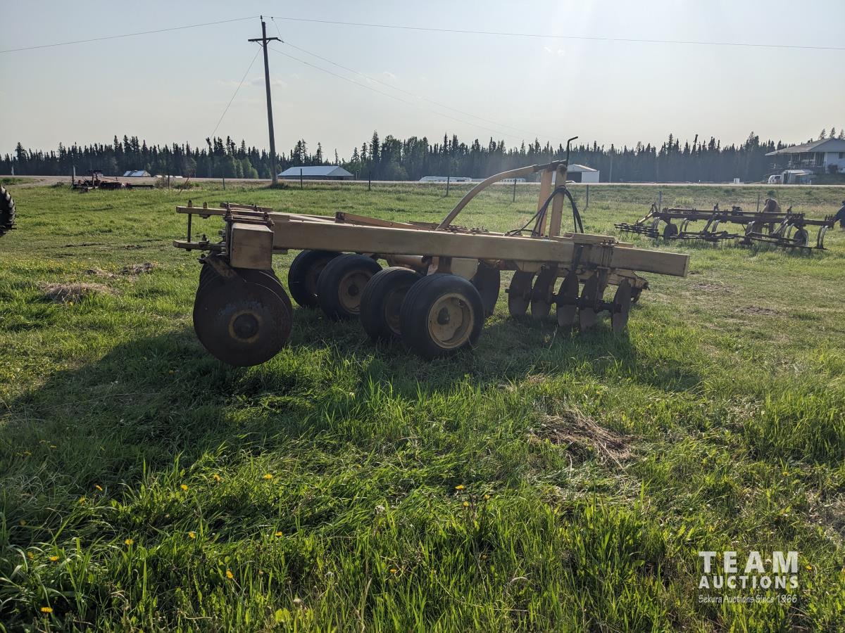 10 inch spacing, half of front gang has new 26 inch disc blades and other half 23.5 inch blades, rear 23 inch disc blades, hydraulic lift cylinder, adjustable gang angle, 11.5-16 duals
