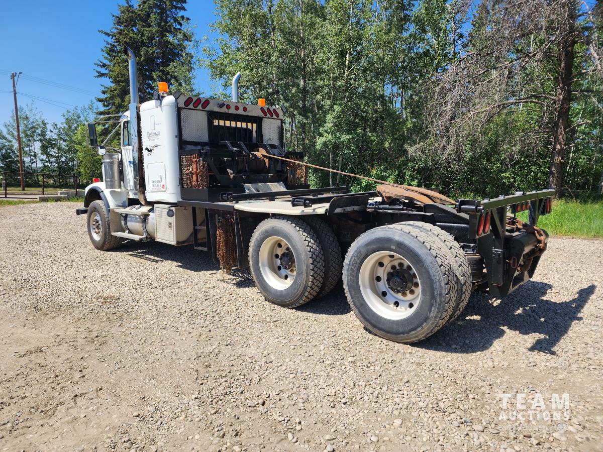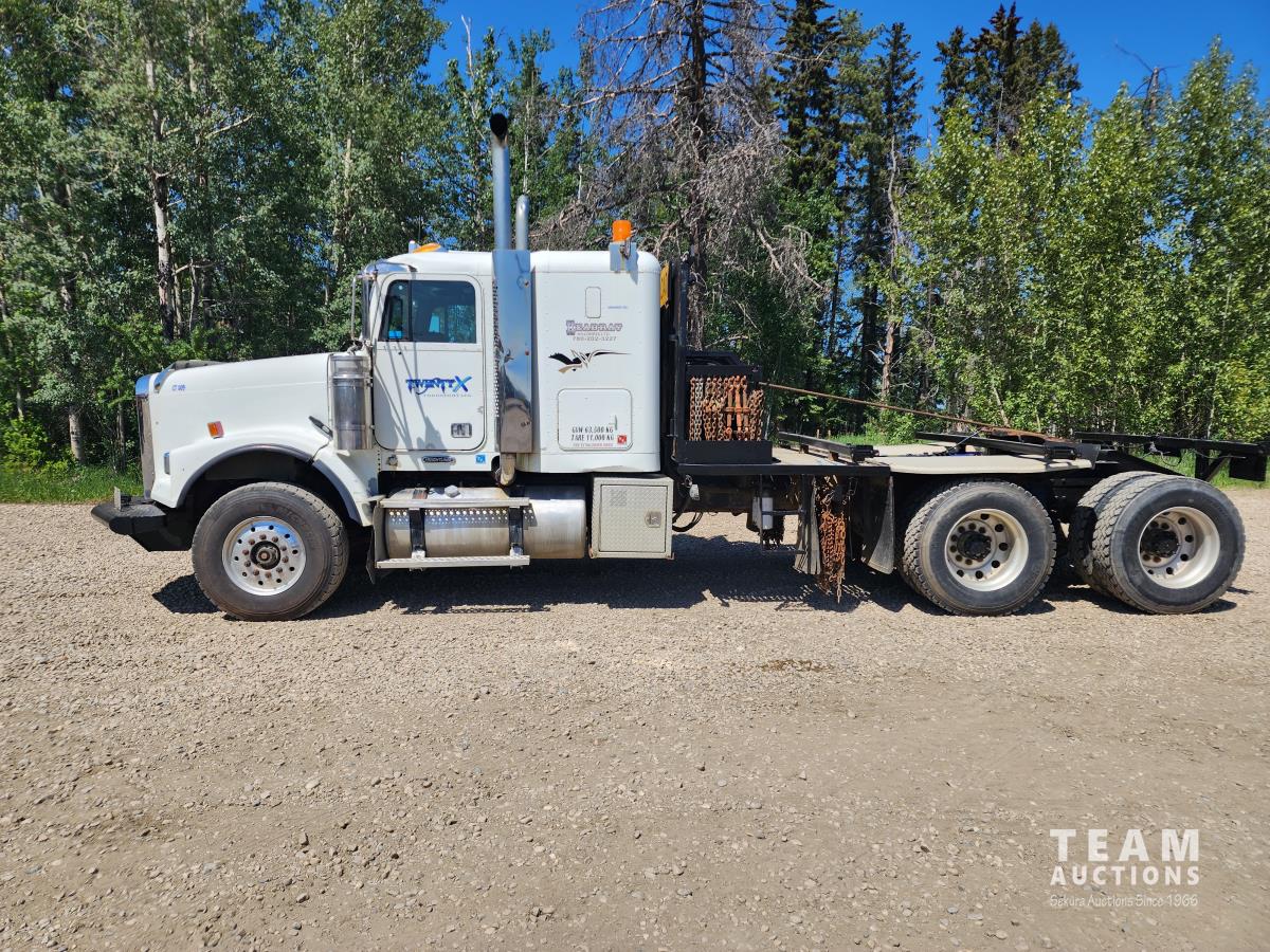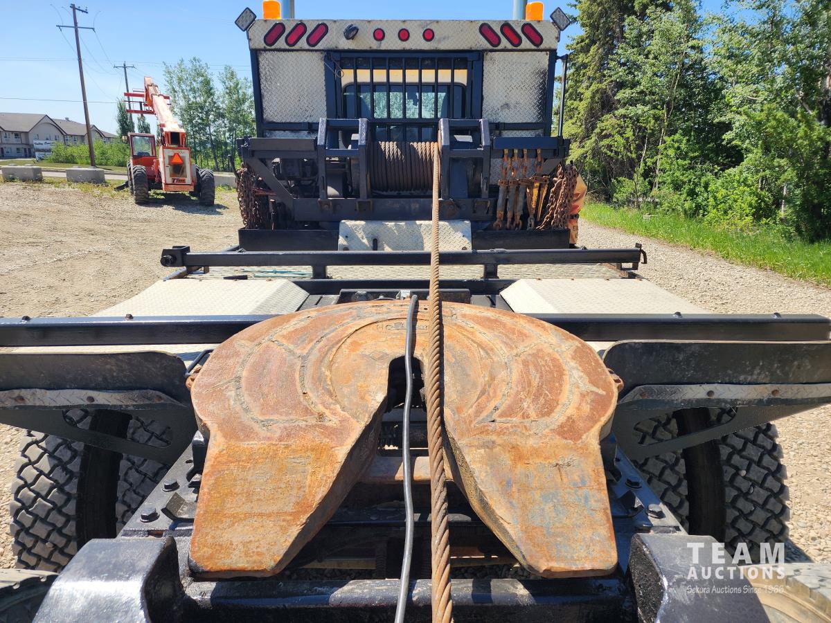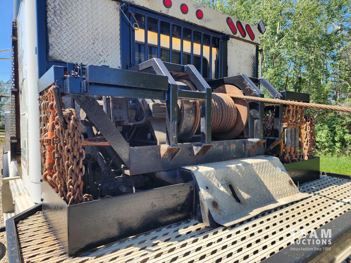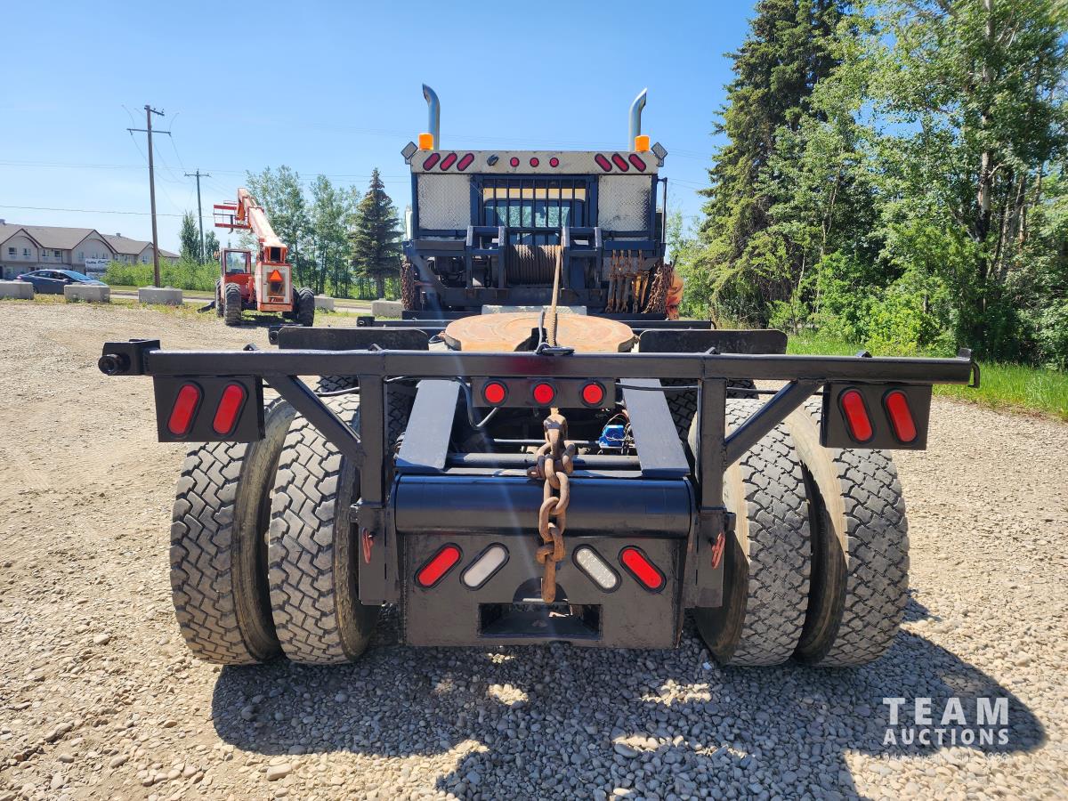 Caterpillar C15 ACERT 550 HP engine, Eaton Fuller 18 speed manual transmission, Webasto cab heater, flat top 42 inch sleeper, A/C, radio, aluminum tool boxes, beacons, chain holders, Roughneck 30 T hydraulic winch, air ride suspension, 14,600 lb front axle, 46,000 lb rear axles, 3 way diff locks, 246 inch WB, all aluminum wheels, 385/65R22.5 front tires, 11R24.5 rear tires