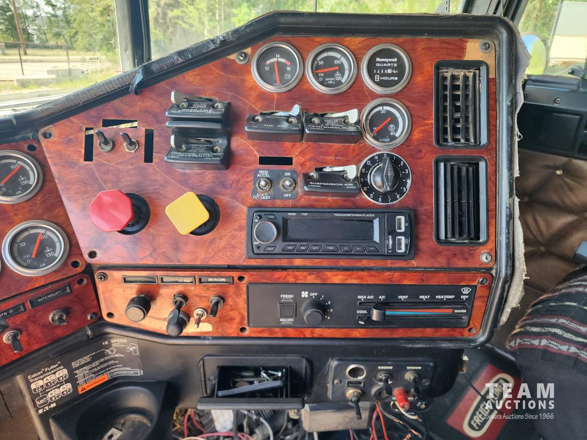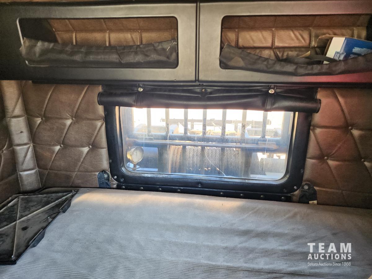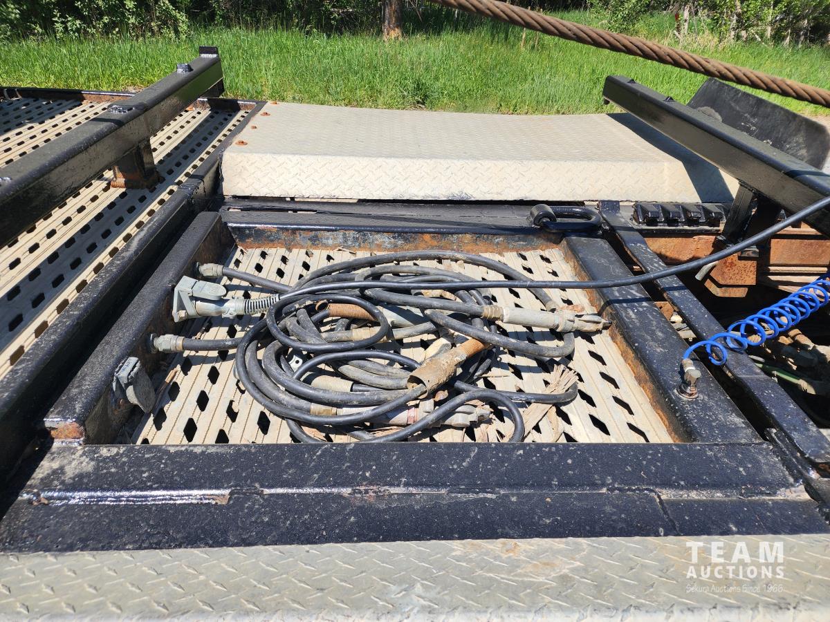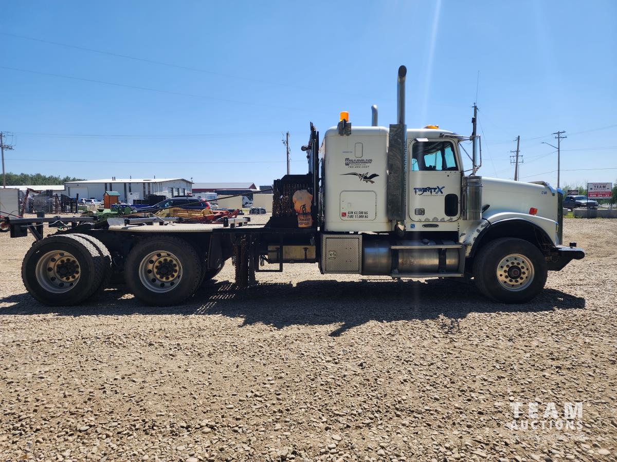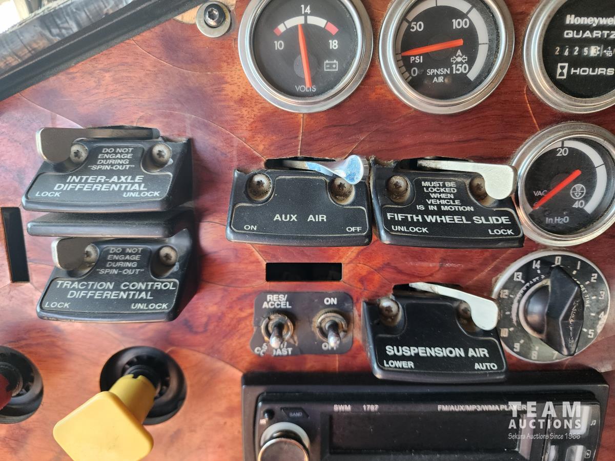 Caterpillar C15 ACERT 550 HP engine, Eaton Fuller 18 speed manual transmission, Webasto cab heater, flat top 42 inch sleeper, A/C, radio, aluminum tool boxes, beacons, chain holders, Roughneck 30 T hydraulic winch, air ride suspension, 14,600 lb front axle, 46,000 lb rear axles, 3 way diff locks, 246 inch WB, all aluminum wheels, 385/65R22.5 front tires, 11R24.5 rear tires