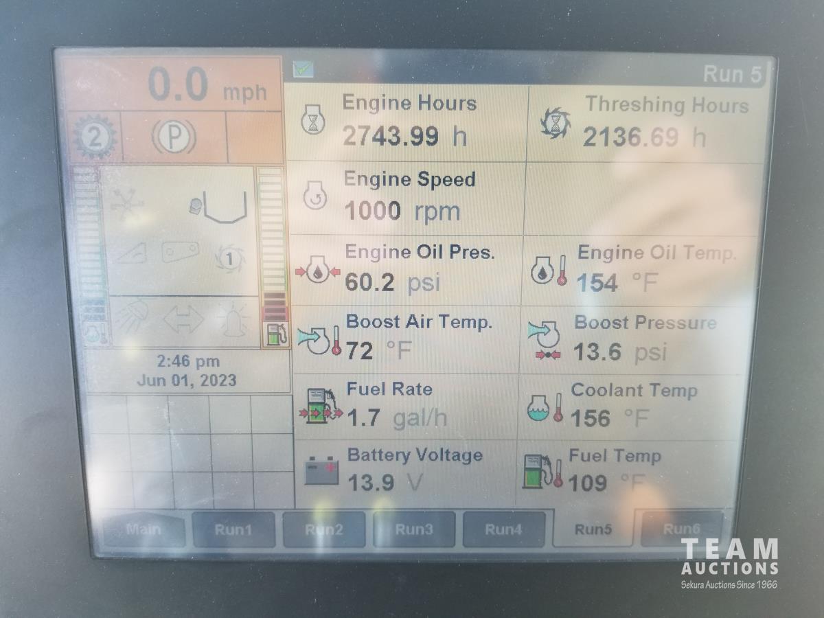 Case IH 2016 13 ft pick-up header, variable speed reel, auto header height, reverser, lateral tilt, rock trap, yield & moisture, chaff spreader, chopper, grain tank extensions, A/C, radio, air ride seat, buddy seat, 520/85R42 front tires, duals, 600/65R28 rear tires