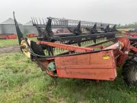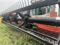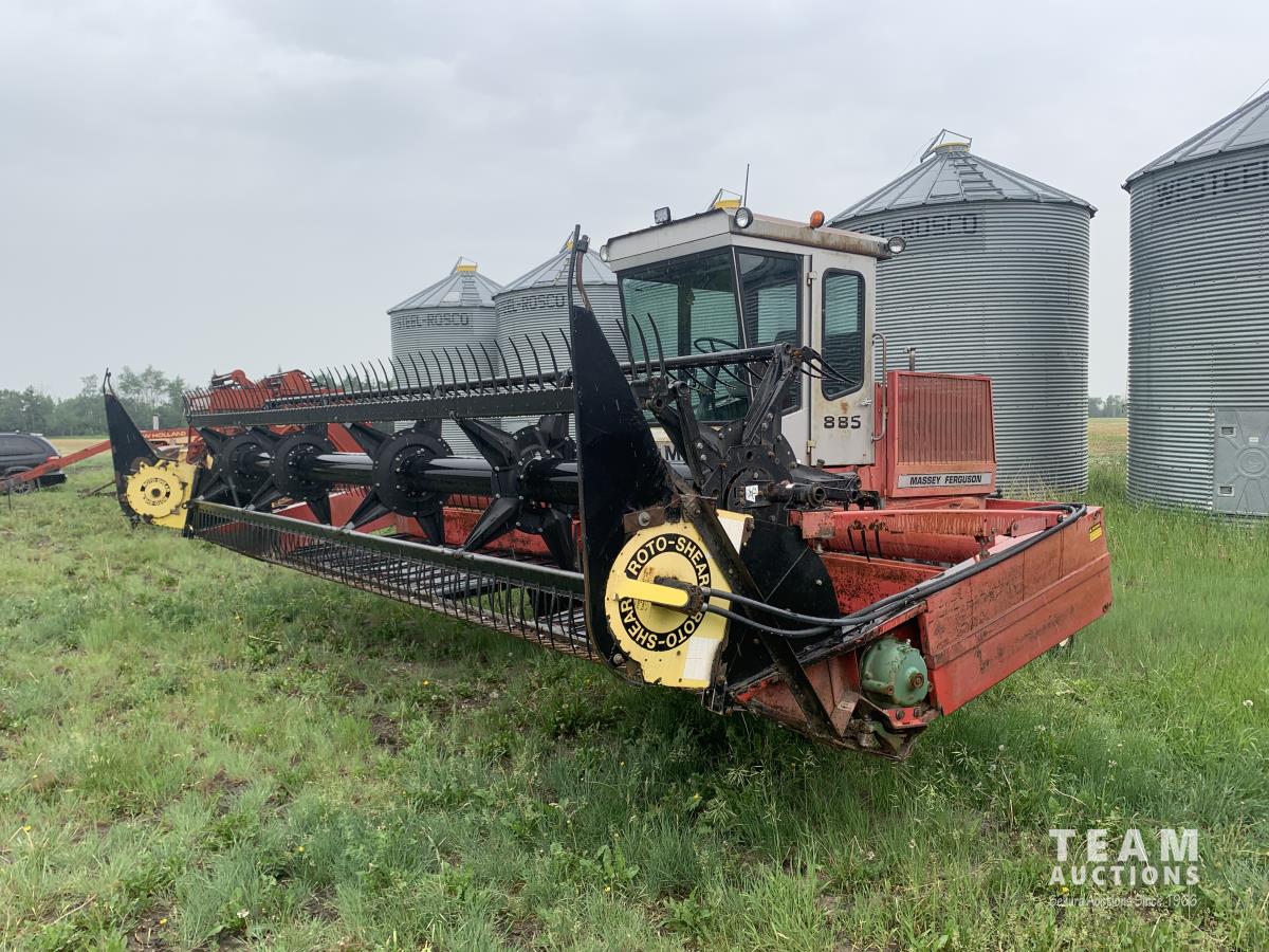 Massy Ferguson 885 21 ft double delivery rigid draper header, pickup reel, variable speed reel, skid plates, Roto shears crop dividers, Canola drum, Chrysler 225 225 cu in 6 cylinder gas engine, A/C, radio, upgraded stereo, Hour clock was replaced at 2100, 18.4-16.1 front tires, 7.60-15 rear tires